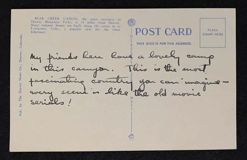VTG Bear Creek Canon, Colorado Photographic Post Card Ancient Fallen Giant Tree N129 Bear Creek Canon, Colorado Published by The Denver News Company Denver, Colorado This listing is for a rather odd looking photographic post card image of what appears to be a fallen or cut down giant tree and stump. Do you see the strange and unusual anomaly? “BEAR CREEK CANON, the main entrance to Denver National Parks, is 15 miles from Denver. Many summer homes are built along the canon in to Evergreen, Colo., a popular spot for the trout fisherman.” This post card is unposted, but believed to be from the 1920s - 1940s. Someone took the time to write the following sentiments: “My friends here have a lovely camp in this canyon. This is the most fascinating country you can imagine - every scene is like the old movie serials!” Note on provenance: This was obtained from a lot or grouping of old photos, papers, art, and other correspondence purchased at Goodwill in 2018 related to Adele Goodman Clark, who was a noted artist and suffragette. The items appear to have been part of the estate of Adeline Harmon Cowles Cox, daughter of Edith Clark Cowles and niece of Adele. They were likely donated by family members some time after Adeline’s death in 1989. Please see the other listings we have up related to Adele and the Goodman Clark family. ~~~~~~~~~~~~~~~~~~~~~~~~~~~~~~~~~ Please see pics for details and overall condition. The “Buy It Now” price is our preferred price, but we are open to offers on most items. Please message us about any questions or concerns before making a purchase. Thanks for looking and supporting our small business. We are blessed to be working from home, with the best coworkers we could ever ask for, each other! ❤️With love and blessings, (-: Dee & Chi :-)