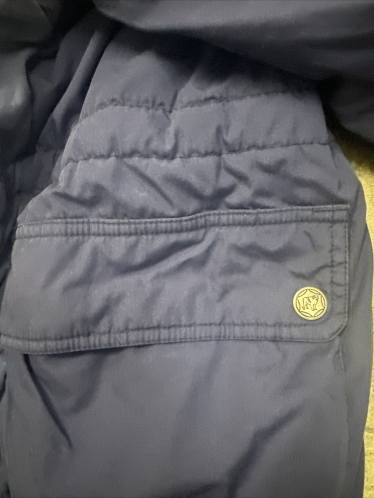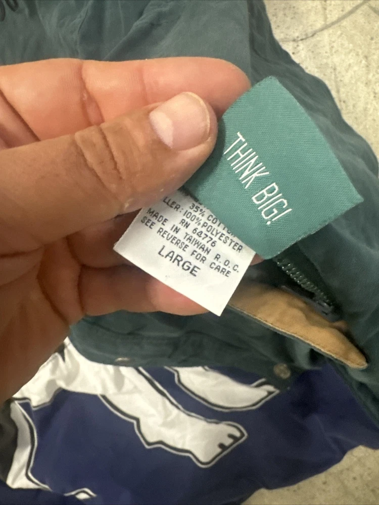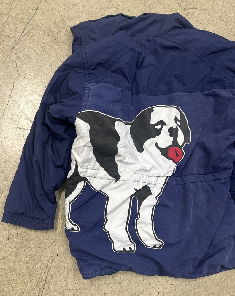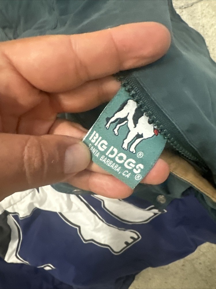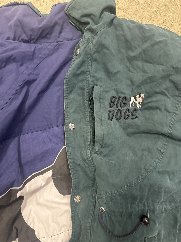The VTG Big Dogs Jacket in size L is a stylish and reversible puffer jacket perfect for casual occasions during the winter and fall seasons. Made from a soft cotton blend outer shell and polyester lining, this jacket features a stand-up collar and a mid-length cut. The graphic print of big dogs adds a playful and nostalgic touch, making it a vintage-inspired piece that is sure to stand out. With a zip and button closure, this jacket is both functional and fashionable, ideal for men who love animals and retro styles.