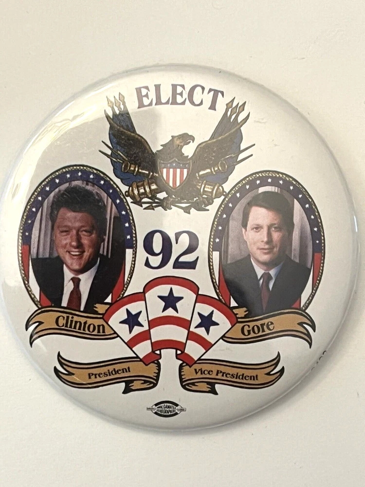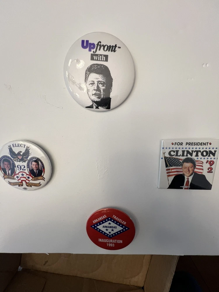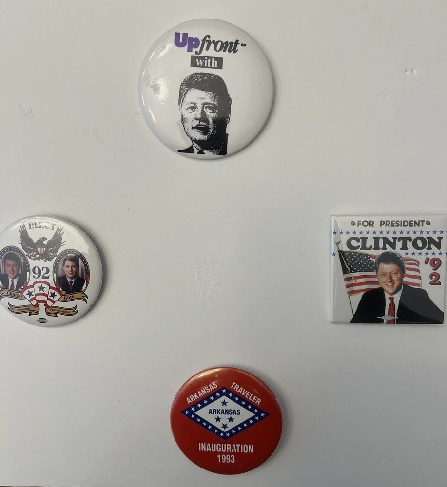 Capture a piece of political history with these vintage Bill Clinton campaign buttons. Dating back to his 1992 presidential run, these four large buttons, each measuring between 2 to 2.5 inches, are emblematic of the era's political spirit. Made in the United States, they reflect the country's stance on political campaigns during the early '90s. Ideal for collectors and enthusiasts of political memorabilia, these buttons stand as a testament to Clinton's influential presidency. Whether you're a fan or a historian, these pins serve as a unique addition to any collection, preserving the legacy of one of America's most notable political figures.