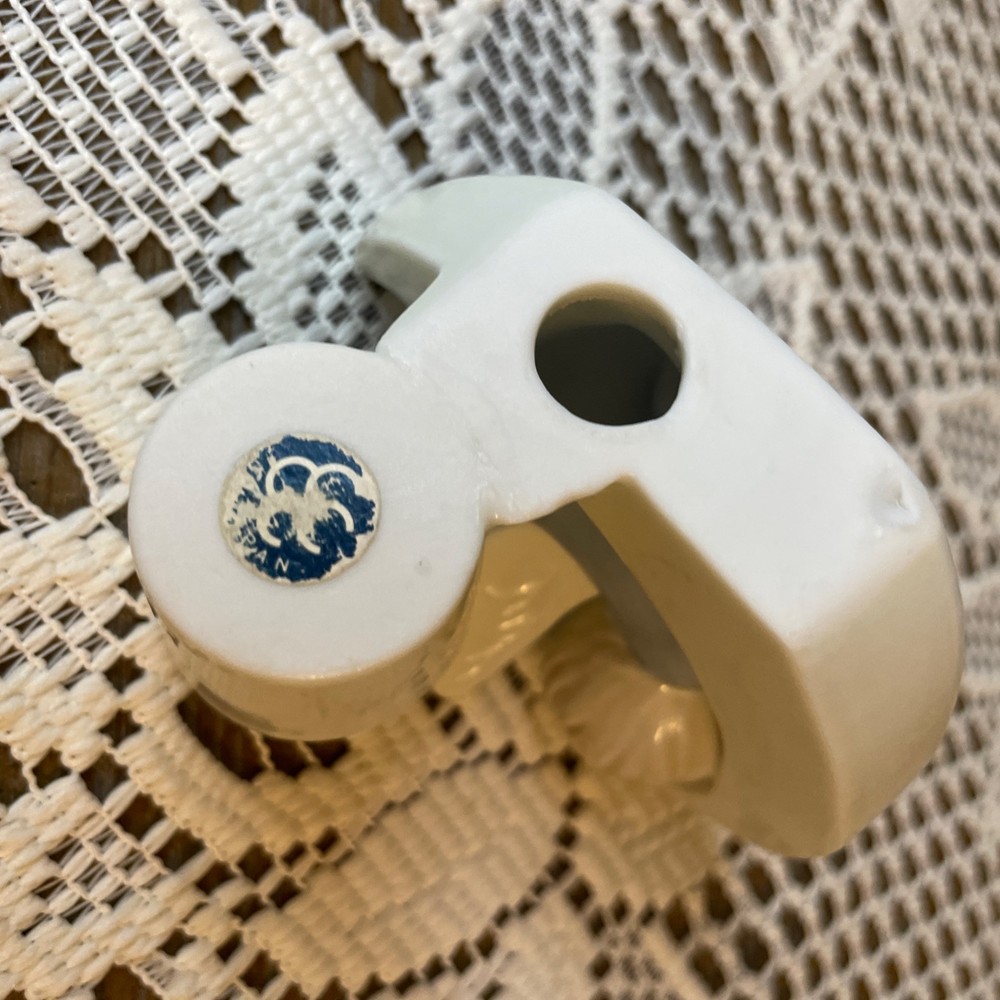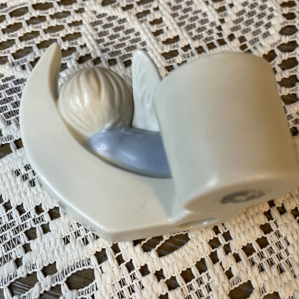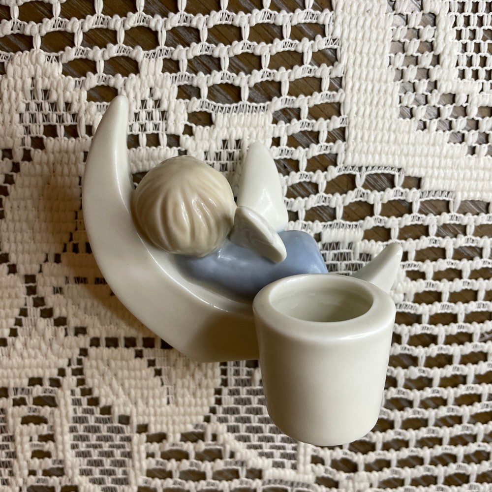 A vintage Colonial CCCC Baby Angel On Moon Taper Candle Holder from Japan in baby blue and white porcelain. This small candle holder features a baby on a moon design and is smooth in finish. It is designed in a Colonial style and is perfect for a baby shower or as a decorative piece for boys, adults, or unisex baby and toddler rooms. The brand is Colonial Of Cape Cod (CCCC) and it is a unique collectible item.