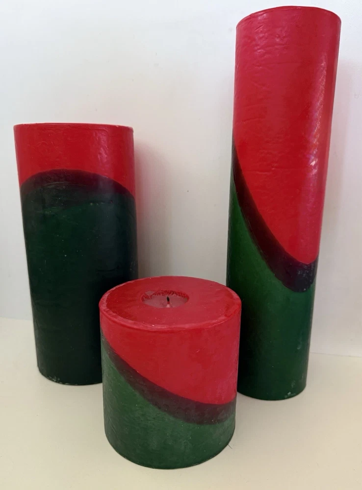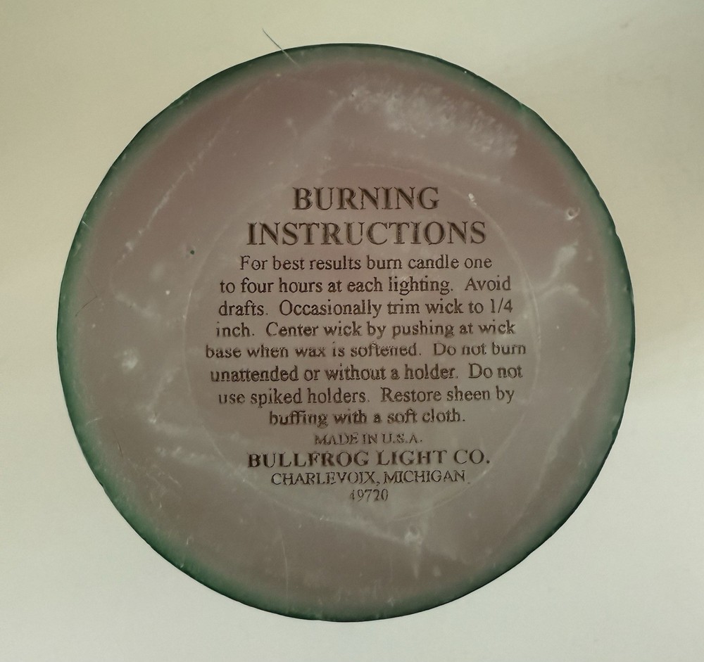 Vintage pillar candle from Bullfrog Light Co. Charlevoix MI. The vibrant red & green swirl design and make it the perfect addition to any room. Made from high-quality wax and crafted by hand, this medium-sized 4” candle emits a warm glow that will brighten up your space. The unscented candle is perfect for those who prefer a subtle and relaxing atmosphere. It has been burned once. In very good condition, no wrapping. Refer to photos. I’m listing two taller & larger of this same design. I can combine shipping if you’re interested in more than one. Please request an invoice before payment is made if purchasing more than one so I can adjust the postage. Thank you. You can see them all in the last photo. This listing is ONLY for the 4” candle.