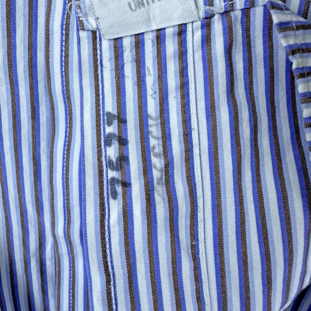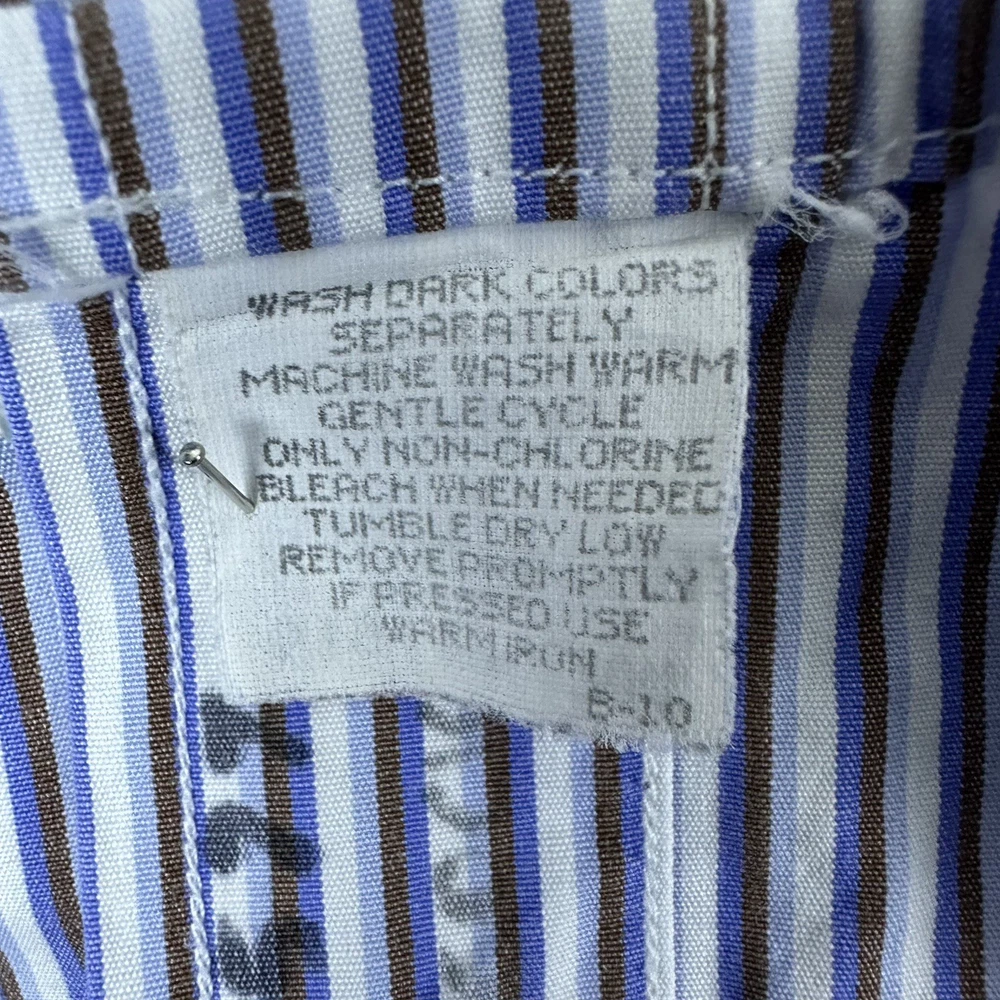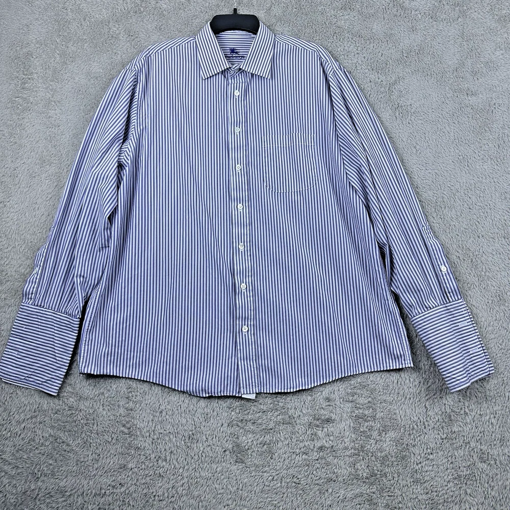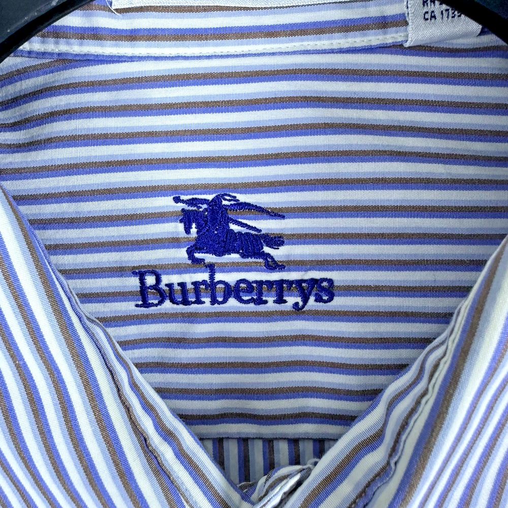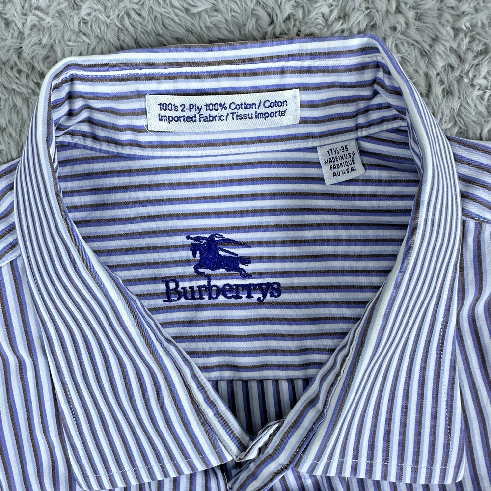 Classic heritage vintage Burberrys dress shirt in crisp blue and brown vertical stripes. Features the iconic equestrian knight logo embroidery, full button front, and single chest pocket. Crafted from 100% 2-ply cotton for a smooth, refined hand-feel and timeless tailoring appeal. Vintage verified based on “Burberrys” tag and Made in USA marking, placing production in the pre-1999 era before the rebrand to Burberry. A true collectible for enthusiasts of British design and old-world craftsmanship. Preowned – Good. Fabric maintains structure, sheen, and full color vibrancy. Interior shows minor handwritten numbers near inner hem — non-visible in wear, does not affect appearance. Colors may vary slightly due to lighting. Measurements (inches): Pit to Pit – 24.5” Length (Shoulder to Hem) – 30” Sleeve – 34” All measurements are approximate. See photos. Another Simply1Awesome find — packed with love, shipped fast, and always backed by friendly service. Questions welcome anytime! #Burberrys #VintageMenswear #ClassicStyle #StripeShirt #BritishDesign Vintage, Tailored, Heritage
