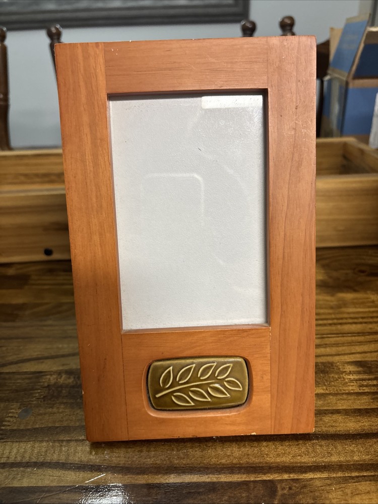 This vintage Burnes of Boston Rare Woods picture frame features an ornate Art Deco style with a ceramic tile insert, suitable for a 4x6 inch photo. Handmade from wood with a brown finish, it has an adjustable viewing angle and can be displayed vertically. The frame also includes intricate foliage patterns and clear glass. This item was manufactured in 2000 in Thailand as part of the Rare Woods 2000 collection.