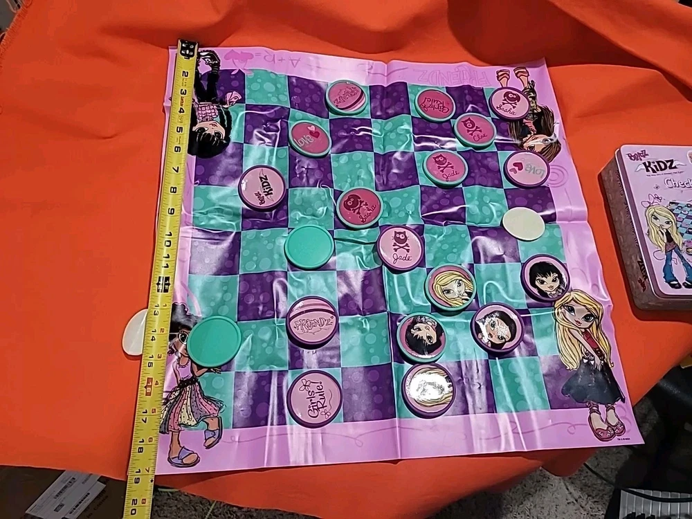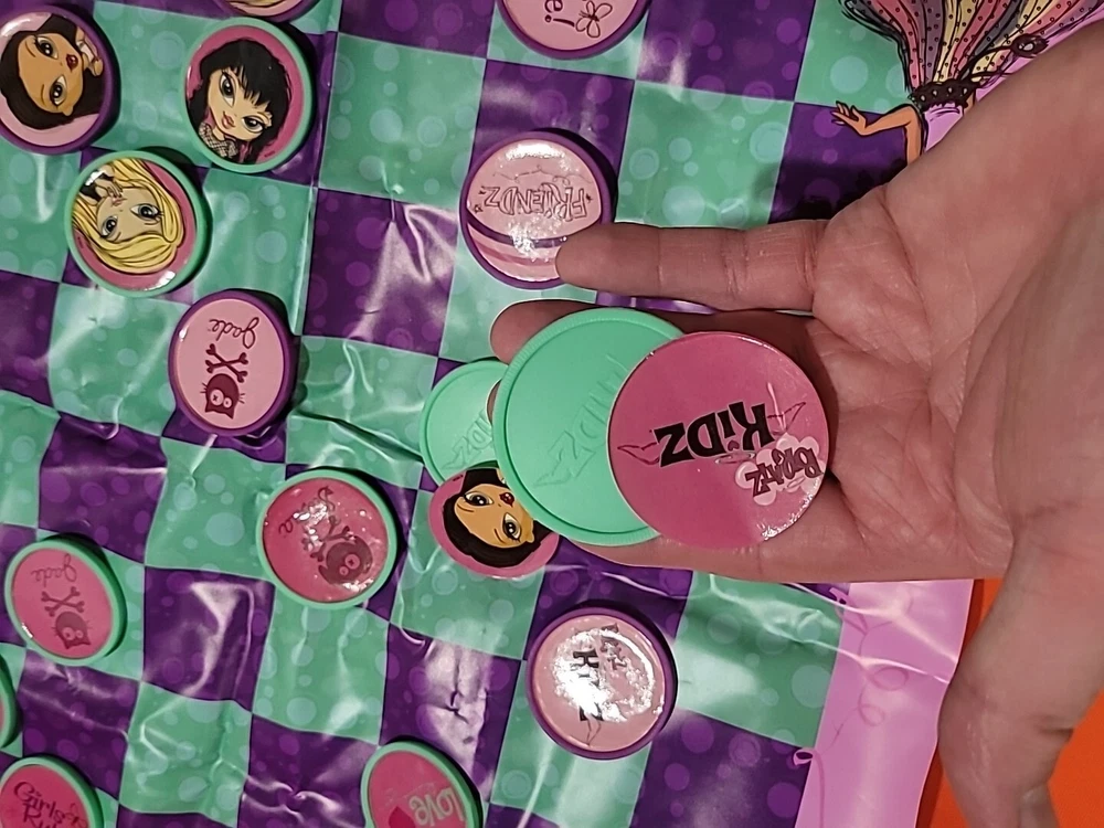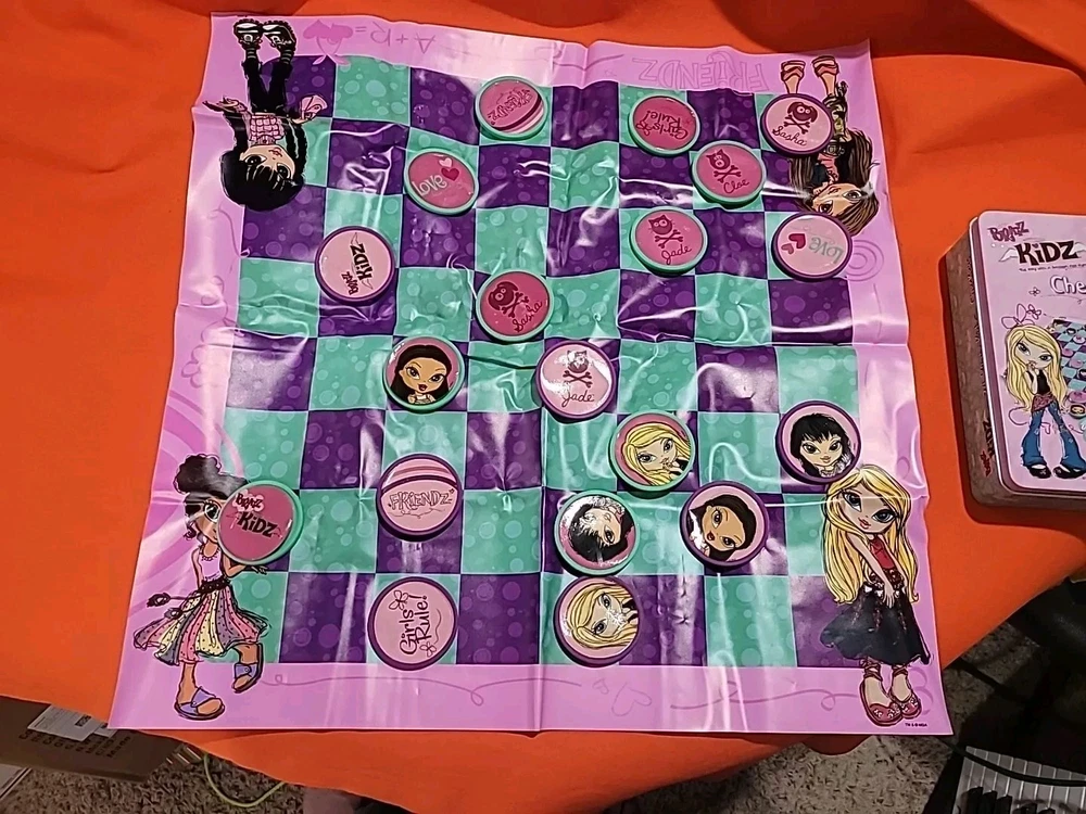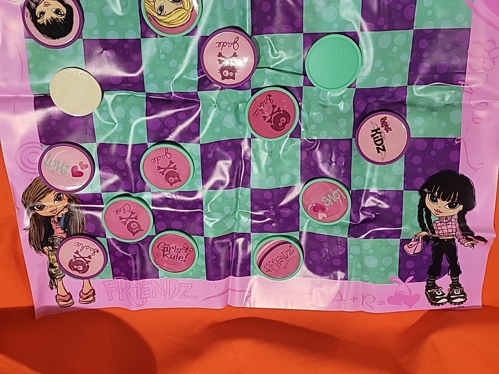 This vintage collectible Bratz Kidz Checkers game is a must-have for any fan of the popular toy franchise. It comes complete with a matching tin case The game is perfect for family game night and can be played by boys and girls alike. The game is easy to learn and offers hours of fun for players of all ages. The checkers are colorful and feature the beloved Bratz characters. This item is a rare find and would make a great addition to any collection. Don't miss your chance to own this classic game from MGA Entertainment. Game has ten green and nine purple Checkers missing some Checkers stickers on some need reglued other than that it's in great shape Thanks for looking