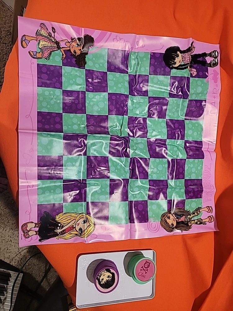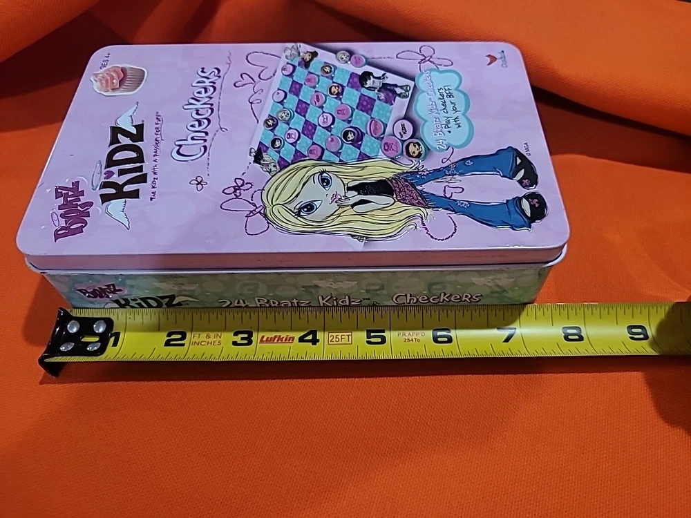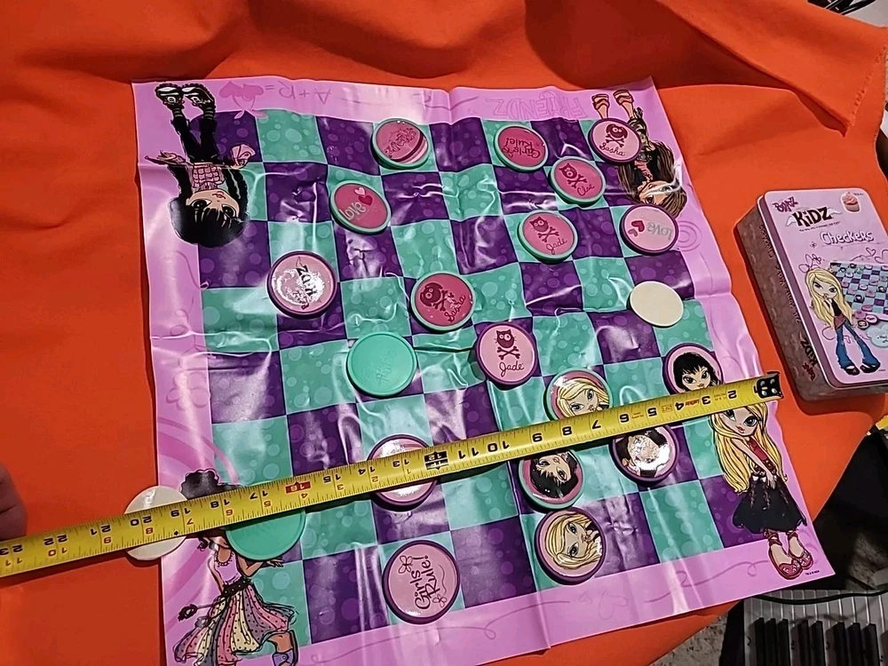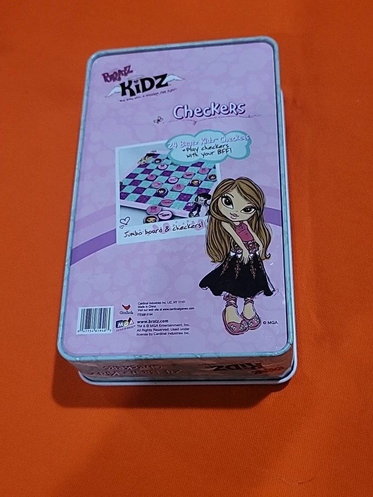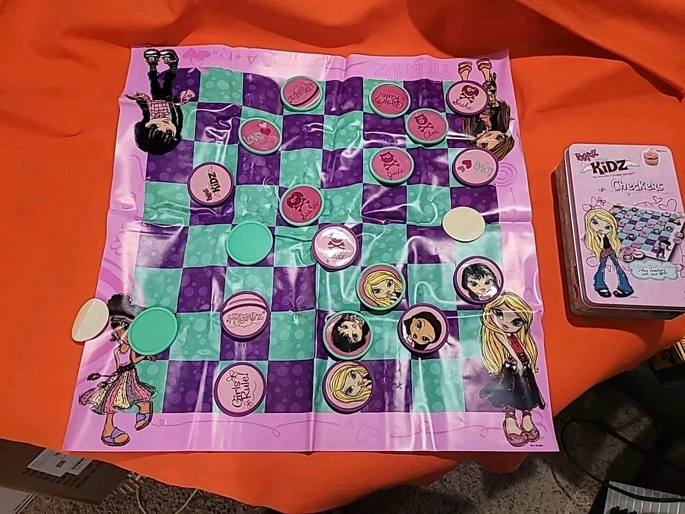 This vintage collectible Bratz Kidz Checkers game is a must-have for any fan of the popular toy franchise. It comes complete with a matching tin case The game is perfect for family game night and can be played by boys and girls alike. The game is easy to learn and offers hours of fun for players of all ages. The checkers are colorful and feature the beloved Bratz characters. This item is a rare find and would make a great addition to any collection. Don't miss your chance to own this classic game from MGA Entertainment. Game has ten green and nine purple Checkers missing some Checkers stickers on some need reglued other than that it's in great shape Thanks for looking