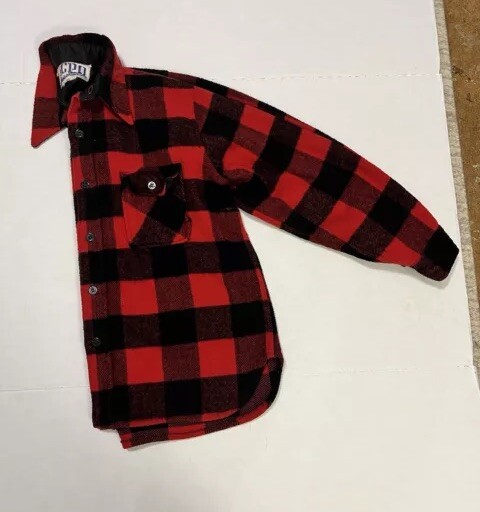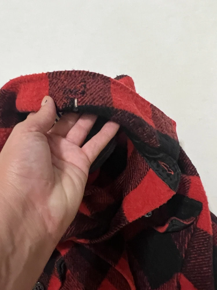 The care, size and material tag has been removed. This is a thick material like wool or wool blend. In good condition with a hole on the collar as pictured. Pit to pit: 24โ Length: 26โ Please see photos. FOLLOW FOR MORE ๐