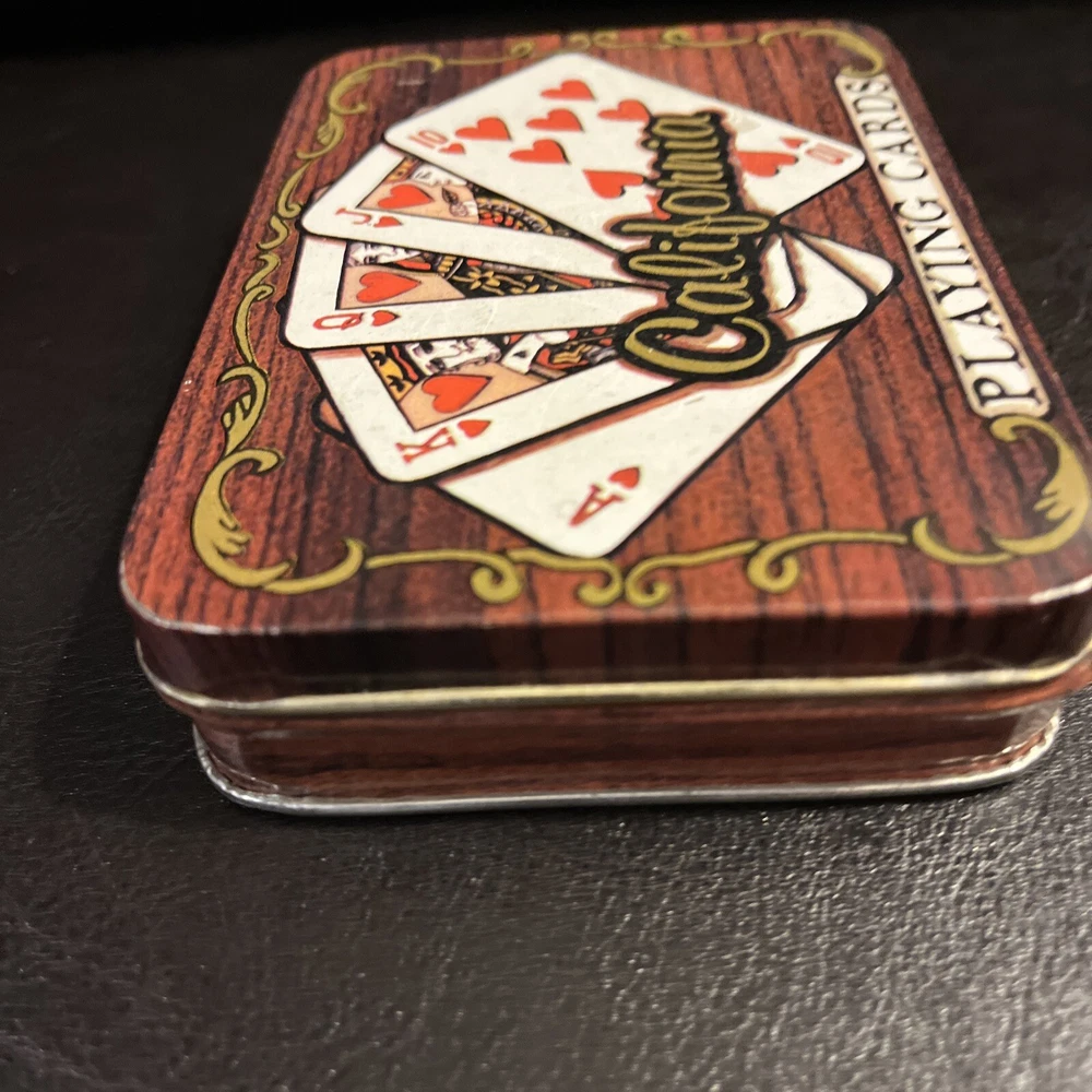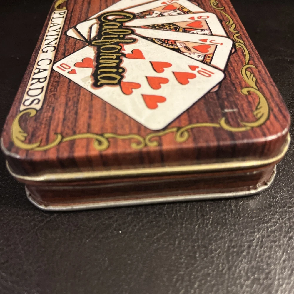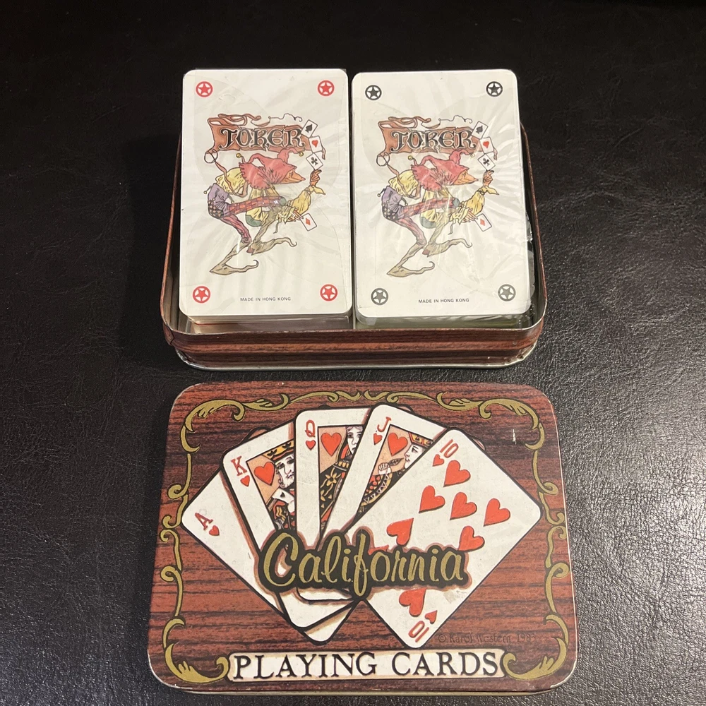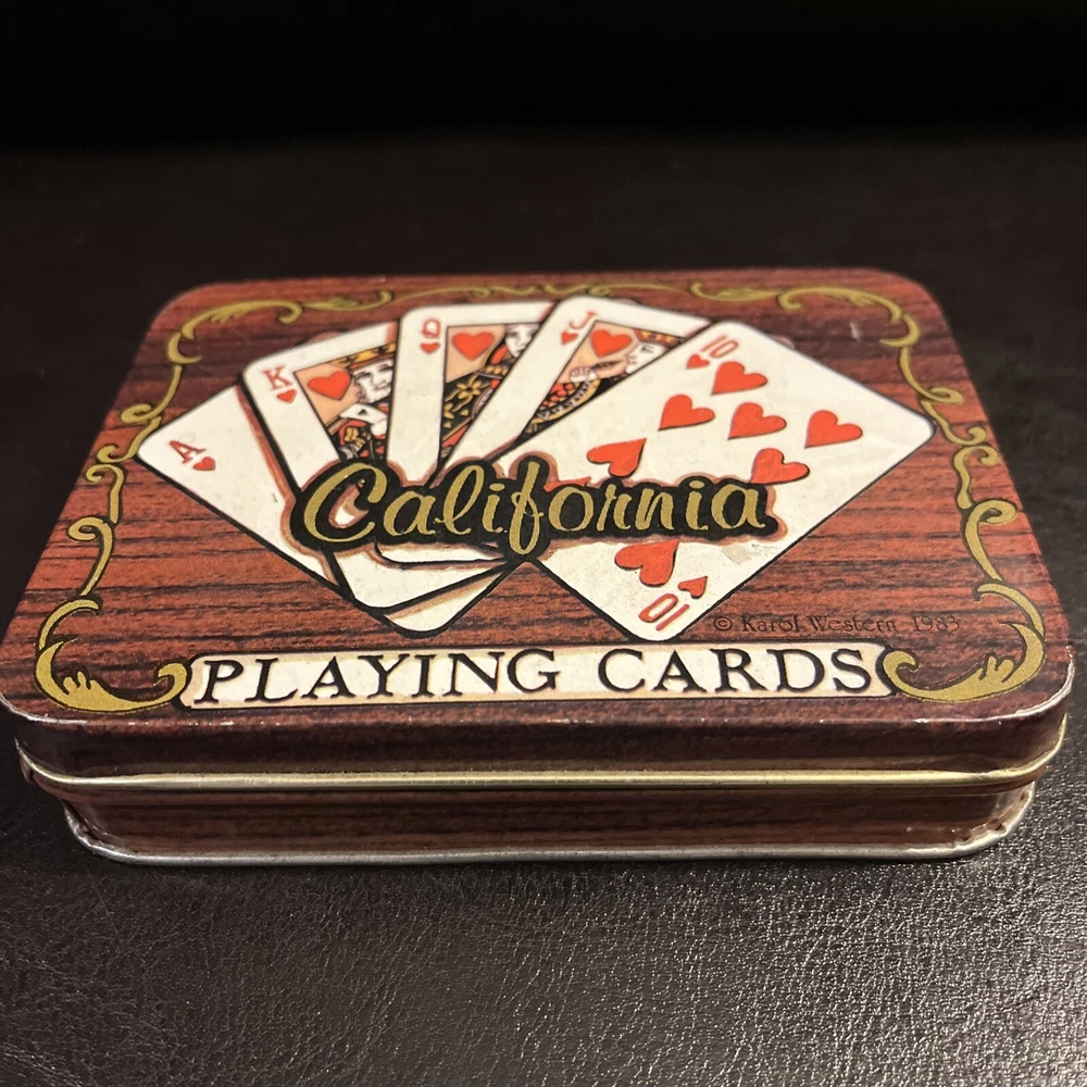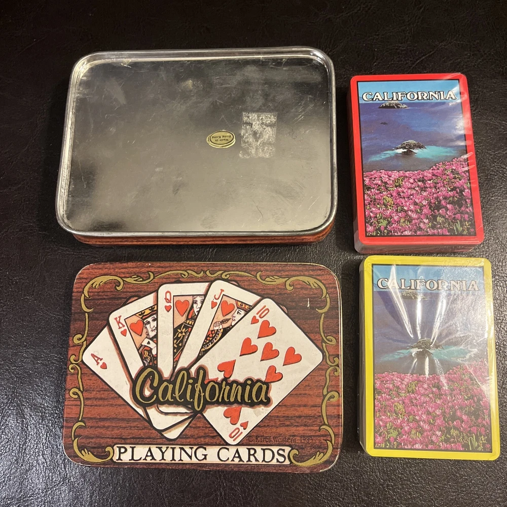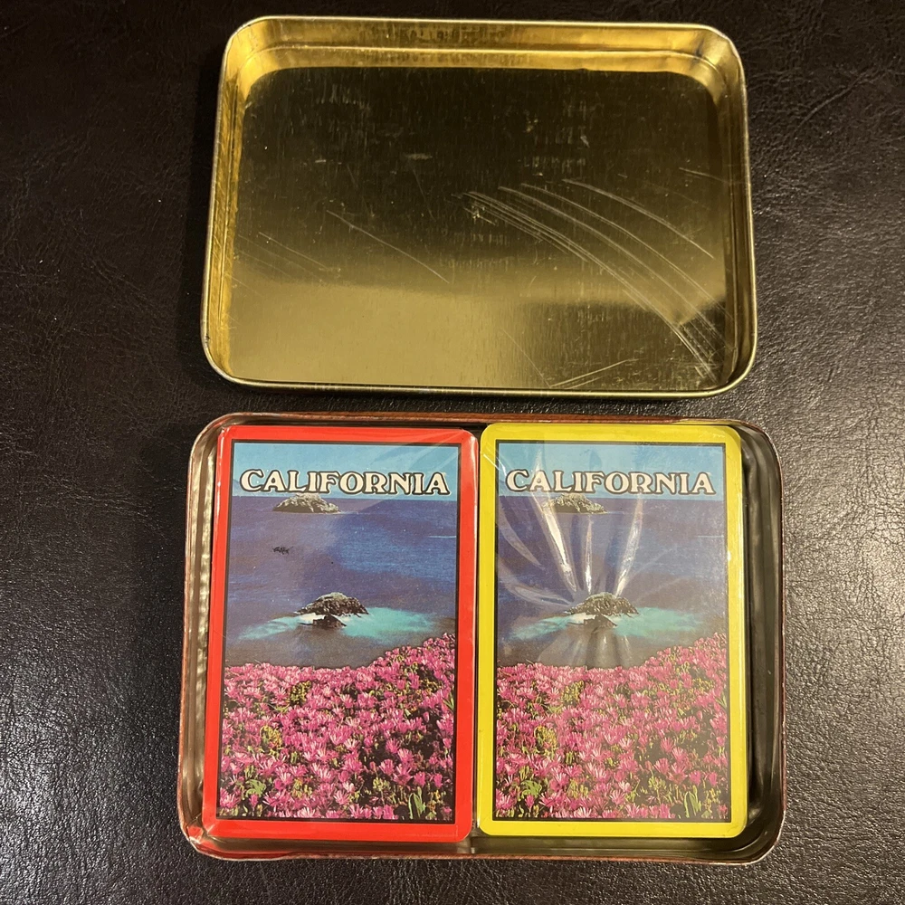 Vintage California Playing Cards in a Metal Tin Can with 2 (two) Sealed Decks Yellow & Red Border. New old stock. Tin have some minor wears and scratches due to age and storage. See pictures for descriptions.