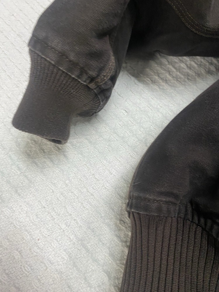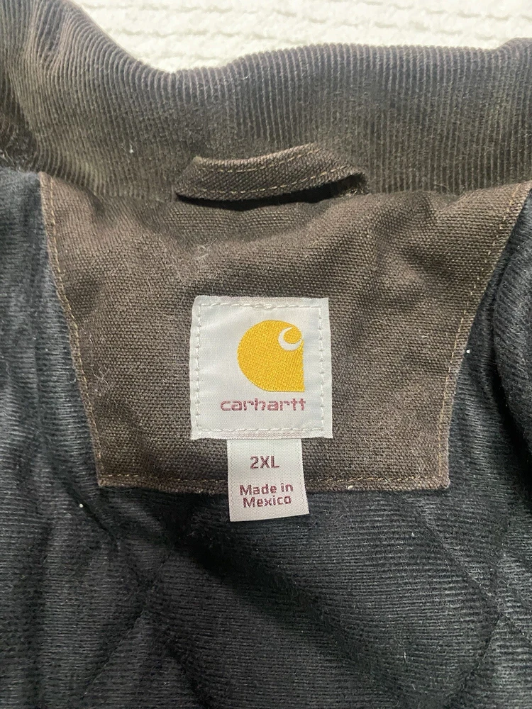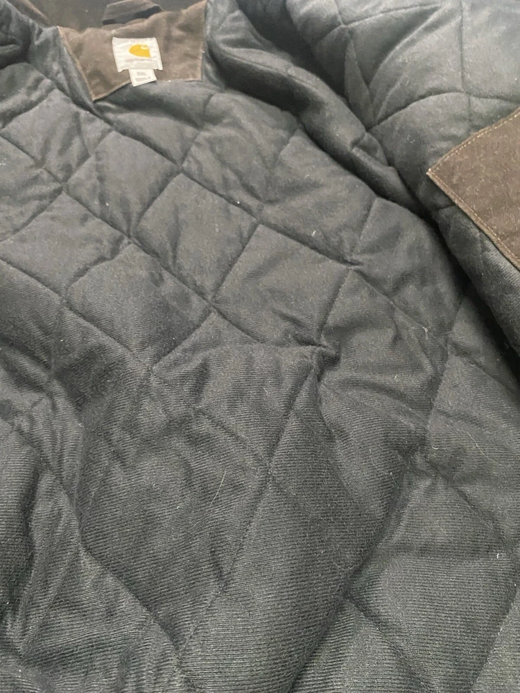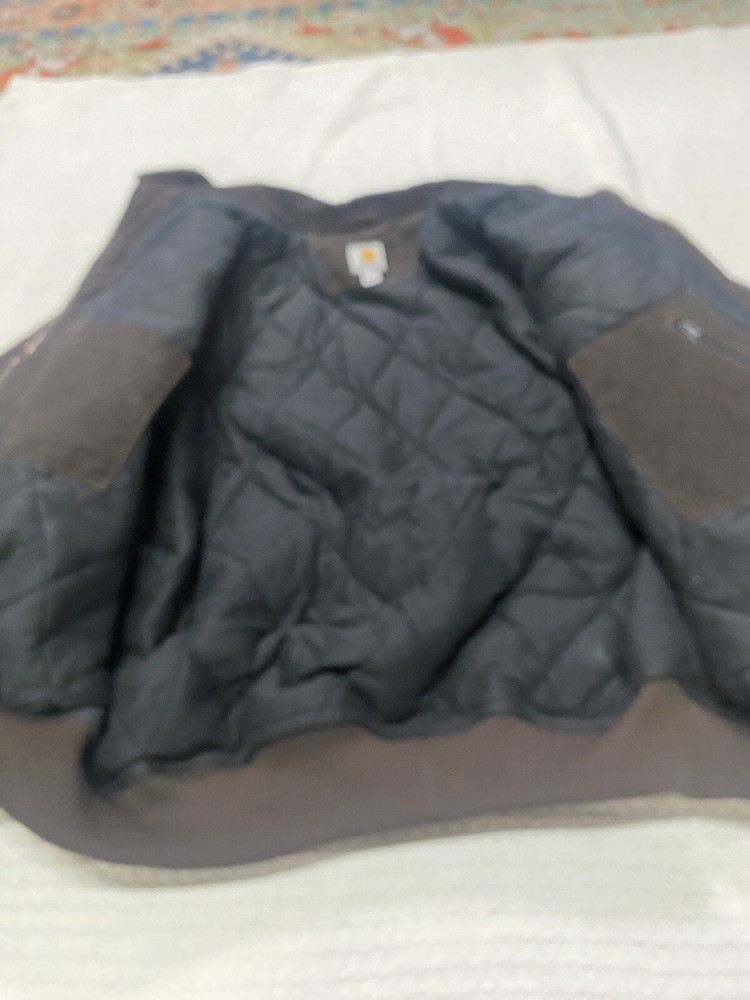 This vintge Carhartt bomber jacket is dark brown in color. It is quilt lined as shown. It does have hand pockets and a chest pocket on the outside. It also has one on each side inside. It has the stretch waist band and sleeve ends. This is in very good condition with normal signs of wear and wash. It does have some very small light spots on it in random places. They are not bad but I want you aware of them. You get the actual item pictured so please look at all photos and ask any questions before purchase.