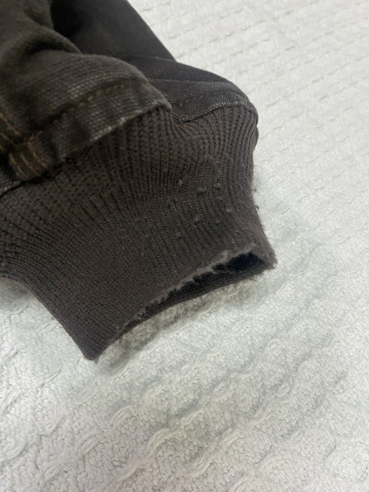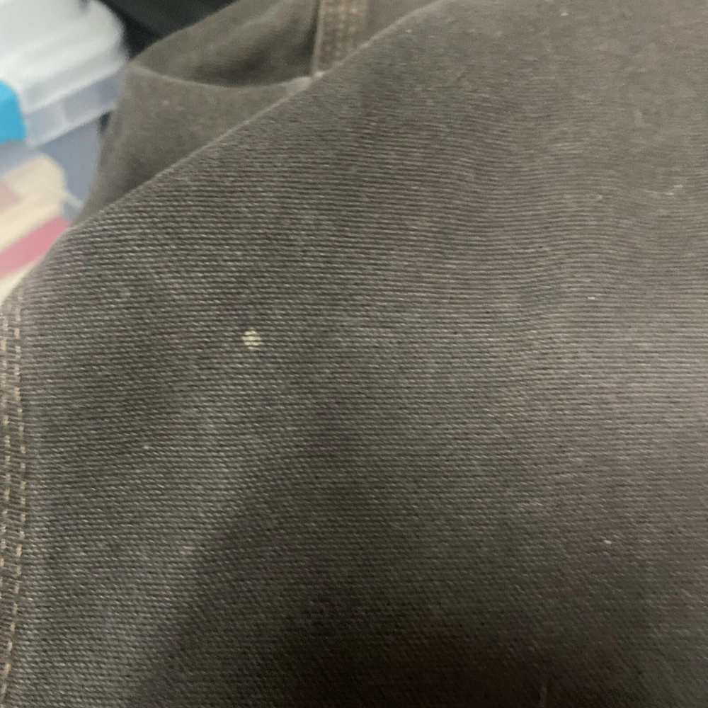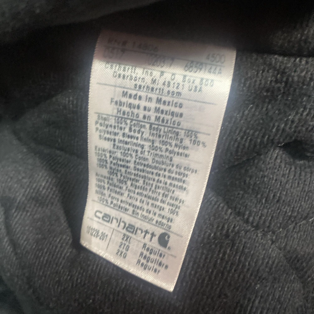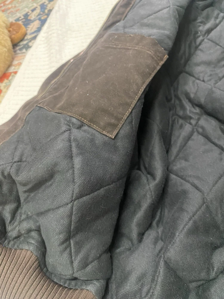 This vintge Carhartt bomber jacket is dark brown in color. It is quilt lined as shown. It does have hand pockets and a chest pocket on the outside. It also has one on each side inside. It has the stretch waist band and sleeve ends. This is in very good condition with normal signs of wear and wash. It does have some very small light spots on it in random places. They are not bad but I want you aware of them. You get the actual item pictured so please look at all photos and ask any questions before purchase.