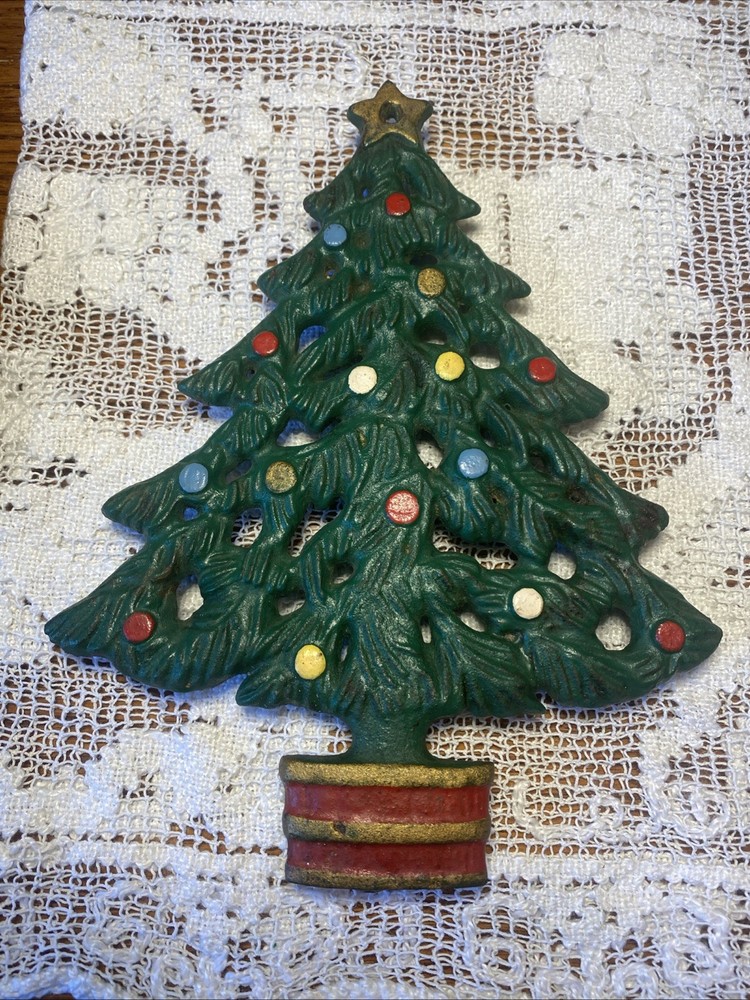 Vintage cast iron Christmas tree trivet. Red and gold tree stang green tree with colorful balls. Gold star. Needs a good cleaning.