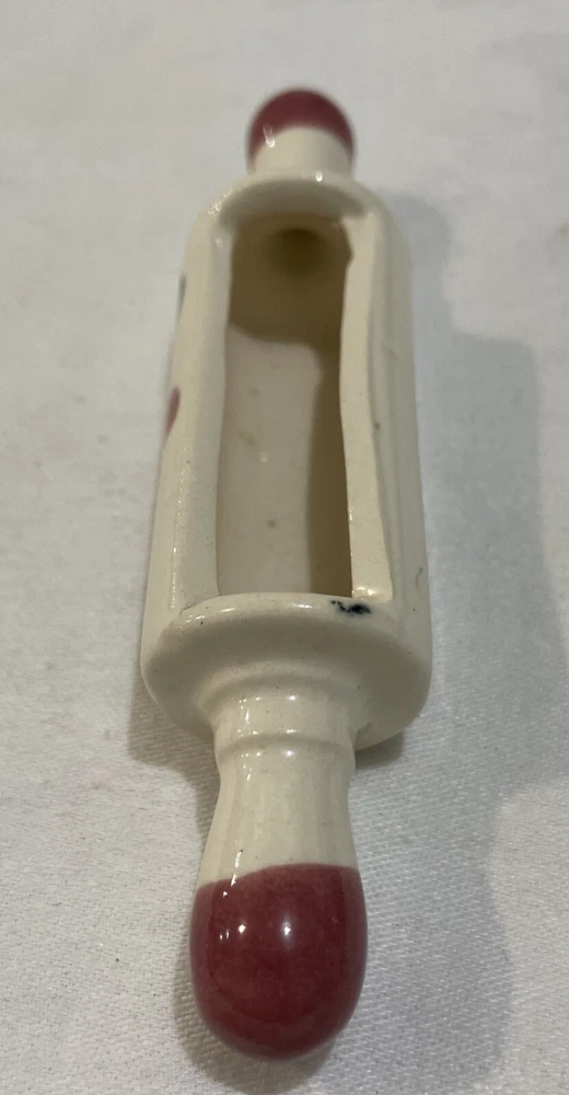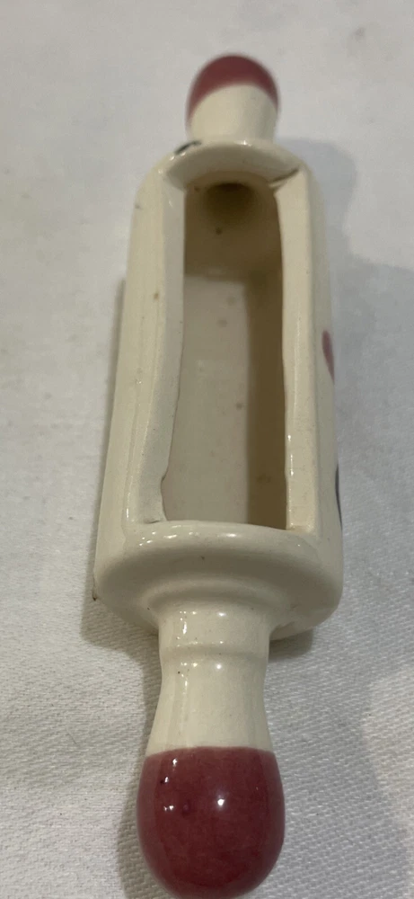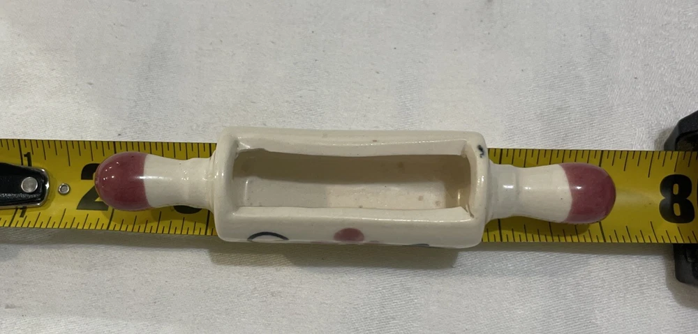 This little rolling pin replica is a cute trinket holder. A great place to drop rings when rolling out dough. Some have been listed as recipe holders but this particular one is too small to hold a recipe card or business card. Too small to be a planter. Paint is in good condition, looks to be hand painted. Check item specifics for size. Let me know If you have questions or need more pictures. All items shipped via USPS Ground Advantage. I will combine shipping to save you money. A note from the seller: I am not a factory direct retailer. I am retired and this is simply a hobby for me. I source my items from estate sales and auctions. The item you are buying is the exact item in the pictures. Please use those to help you assess quality and further description. I try my best to provide an accurate description and photograph any known flaws. I do combine shipping so checkout my other auctions. I prefer no returns, but if there is a problem, please contact me for a possible solution. I am reasonable and humbly expect the same of you. Thank you for looking and I hope you have an exceptional day! Geo1 A3R