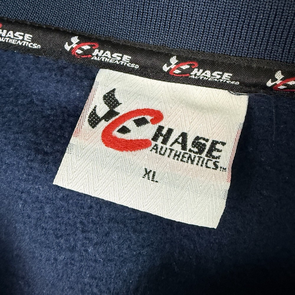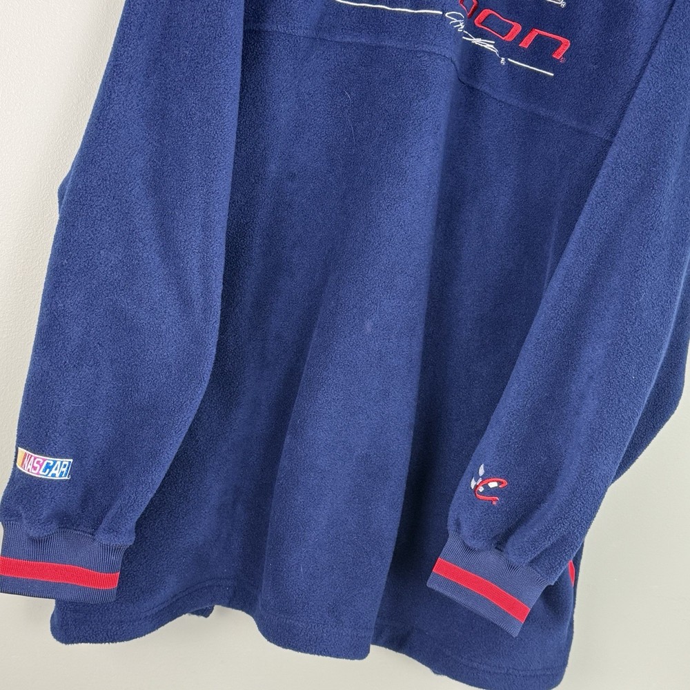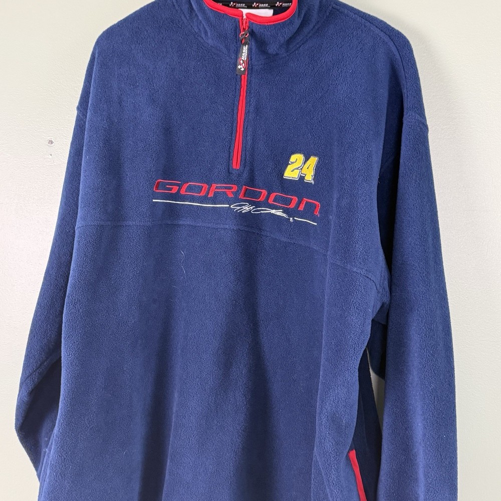 The product is a vintage Chase Jeff Gordon 1/4 zip fleece pullover in adult size XL, featuring the dark blue color scheme of Jeff Gordon's NASCAR car. This officially licensed jacket is designed for men and showcases the iconic Jeff Gordon driver brand. Made in China, this pullover is perfect for NASCAR fans looking to show their support for Jeff Gordon and the Chase brand in style.