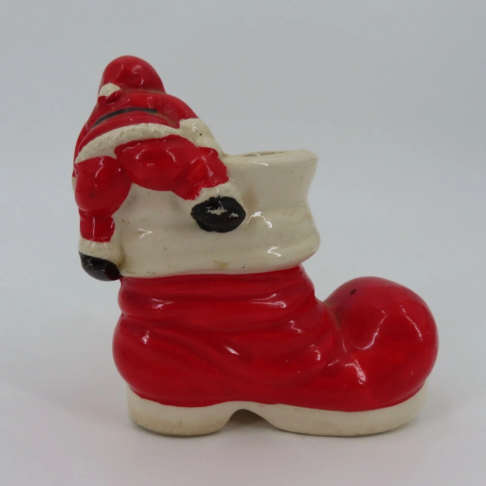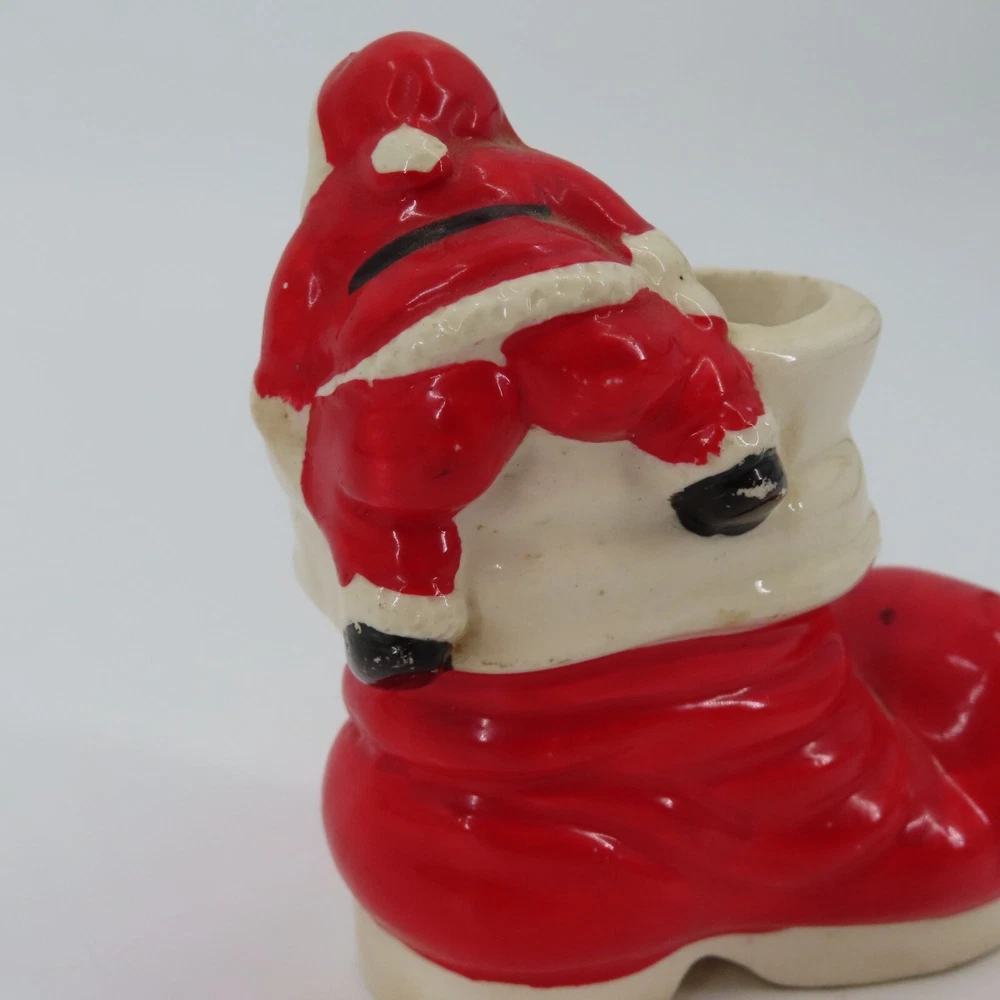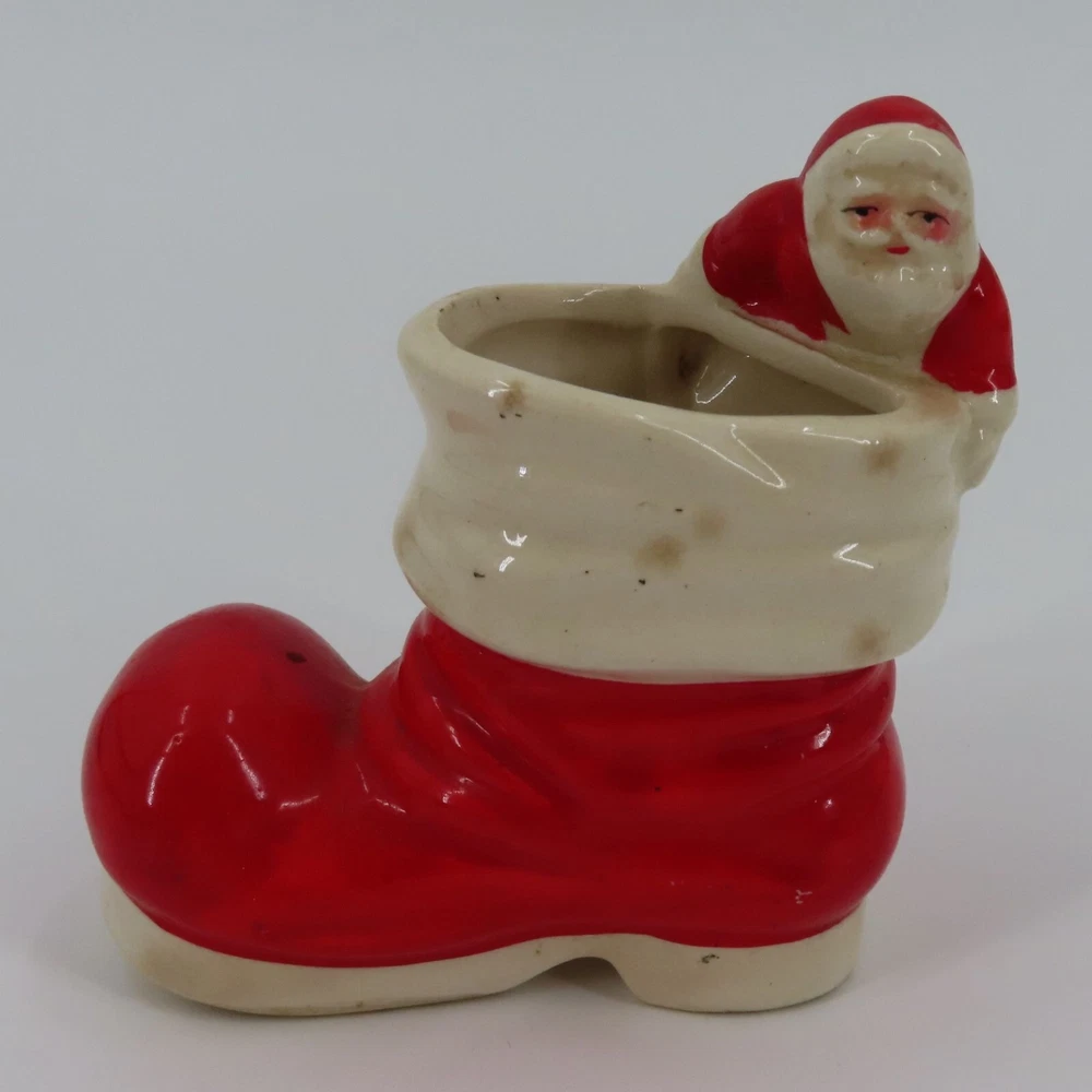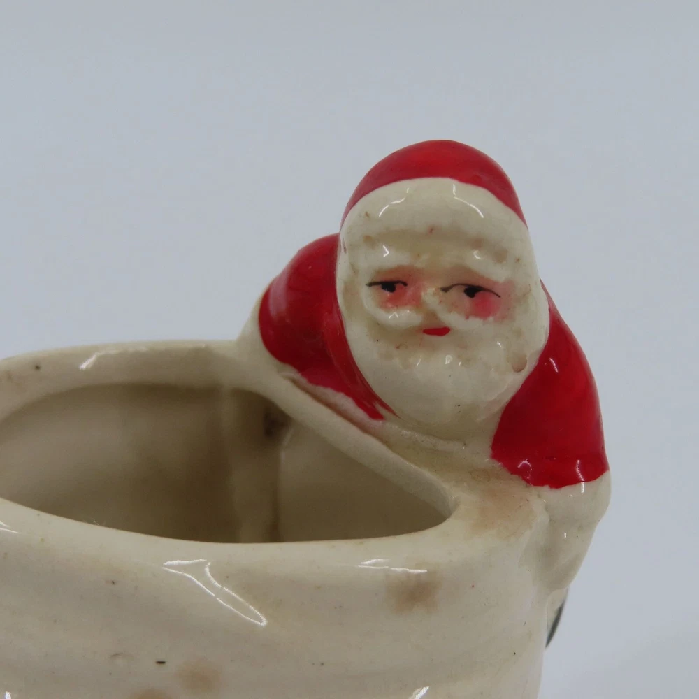 Vintage ceramic booth with climbing Santa Claus Stamped something on base but cannot make out the words Width: 3.5" Height: 3.5" **measurements are approximate, taken with item laying flat Condition: used, surface wear- see photos, smoke free home Please review all photos closely as these will be the best description of the item. Thank you for shopping!