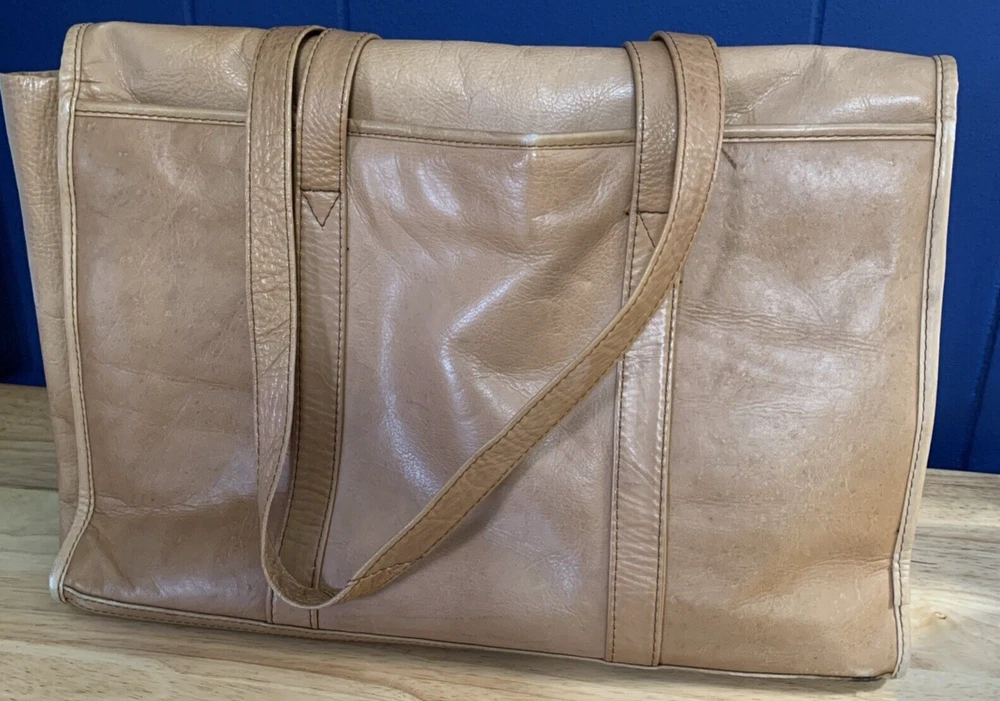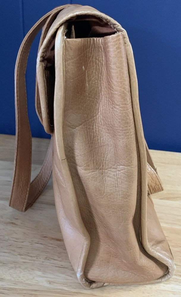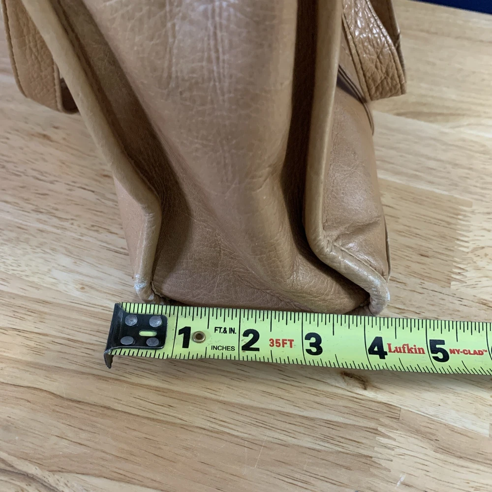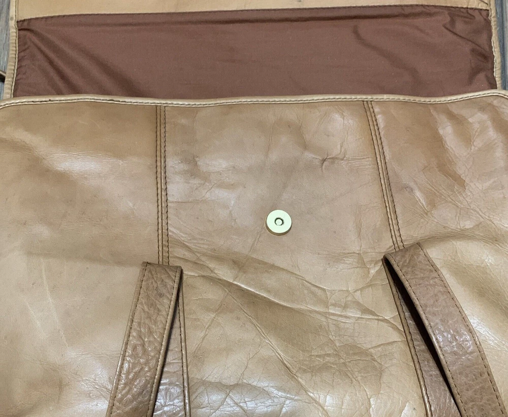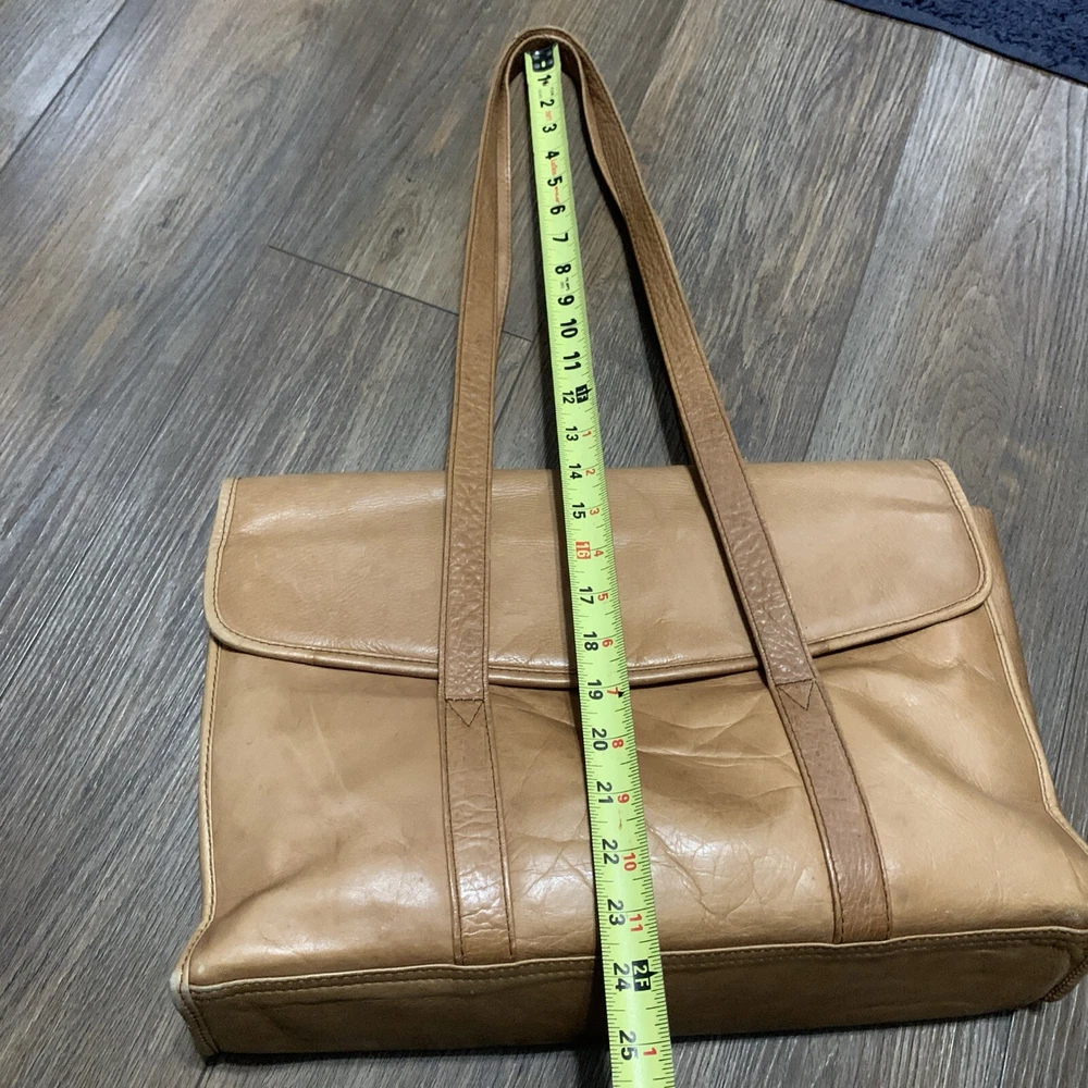 This vintage Colombian leather briefcase is the perfect accessory for any occasion. With a solid pattern and distressed finish, this rectangular-shaped bag features magnetic closure and double handles with a 14-inch drop. The bag is made of high-quality leather and has a brown exterior and lining color, with brown hardware accents. The bag is large in size, measuring 16 inches in width, 11 inches in height, and 3 inches in depth. It is lined with satin and has inner dividers, as well as inner and outer pockets for storage. The bag is padded and can be packaged for travel. It is a classic and rustic-themed bag suitable for school, business, and workwear.