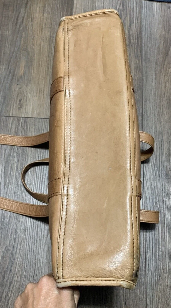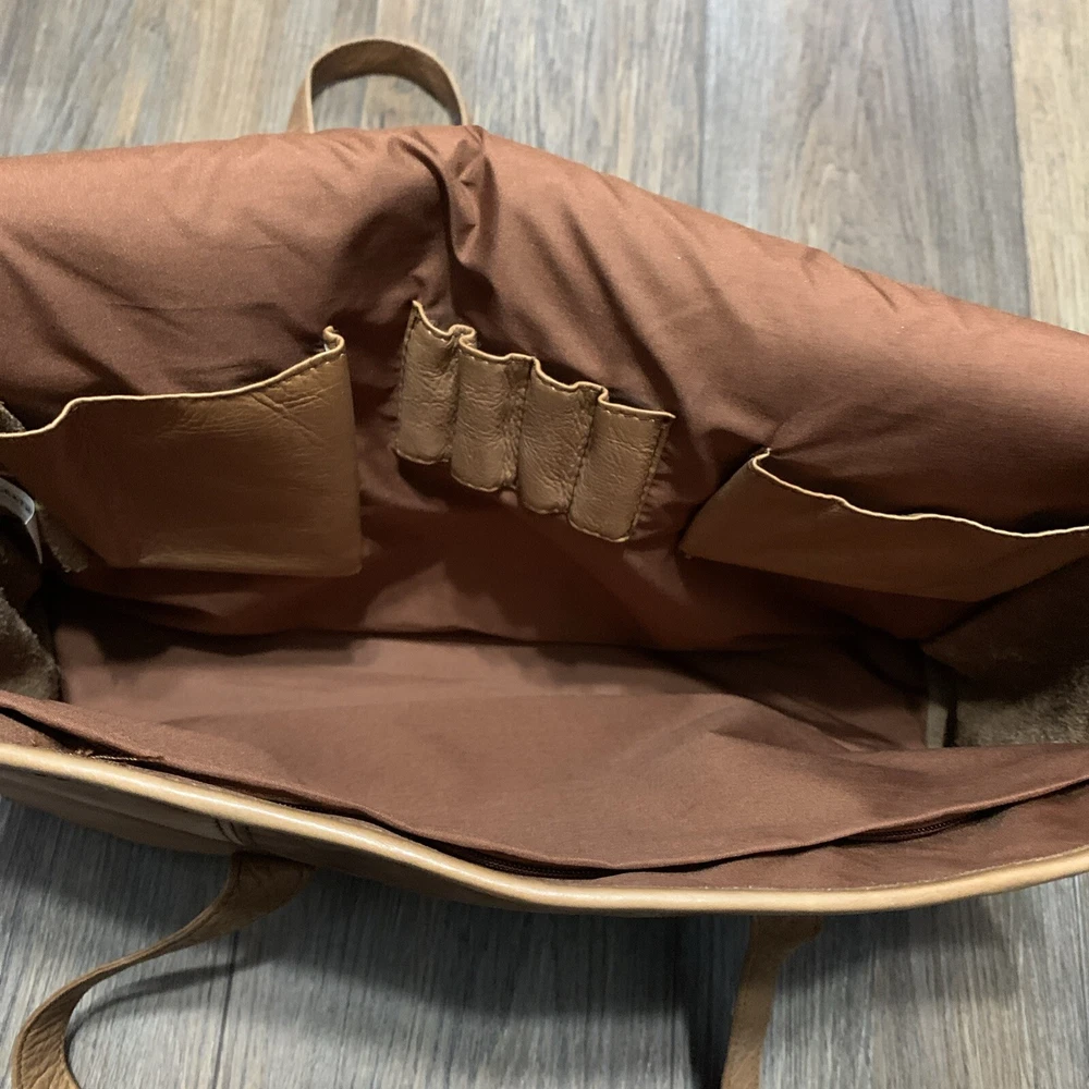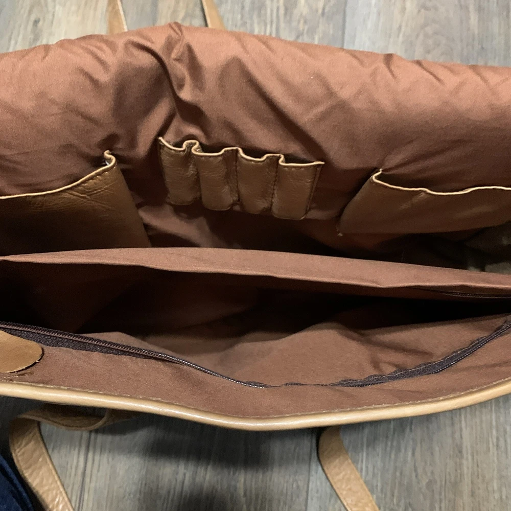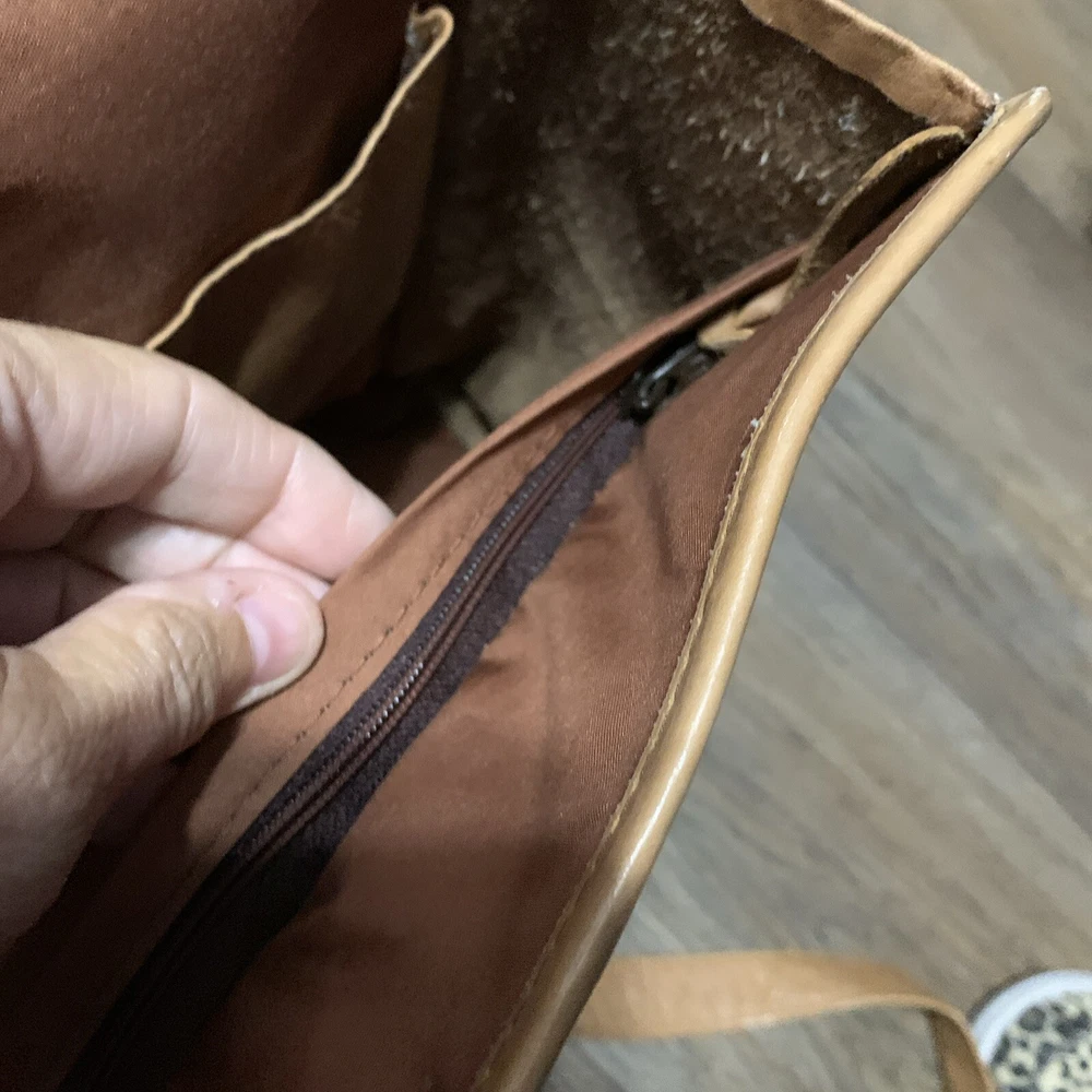 This vintage Colombian leather briefcase is the perfect accessory for any occasion. With a solid pattern and distressed finish, this rectangular-shaped bag features magnetic closure and double handles with a 14-inch drop. The bag is made of high-quality leather and has a brown exterior and lining color, with brown hardware accents. The bag is large in size, measuring 16 inches in width, 11 inches in height, and 3 inches in depth. It is lined with satin and has inner dividers, as well as inner and outer pockets for storage. The bag is padded and can be packaged for travel. It is a classic and rustic-themed bag suitable for school, business, and workwear.