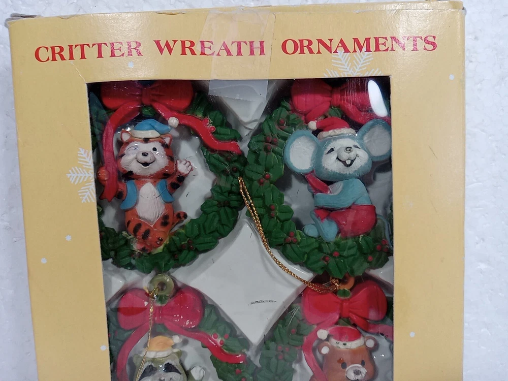 The "VTG Critter Wreath Christmas Ornaments" set includes four vintage animal ornaments made of resin. These hand-painted ornaments feature animals and are part of a collection of ornaments. They come in a box for easy storage and display during the holiday season. Each ornament is designed as an antique-style ornament with a theme of animals, making them a charming addition to any Christmas decor.