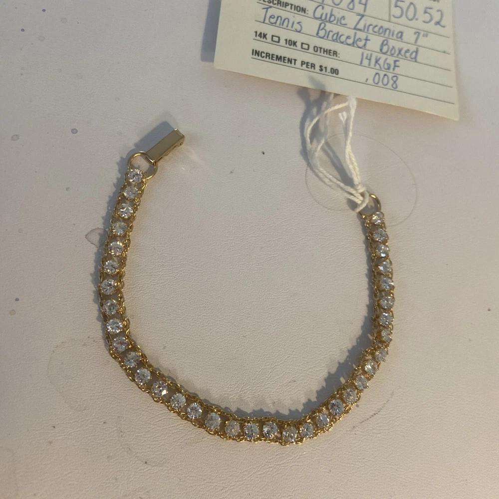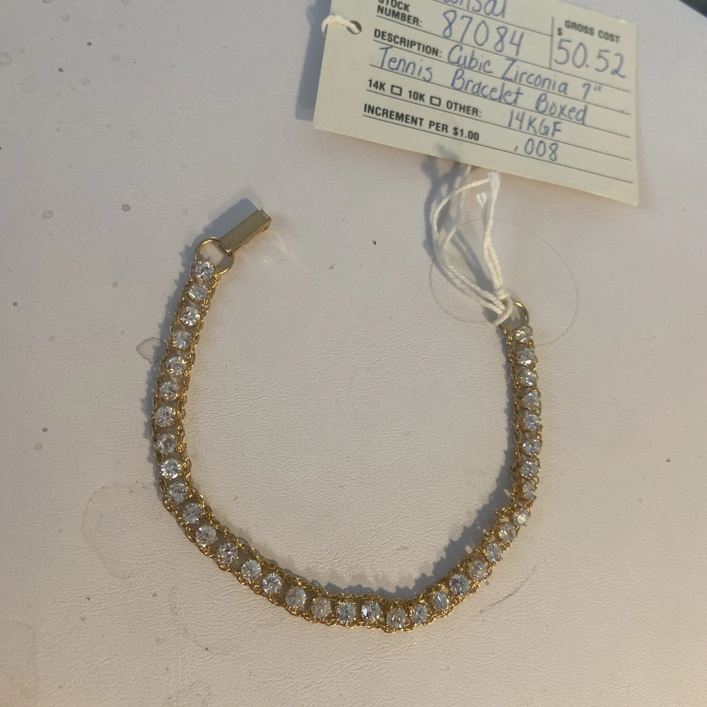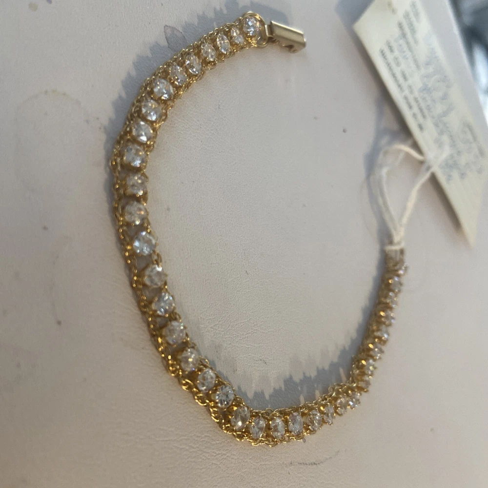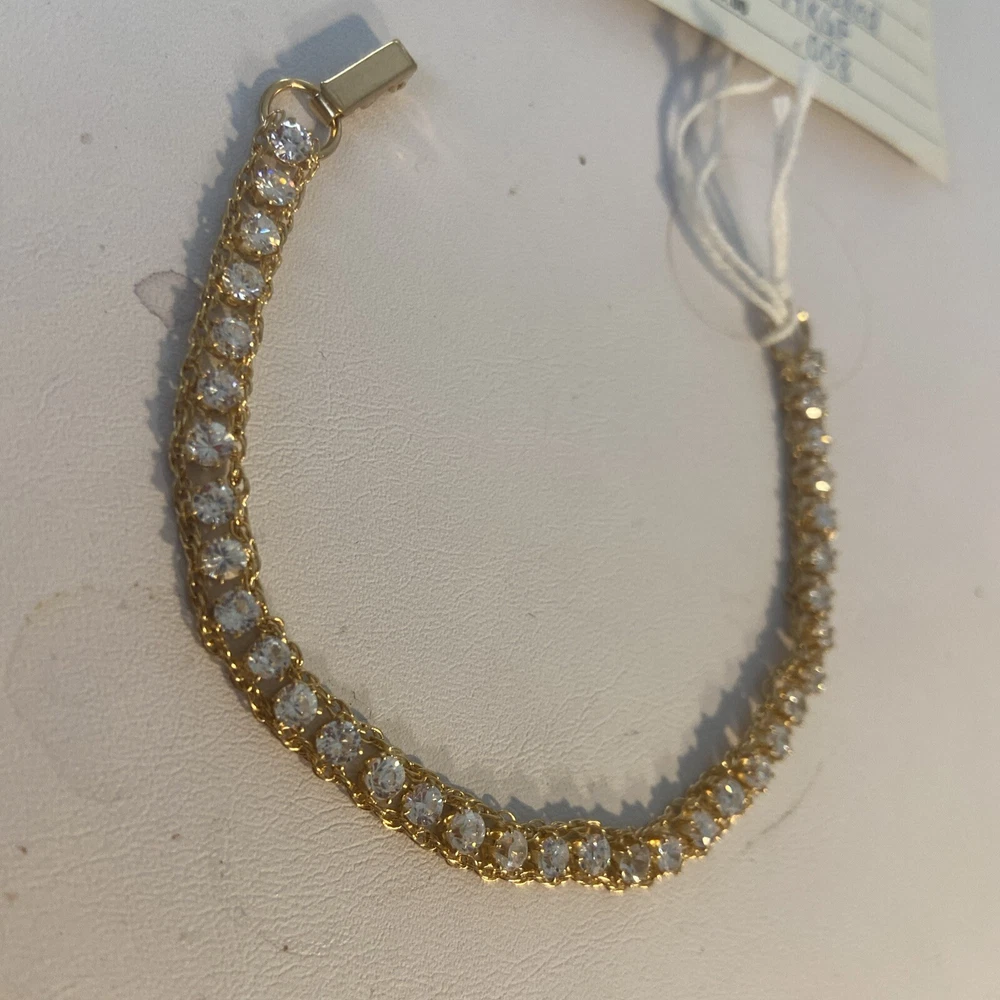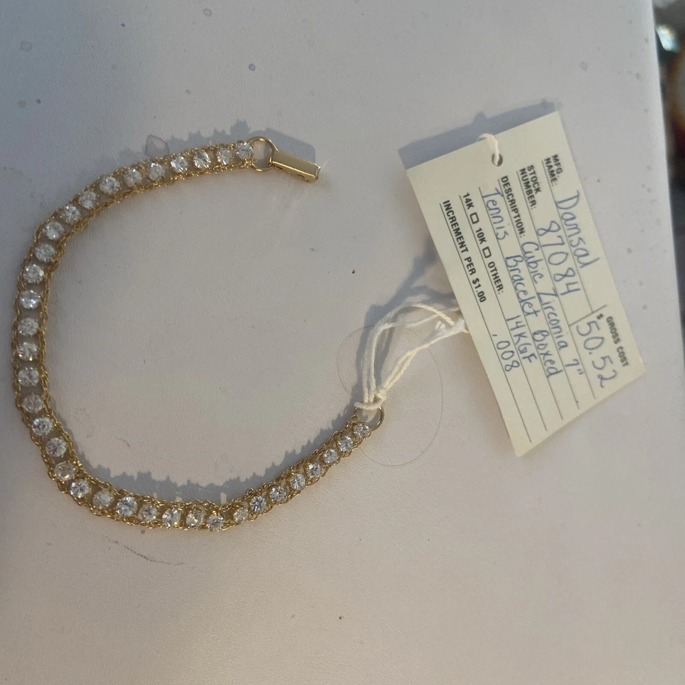 This vintage Dansal bracelet is a stunning piece of jewelry that will surely catch anyone's eye. With beautiful white/colorless Cz main stones and a yellow gold filled metal, this bracelet exudes a retro era beauty. Measuring at 7 inches in length, it is perfect piece for many occasions. The bracelet is a great addition to any collection. Its tennis style and 14k gf metal purity add to its elegance. This piece is perfect for anyone who loves vintage and antique jewelry, and it's sure to make a statement wherever it's worn.Made in providence Rhode Island USA new old stock I bought the remains of this old company.