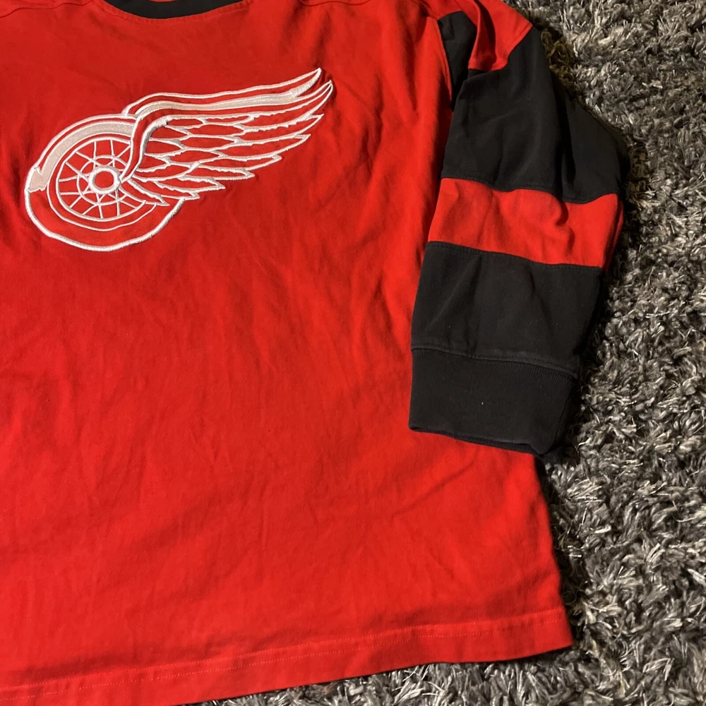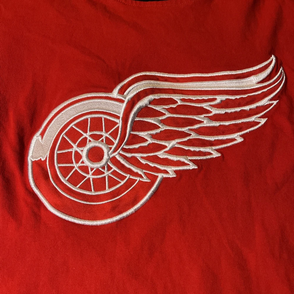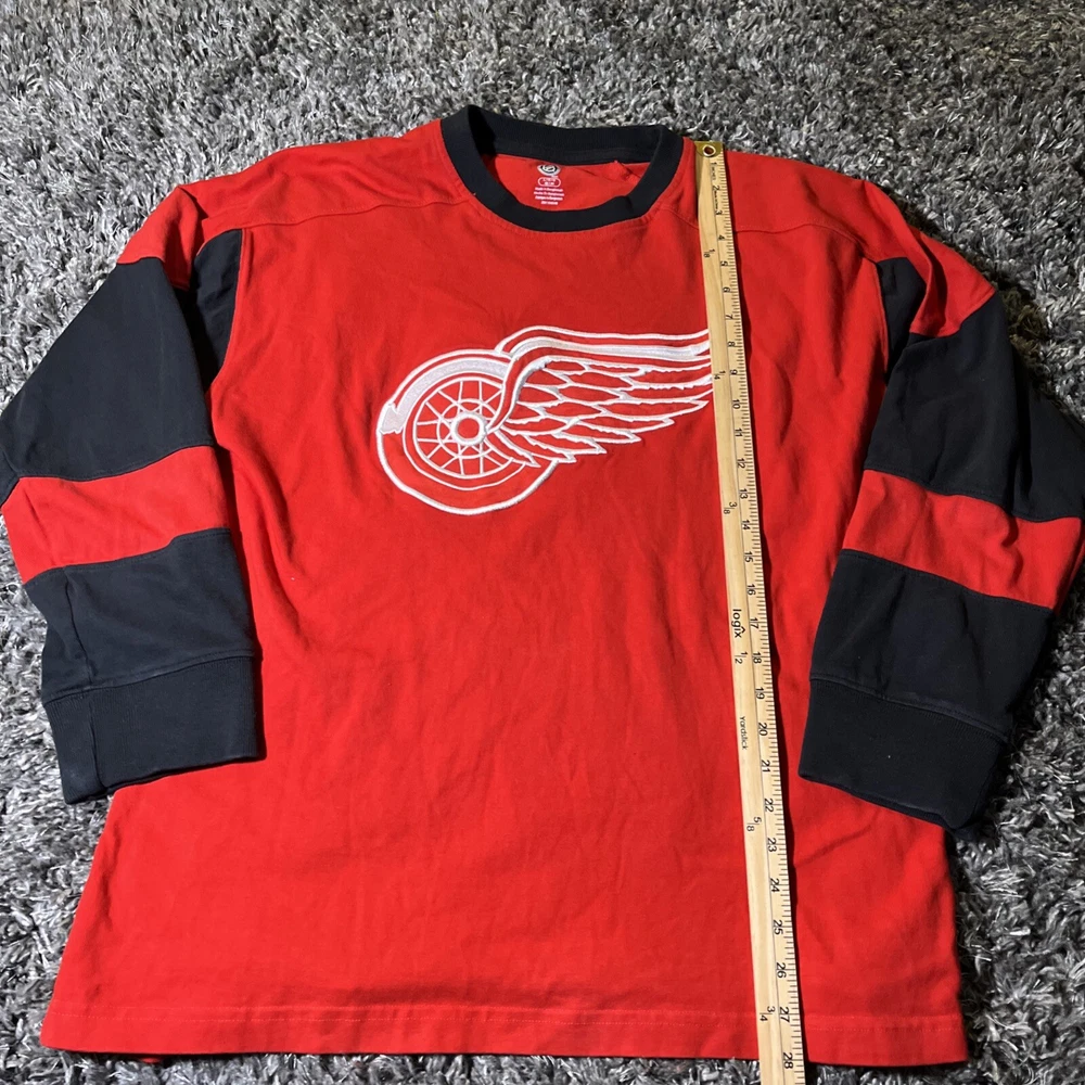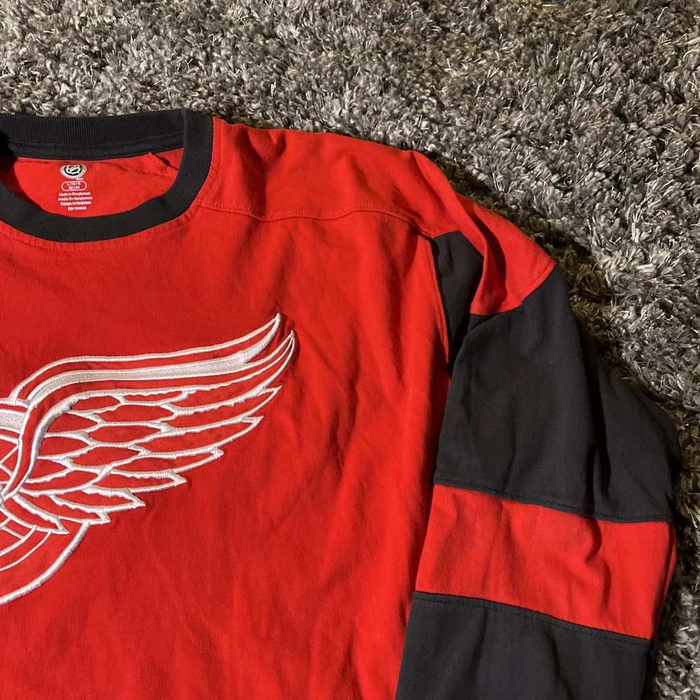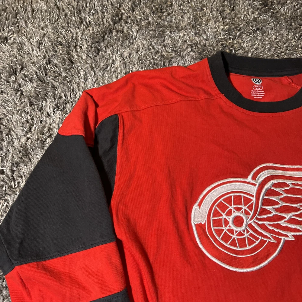 The product is a vintage Detroit Red Wings long sleeve shirt in size large, featuring an embroidered team logo. It is officially licensed by the National Hockey League (NHL) and designed for unisex adults. The shirt is in excellent used condition and is colored red, representing the team's colors. This fan apparel item is a great addition to any Detroit Red Wings supporter's collection, perfect for showing team pride during the regular NHL season.