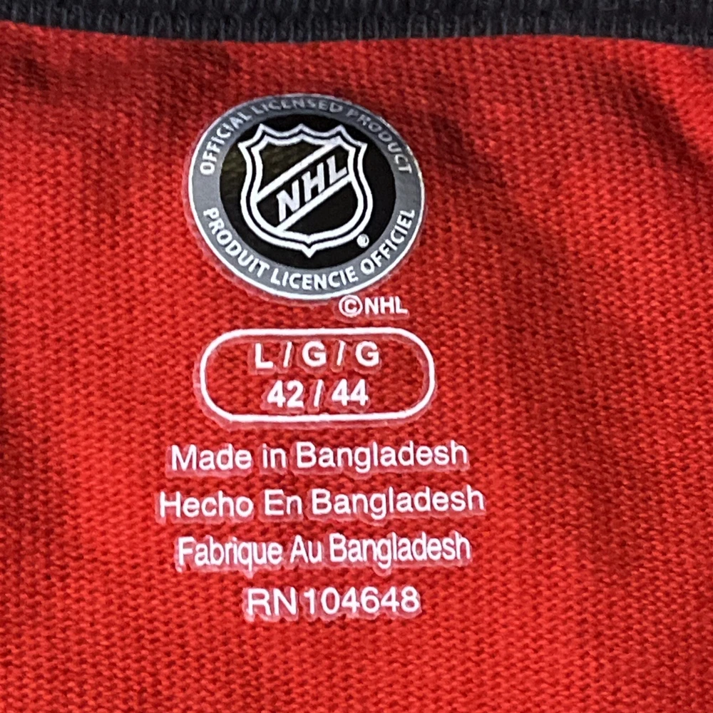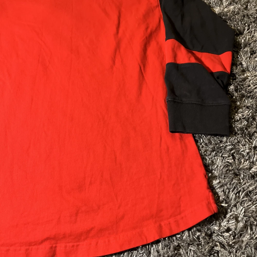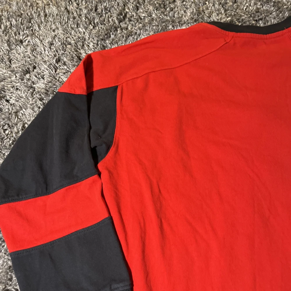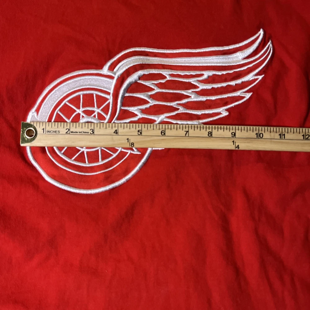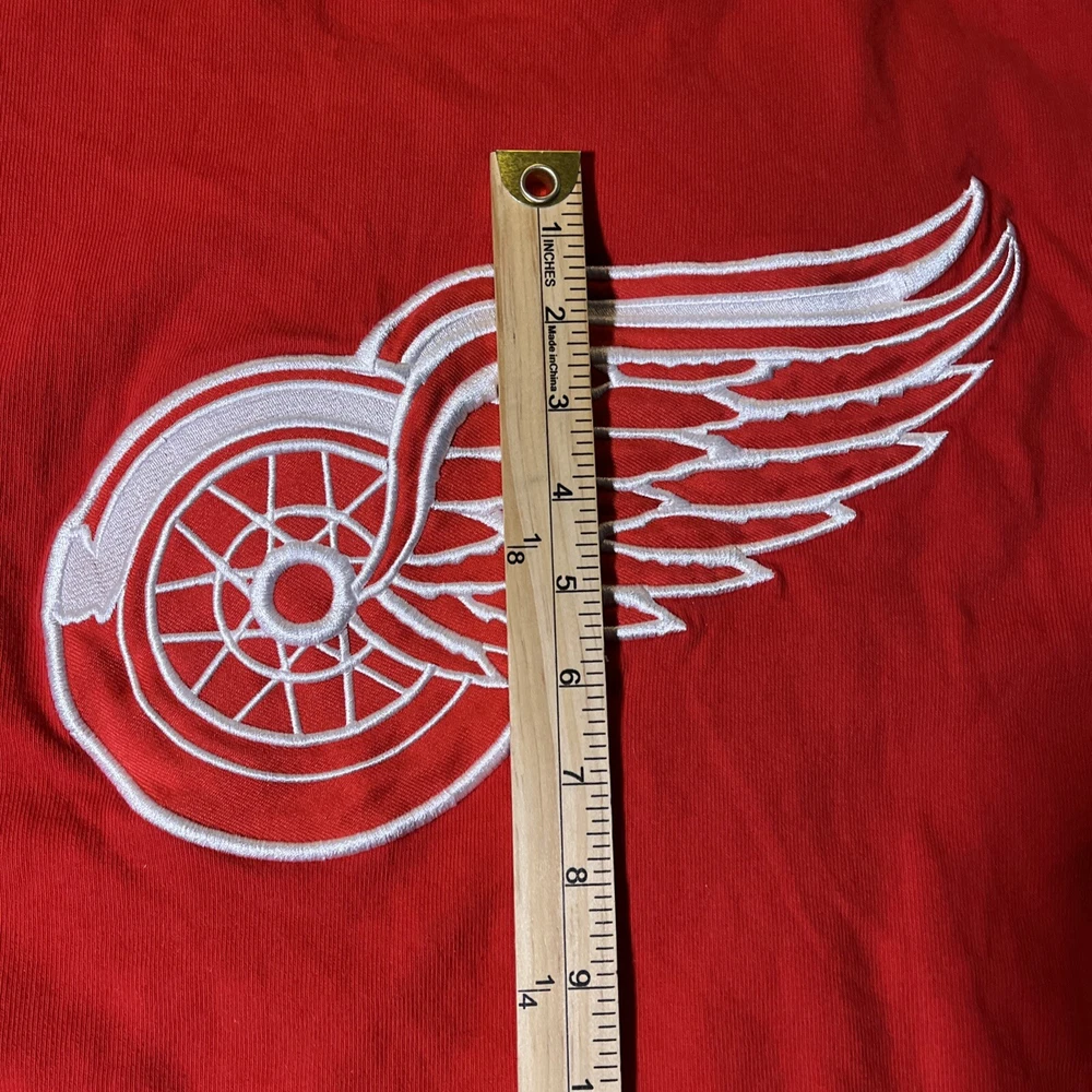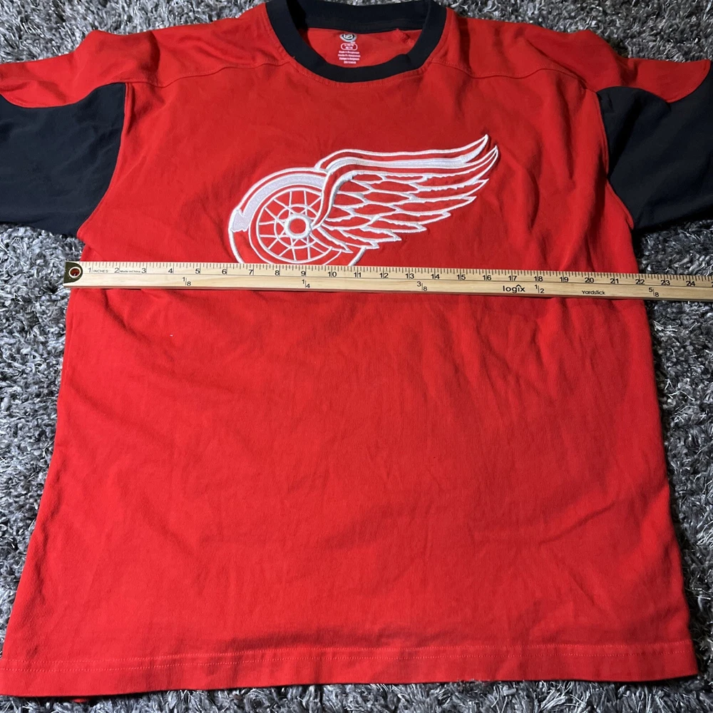 The product is a vintage Detroit Red Wings long sleeve shirt in size large, featuring an embroidered team logo. It is officially licensed by the National Hockey League (NHL) and designed for unisex adults. The shirt is in excellent used condition and is colored red, representing the team's colors. This fan apparel item is a great addition to any Detroit Red Wings supporter's collection, perfect for showing team pride during the regular NHL season.