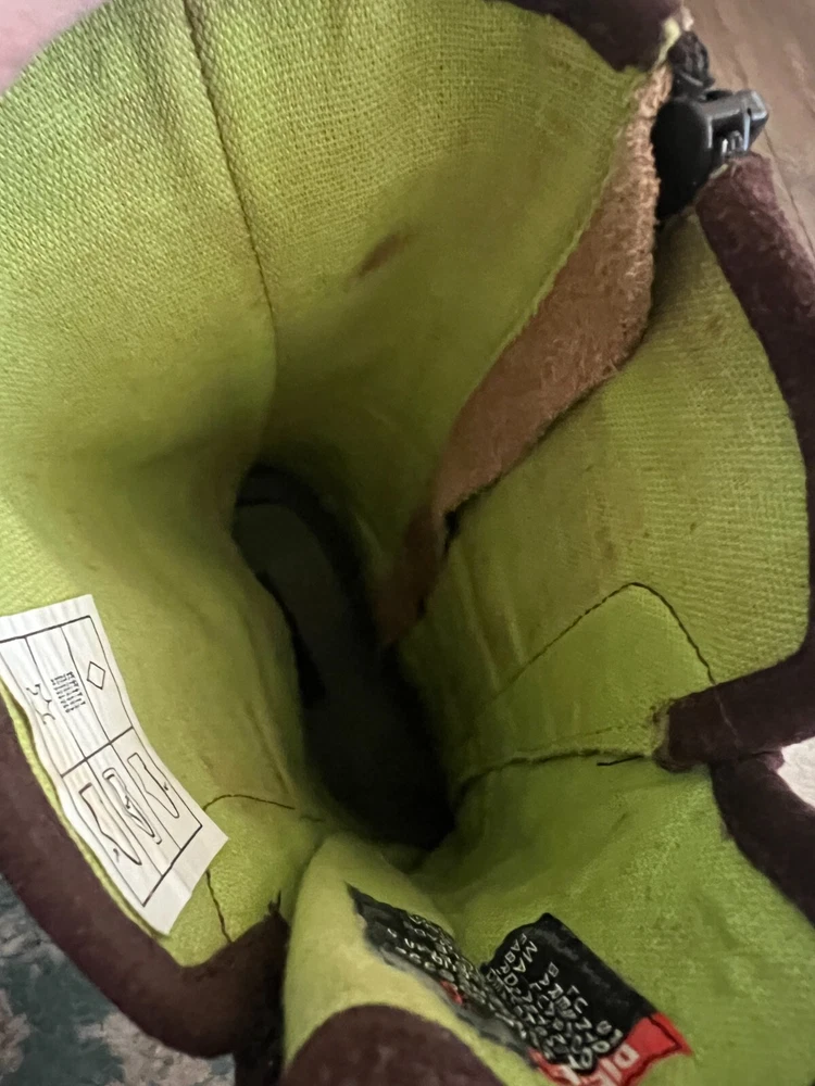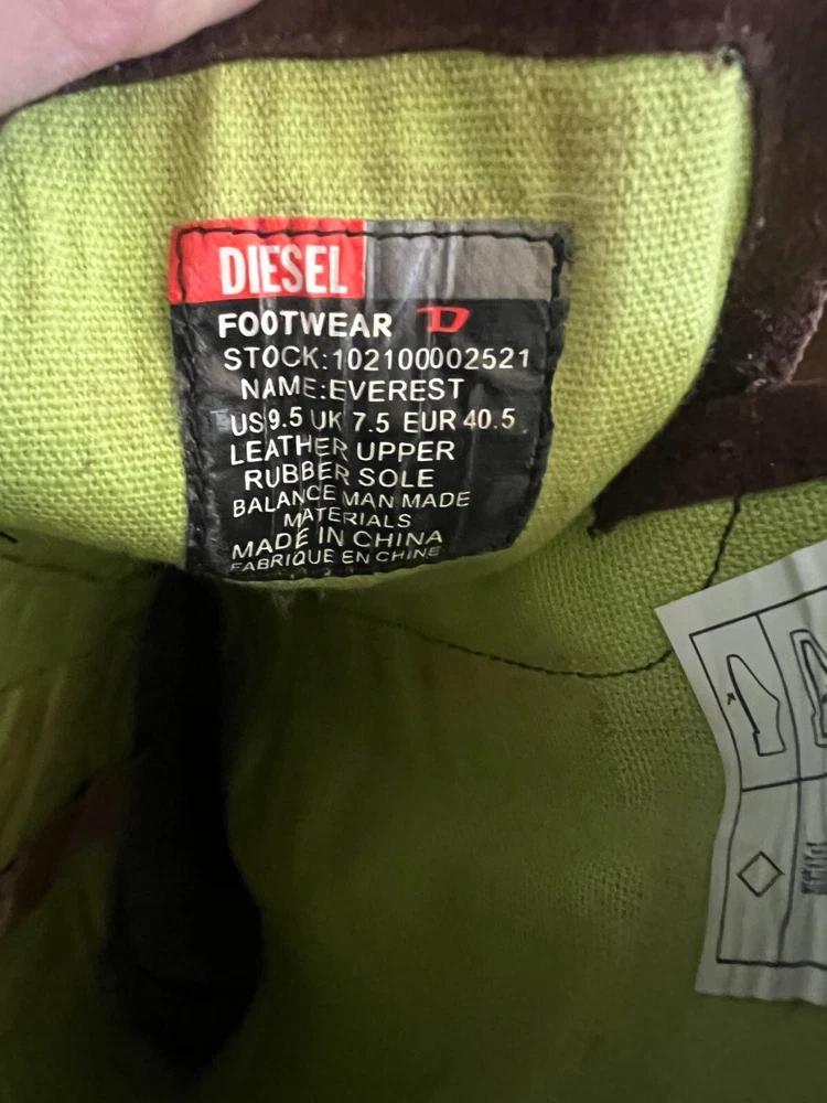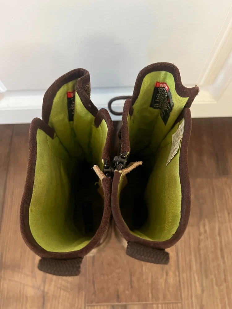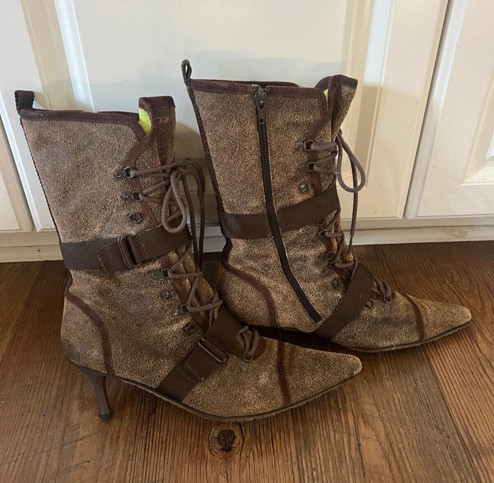 Step out in style with these Diesel Vintage Everest Pointed Toe Lace Up Grunge Heeled Boots. These boots are sure to make a statement! The boots feature a mid-calf shoe shaft style, pointed toe, and lace-up closure for a comfortable and secure fit. The suede upper material is accented with a strap, laces and zipper, giving the boots a unique look. The boots have a rubber outsole for durability and a fabric lining for added comfort. The kitten heel style adds a touch of sophistication to the overall grunge look. These boots are perfect for winter, fall, and spring seasons. Available in size 9.5 US and 40.5 EU. There is some discoloration on the inside of the boots, but they are in very nice condition from the outside. The sole and heel show little to no wear.