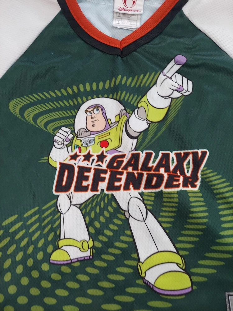 VTG Disney Store Hockey Jersey Buzz Lightyear 95 Kids S 5/6 Toy Story Galaxy Size S 5/6 Brand: Disney store. Long sleeve Hockey jersey reads 'Galaxy Defender' on front and 'Buzz 95' on back. Please see the pictures. The shirt has one small pull (It's not a hole) on front. Smoke-free pet friendly