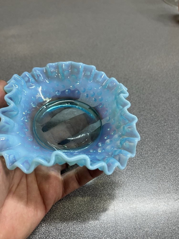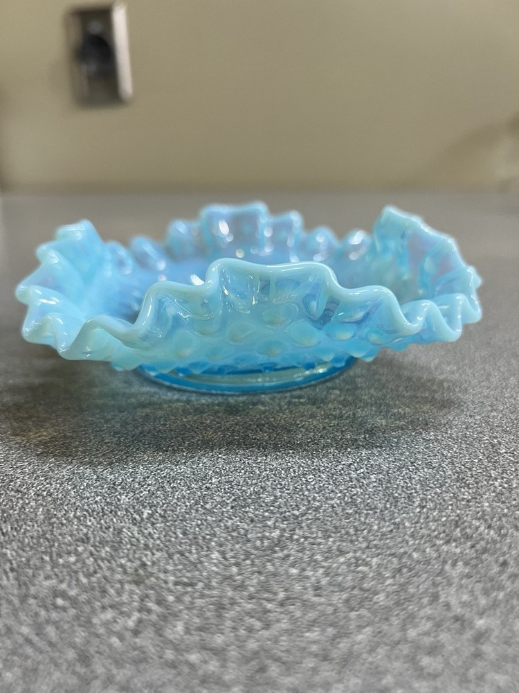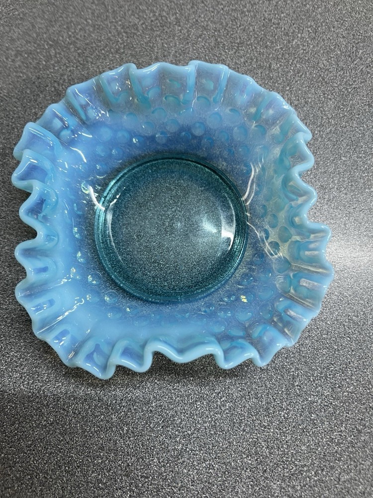 VTG Fenton Art Glass Bon Bon Dish Opalescent Blue Hobnail Double Crimp Ruffle. Condition is Used. Shipped with USPS Ground Advantage.