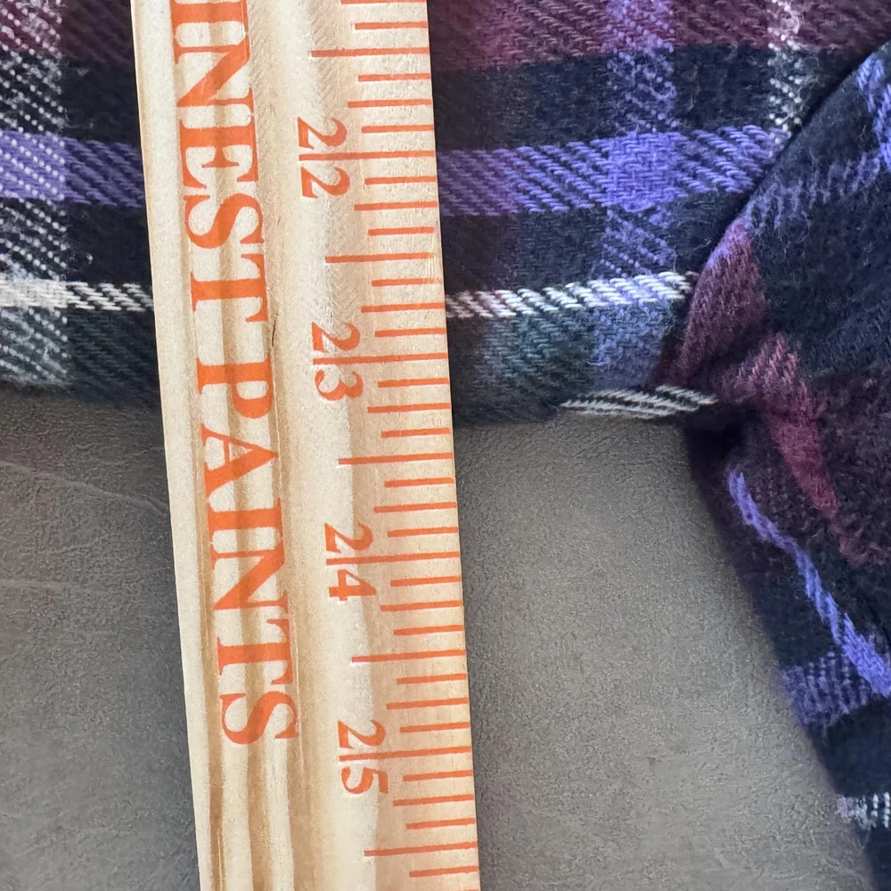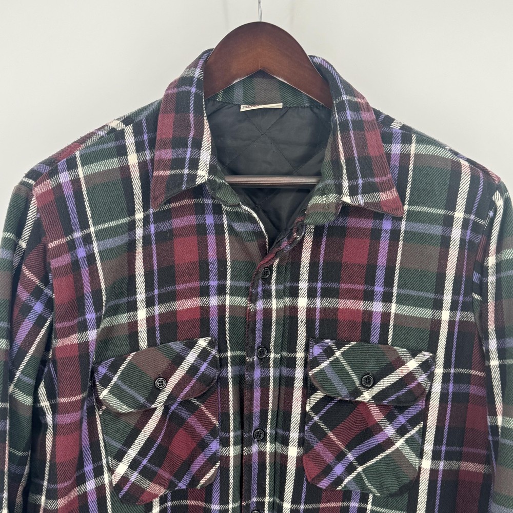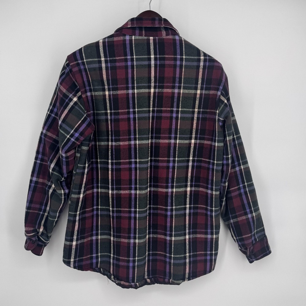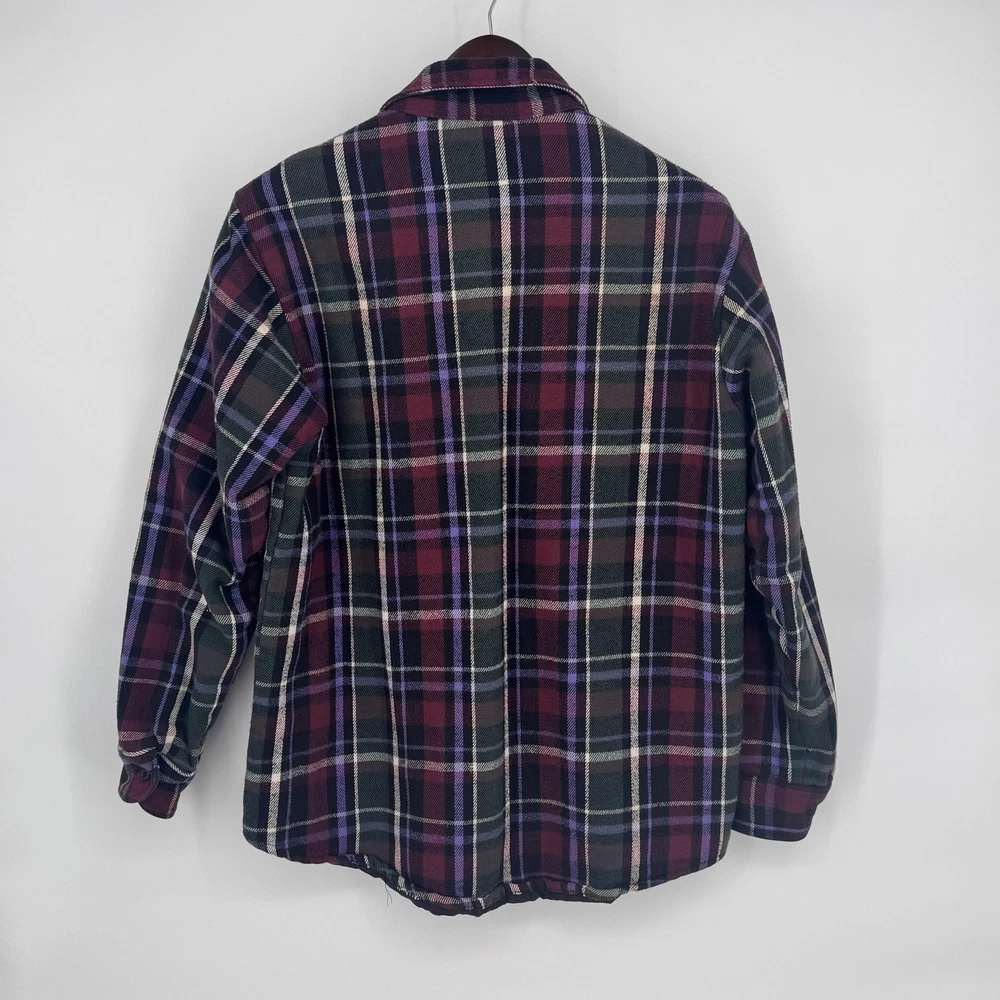 VTG Field & Stream Shirt Jacket Mens Large Shacket Plaid Quilted Flannel Lined Pre-owned quilted flannel shirt jacket with regular use and laundering. Exterior flannel shows general softening with two small stains on the fabric as shown. Buttons, cuffs, pockets, and quilted lining remain intact and functional, and item is sold without original retail tags or packaging. Care and size tag have been removed Brand: Field & Stream. Style: Mens quilted flannel shirt jacket with button front and collared neckline. Color: Multicolor plaid in burgundy, green, black, purple, and off-white tones. Tag size: Mens Large. Material: Outer cotton flannel shell with quilted polyester lining and polyester insulation. Design details: Point collar, full button front closure, long sleeves with button cuffs, and straight hem with a slight shirt-jacket silhouette. Features: Two button-flap chest pockets, quilted insulated lining for added warmth, and mid-length jacket design suitable for layering. Pattern and texture: Allover multicolor tartan-style plaid with a soft brushed flannel exterior and smooth diamond-quilted interior lining. Branding and labels: Woven Field & Stream neck label stitched at the interior neckline. Occasion and use: Ideal for casual wear, outdoor activities, hiking, hunting, or workwear layering in cool weather. Special notes: Classic Field & Stream insulated flannel shirt jacket combining the look of a flannel shirt with the warmth of a lined jacket. 112878