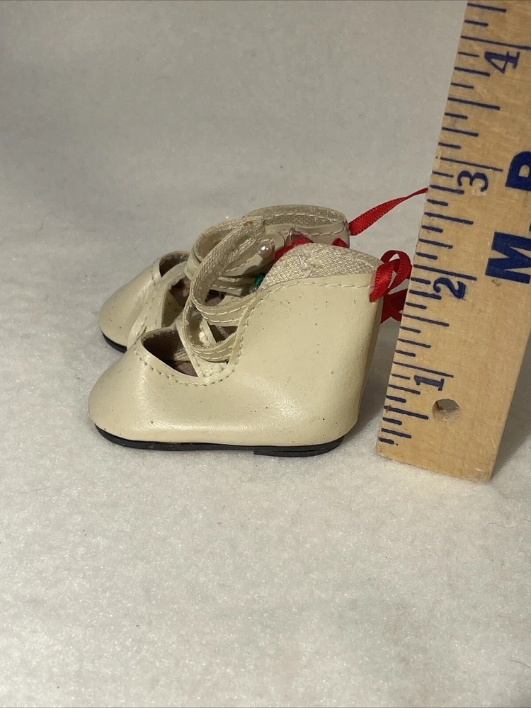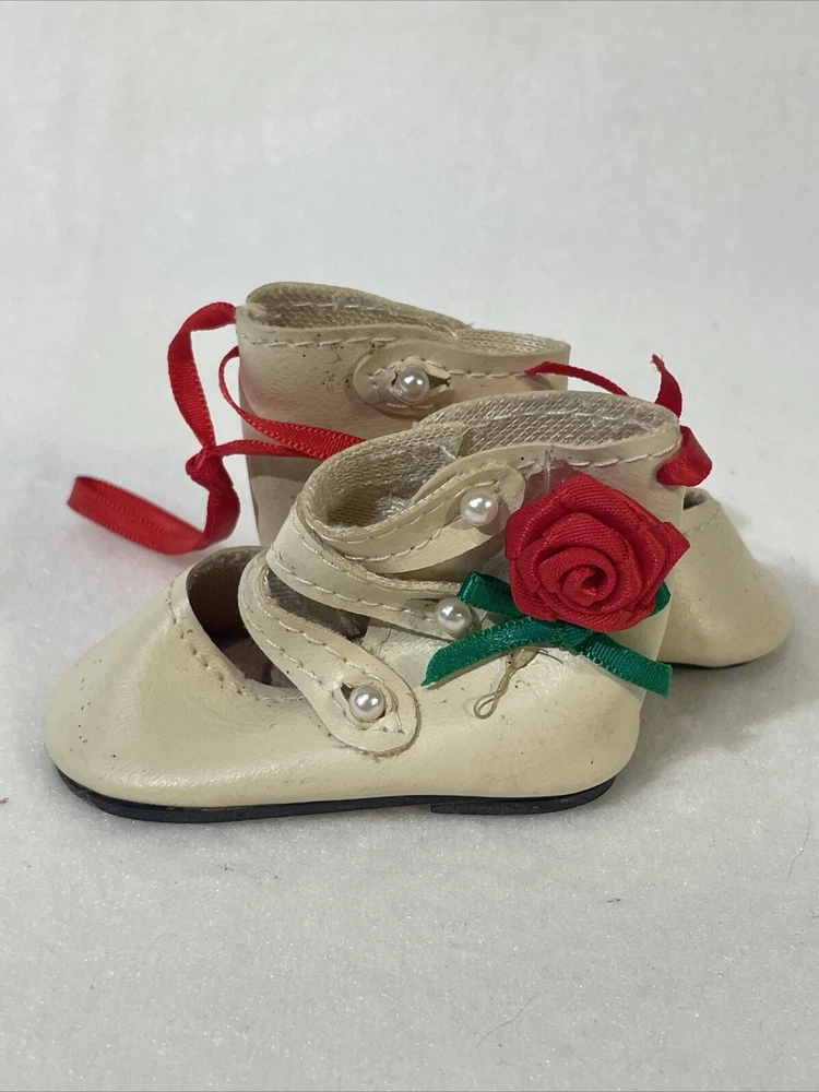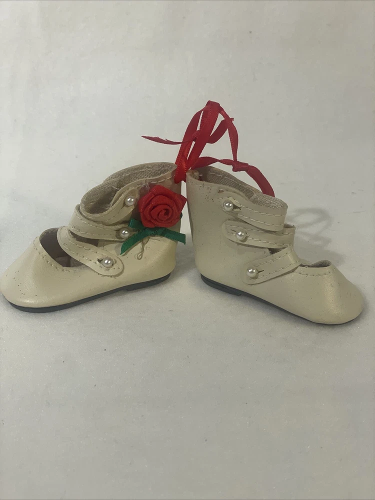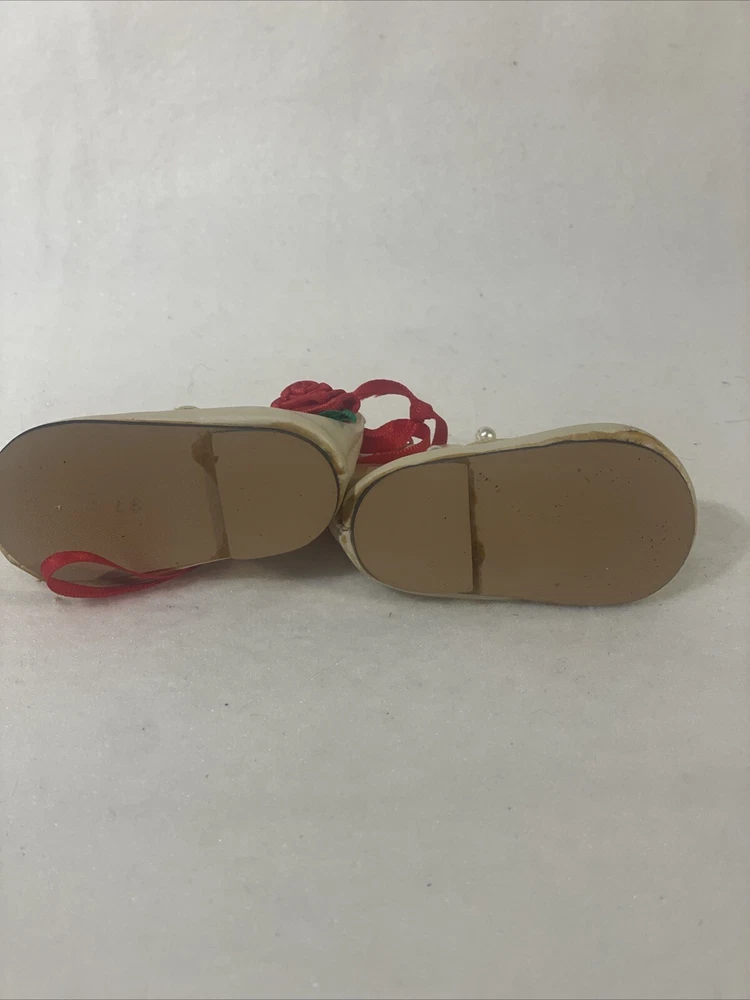 Add a touch of vintage charm to your Christmas ornament collection with these handmade doll shoes ornament. The ivory off white color and pearl like buttons with strap make them a perfect addition to any doll collection. These shoes are small in size, but the length and width can be seen in the pictures provided. The shoes are made with a stitch and glue production technique and are antique with a vintage style. They are suitable for any recipient over 18 years of age and are a unique addition to any collection. These shoes are a perfect gift for anyone who loves collecting vintage ornaments.