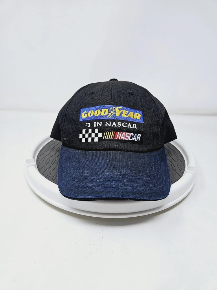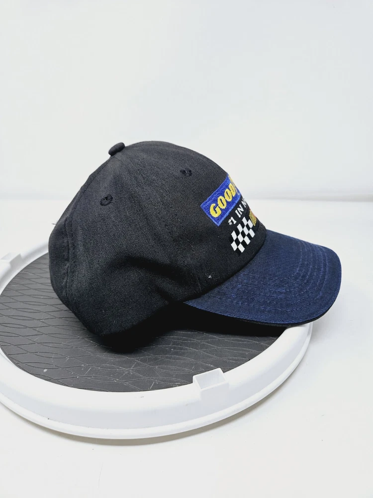 Brand: K-Products Fabric Type: Canvas UPC: Does not apply Occasion: Casual Adjustment Type: Strapback gtin13: Does not apply Style: Snapback Color: Black Size: One Size Material: Cotton Vintage: Yes Pattern: Solid Department: Men Theme: Nascar Goodyear Racing, USA, Cars Modified Item: No Country/Region of Manufacture: United States Character: Blue Features: Nascar Logo Goodyear Logo Checkered Flag