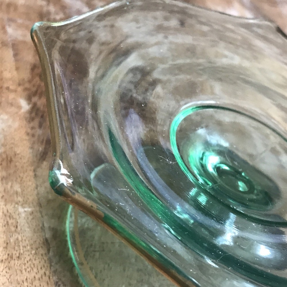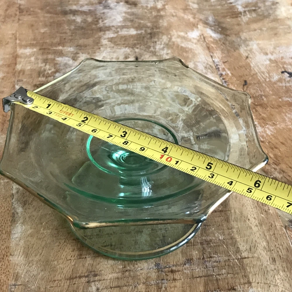 This is a vintage octagon-shaped candy dish with a pedestal base. The dish has a green color and a gold-tone rim. It measures 6 inches in diameter and is made of glass. The brand is unmarked and it is a rare collectable item.