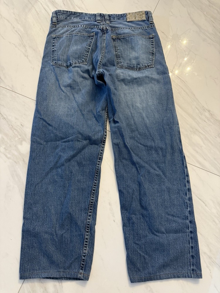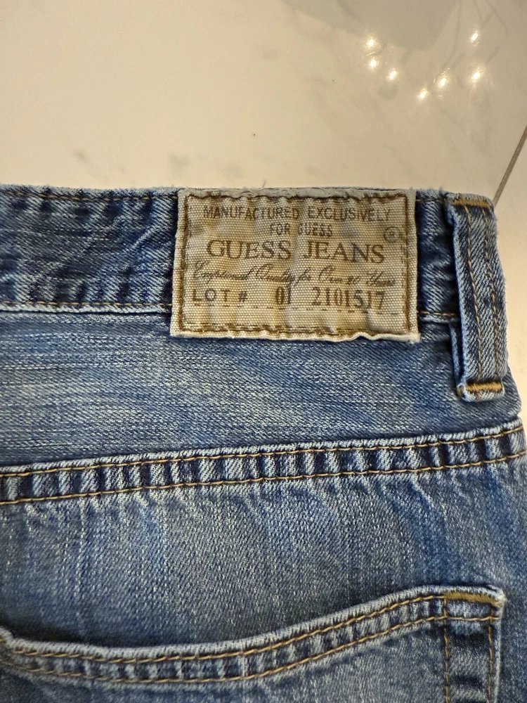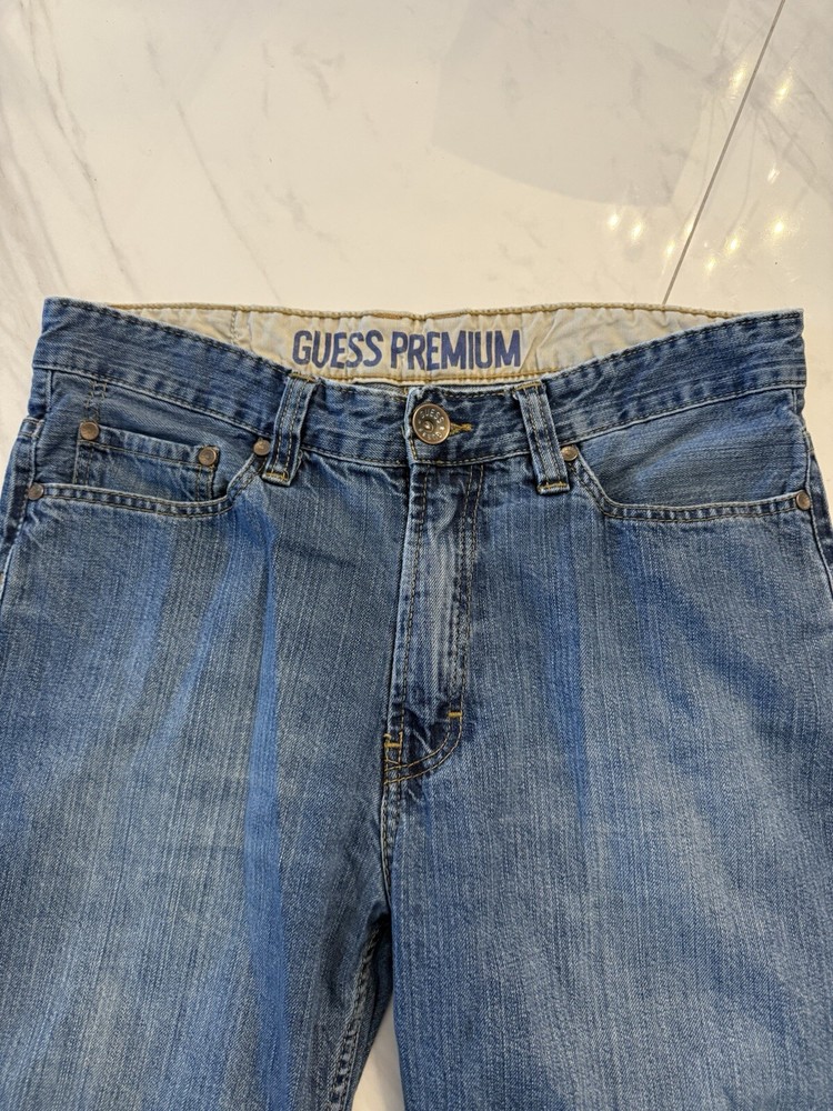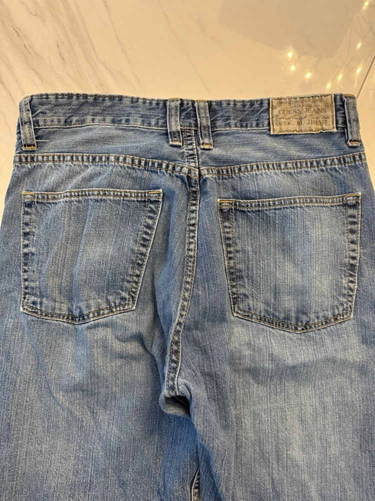 Department: Men Type: Jeans Inseam: 30 in Closure: Zip Fit: Relaxed Color: Blue Pattern: Solid Handmade: No Garment Care: Machine Washable Fabric Wash: Medium Personalize: No Style: Wide-Leg Season: Fall, Spring, Summer, Winter Features: Comfort, Distressed, Easy Care, Pockets Material: Cotton Waist Size: 34 in Country/Region of Manufacture: United States Vintage: Yes Size: 34 Size Type: Regular Pocket Type: 5-Pocket Design Brand: GUESS Theme: 90s, Cowboy, Grunge, Hip Hop, USA, Western, Baggy, Wide Leg, Faded, Skater Fabric Type: Denim Accents: Button, Logo, Zipper