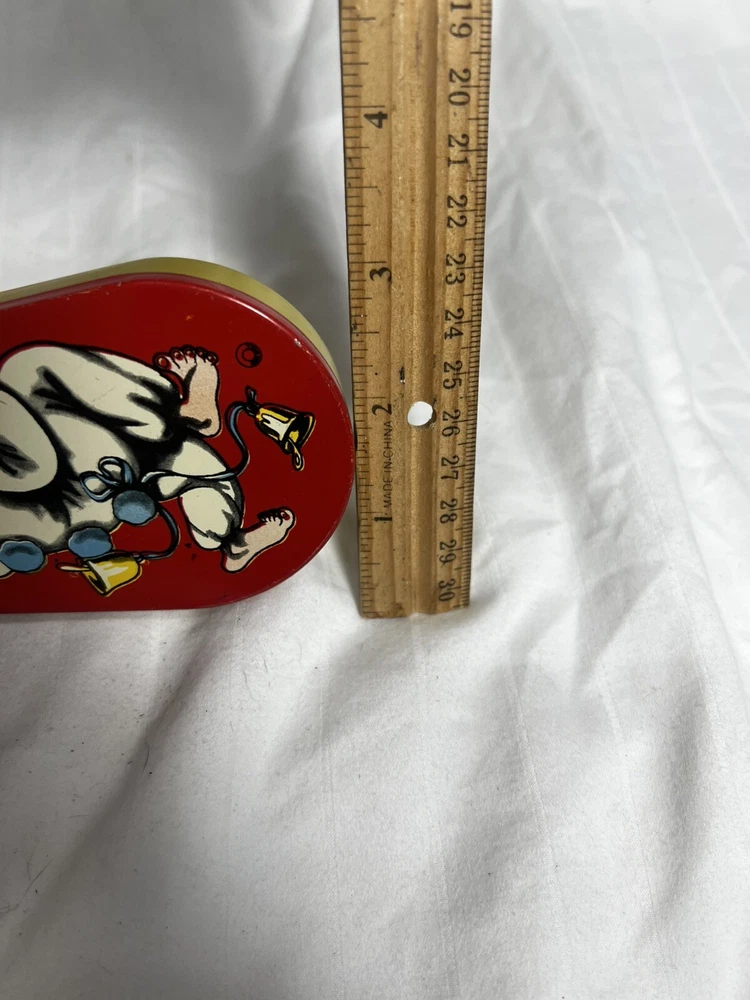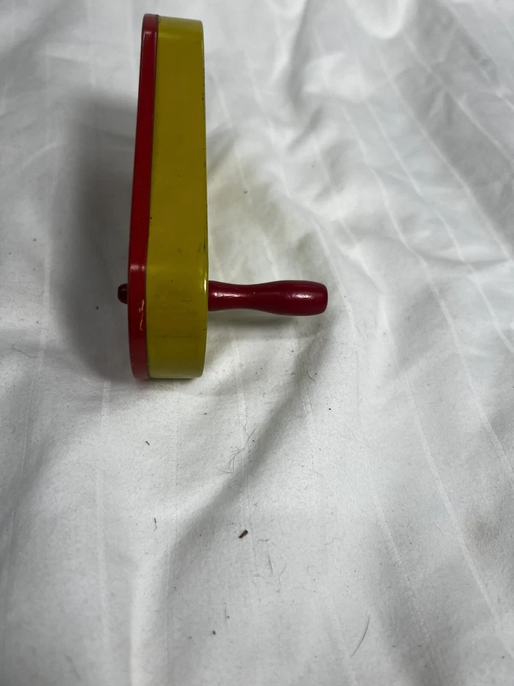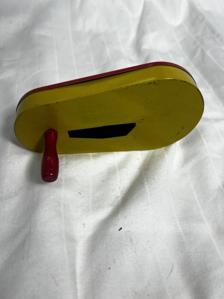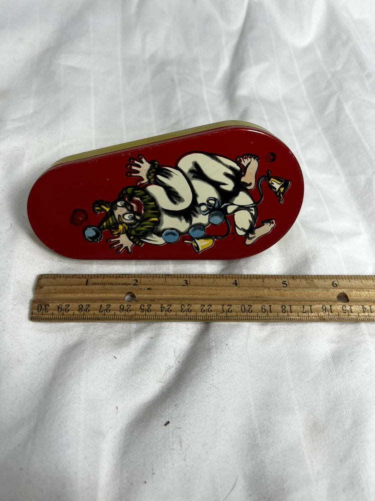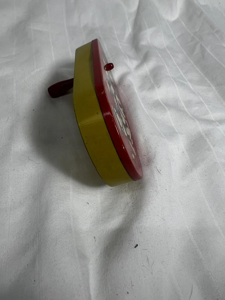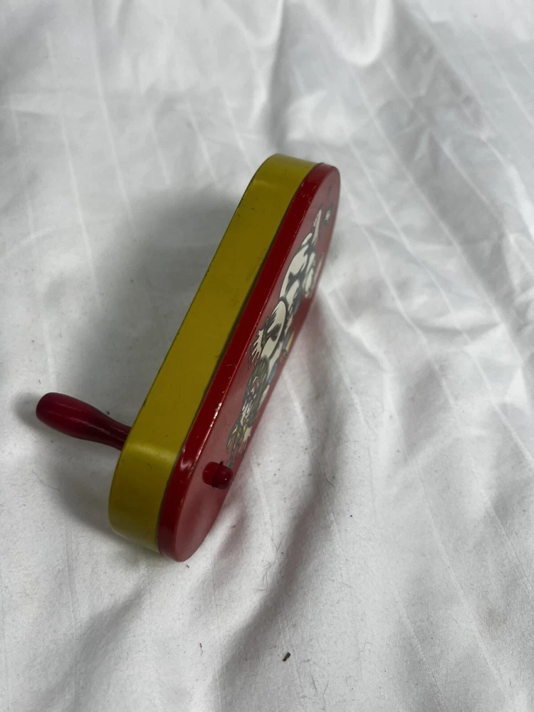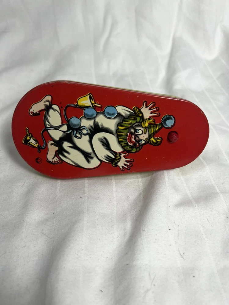This vintage Halloween noisemaker is sure to delight any young trick-or-treater. Featuring a colorful circus clown design, this small tin litho toy spins and clacks with a red wooden handle. Made in the United States in 1940, this original piece is a perfect addition to any Halloween decor or collection. Measuring 5 inches in length and 2.5 inches in width, this noisemaker is suitable for kids aged 5-12 years old. The toy is perfect for Halloween occasions and is sure to scare off any unwanted visitors with its spooky design. Add a touch of 1950s charm to your Halloween decor with this unique and original noisemaker.