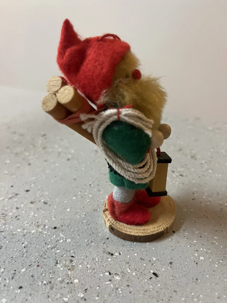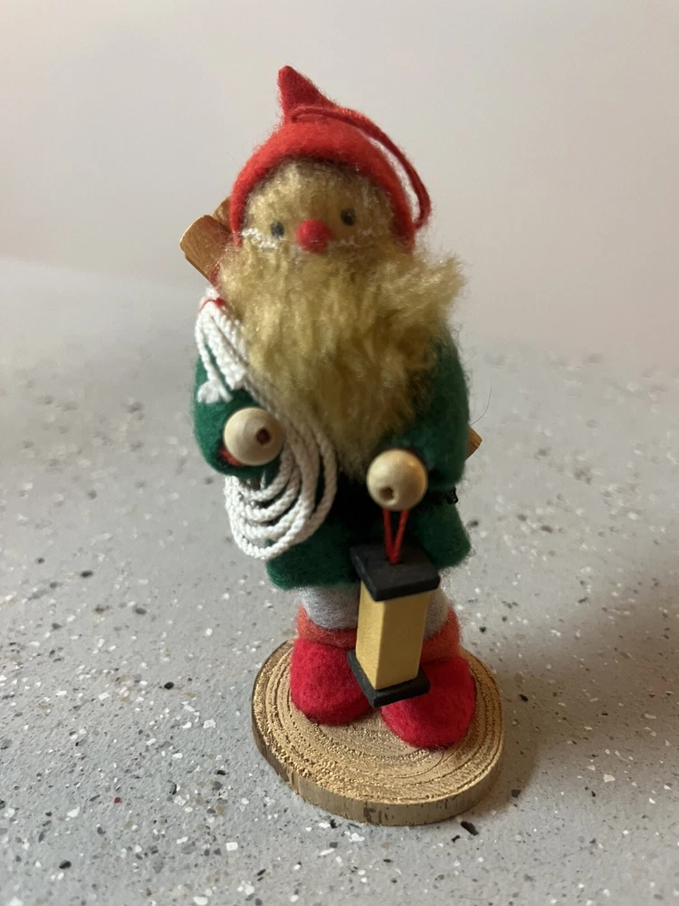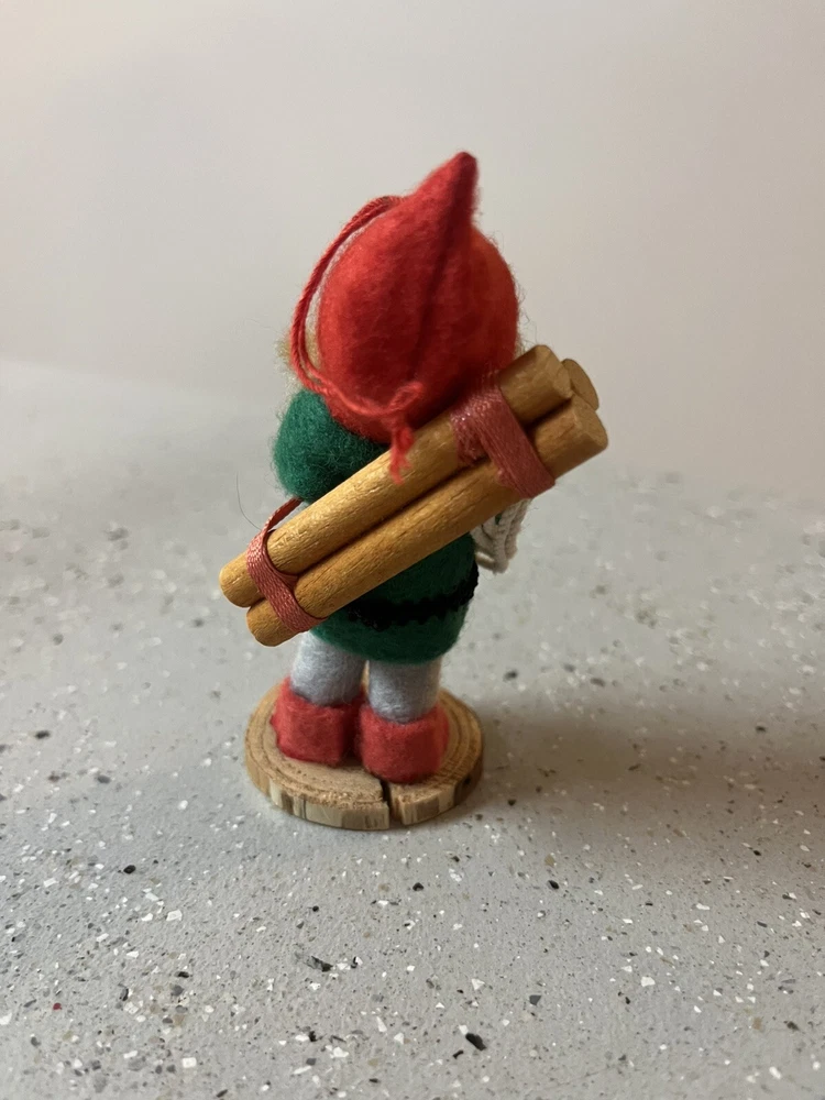 Add a touch of whimsy to your holiday decor with this charming vintage handmade gnome ornament. Dressed in a handcrafted Nordic green coat with intricate wood detailing, this delightful elf is sure to enchant any Christmas collection. With a height of 3 inches, it perfectly captures the rustic design and hand-painted details that bring its character to life. This unique ornament is a single piece that embodies the spirit of the season. Celebrate Christmas with this one-of-a-kind felted woodlands gnome, an elegant addition to your festive decorations. It's not just an ornament; it's a piece of art that represents the joy and magic of the holiday.