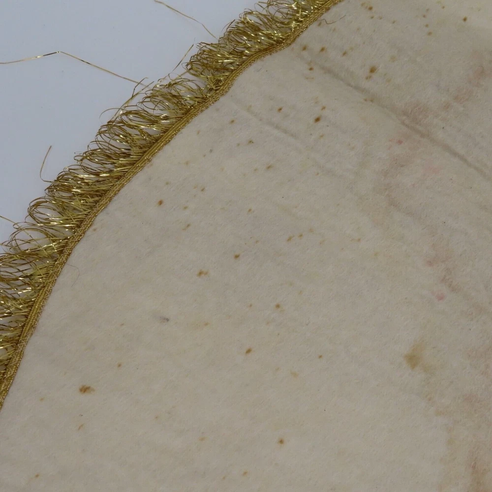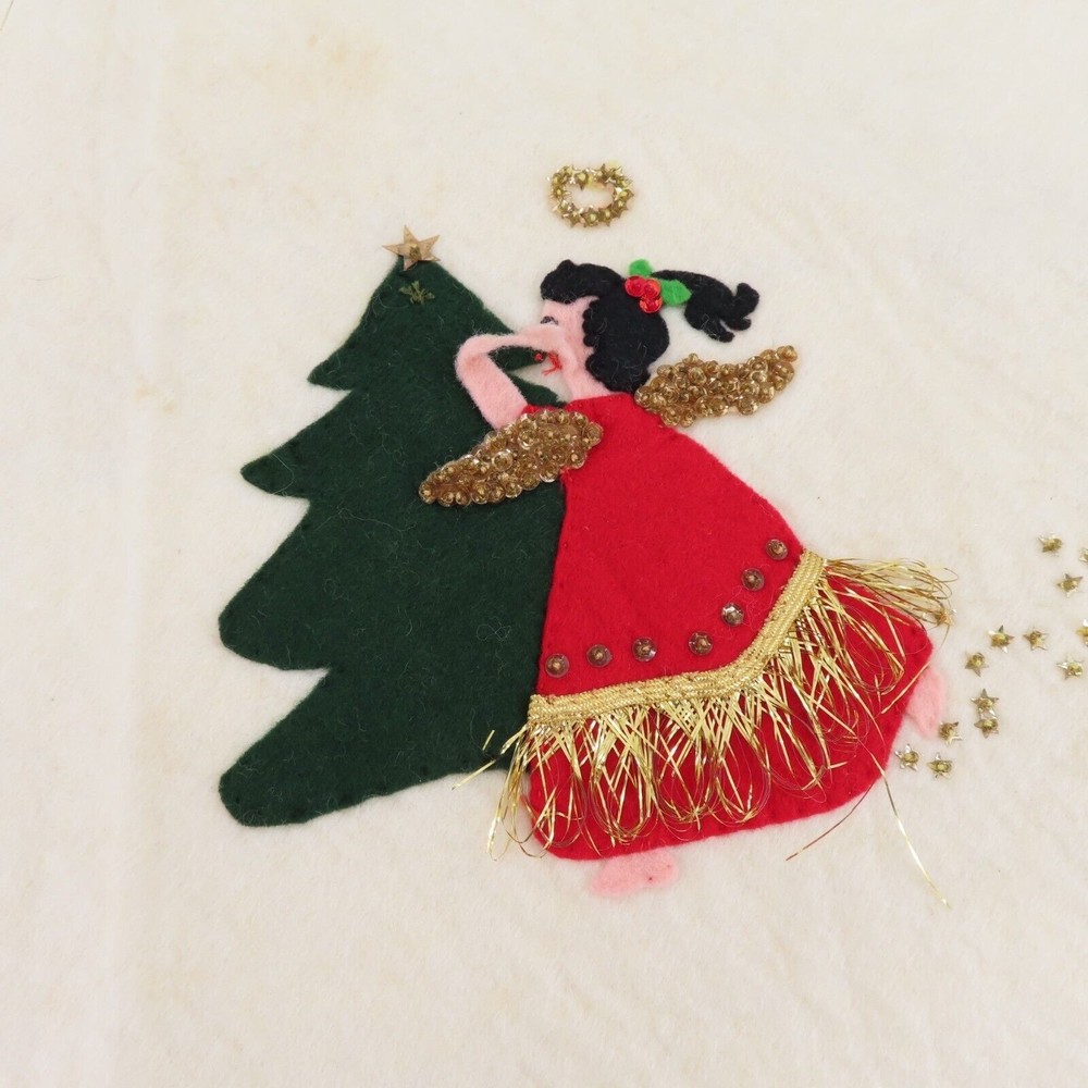 Vintage handmade felt tree skirt Diameter: 37" **measurements are approximate, taken with item laying flat Condition: used, surface wear/stains throughout- see photos, smoke free home Please review all photos closely as these will be the best description of the item. Thank you for shopping!