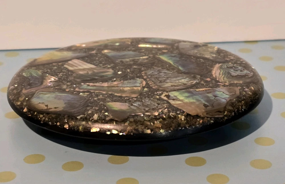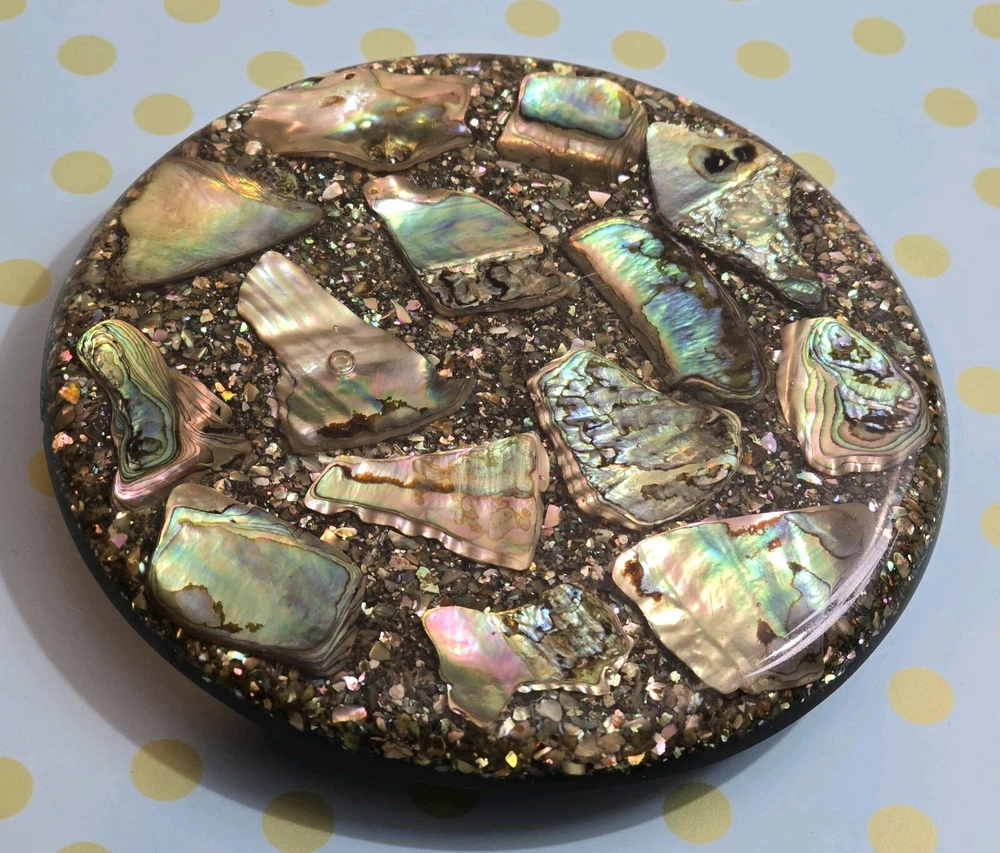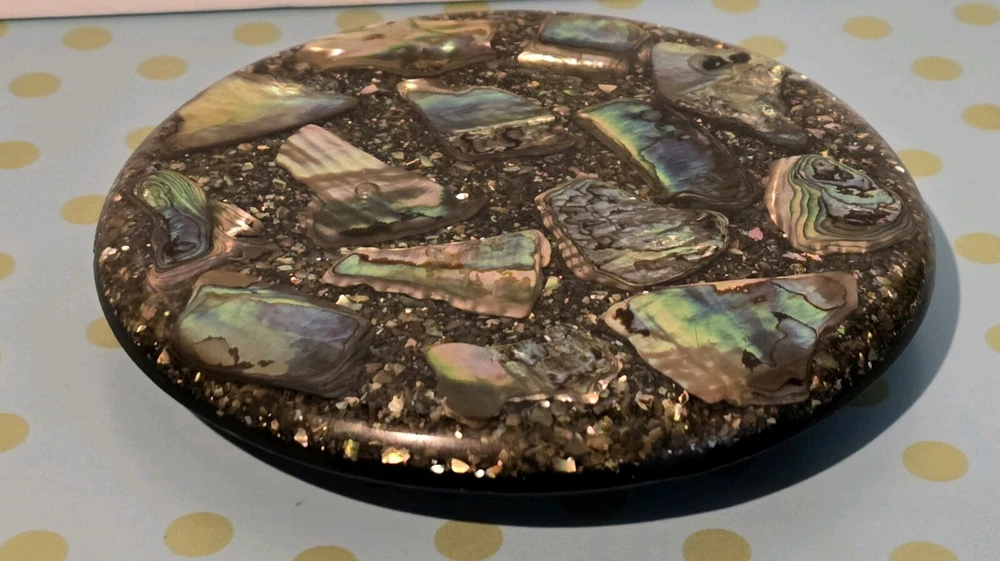 VTG Handmade Betty's Shells, Abalone Shell & Lucite Round 5.5" Footed Trivet