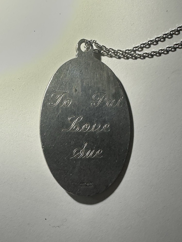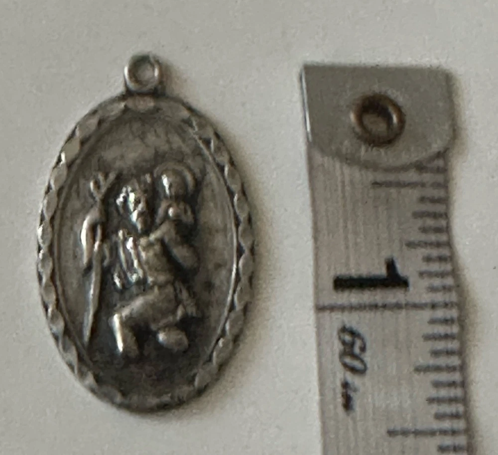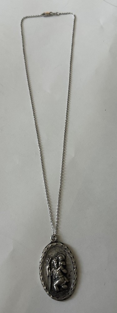 The product is a vintage Hayward sterling silver 18" St. Christopher Catholic pendant necklace weighing 12.49g. The pendant is oval in shape, signed by the brand, and features a lobster closure. It is suitable for occasions such as Christmas, anniversaries, and birthdays, with a religious theme engraved on the medal-like pendant. Made from sterling silver with a metal purity of 925, this pendant necklace is a fine jewelry piece for those looking for a meaningful and elegant accessory. This Vintage St. Christopher sterling silver medal and dainty chain are in very good condition with some overall wear. There is a gift engraving on the reverse. See all photos as this item is sold in as is condition.