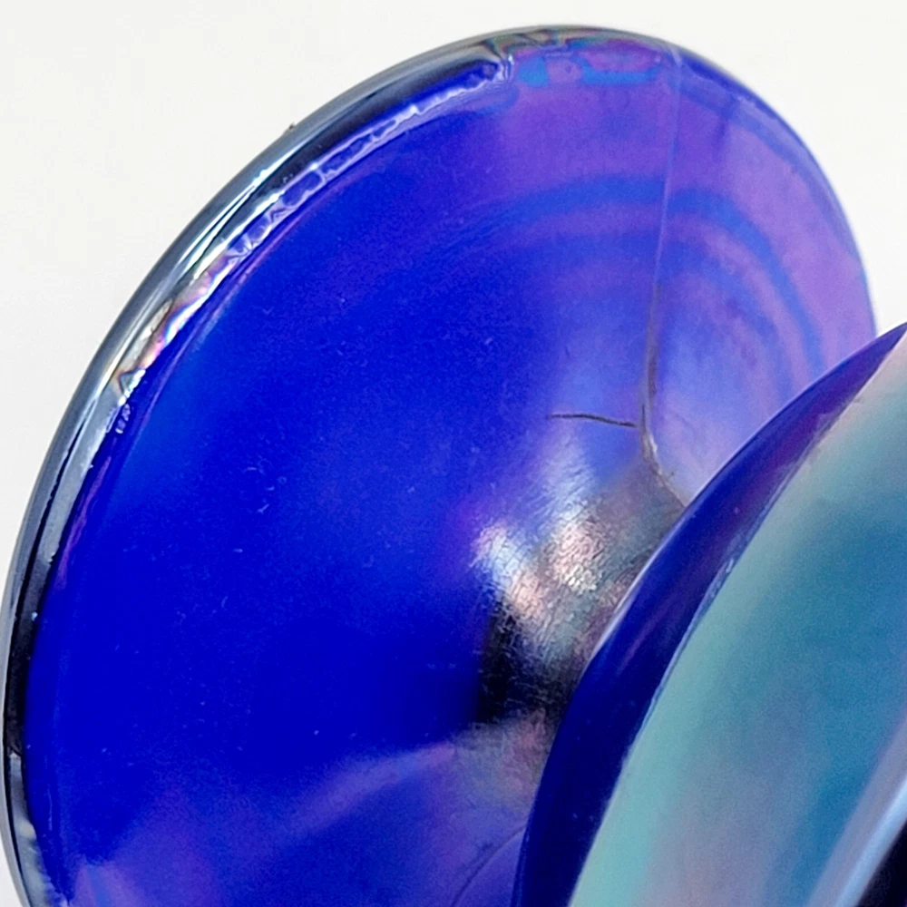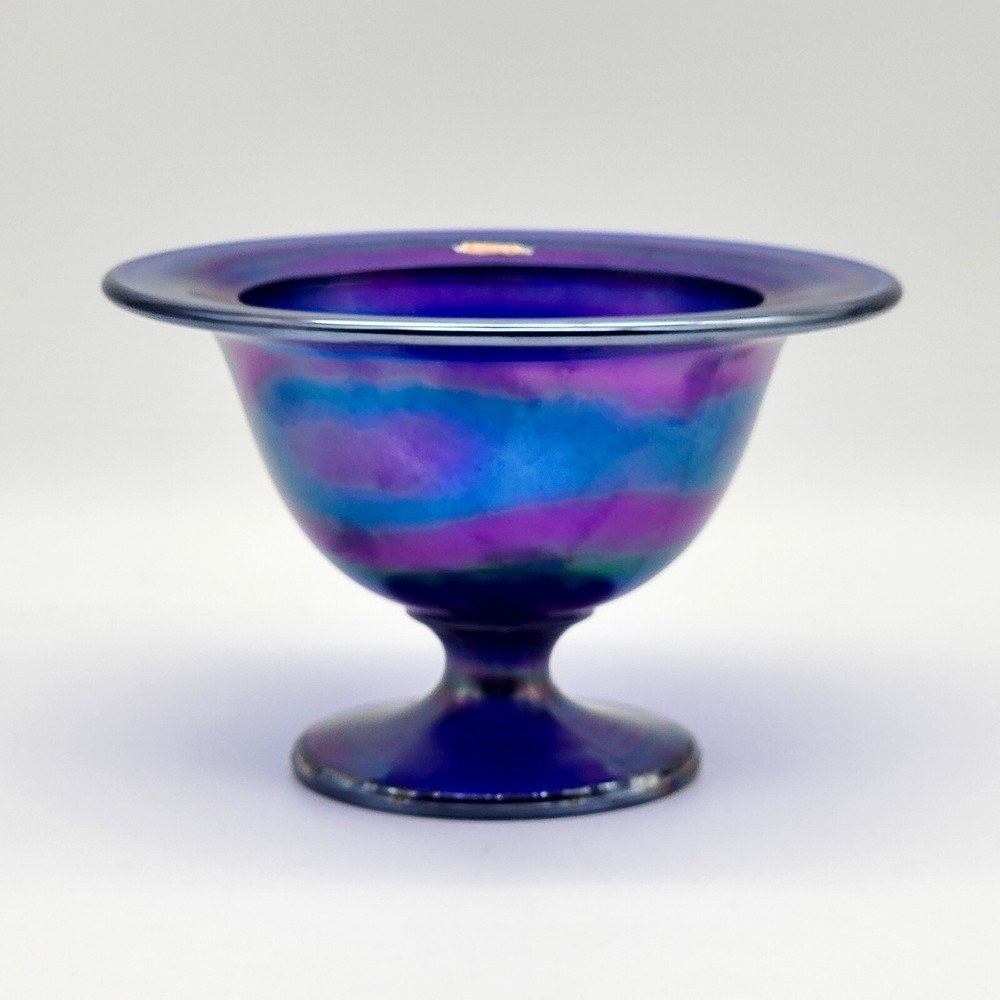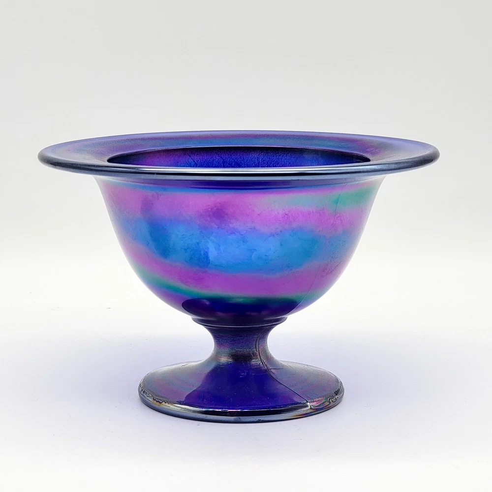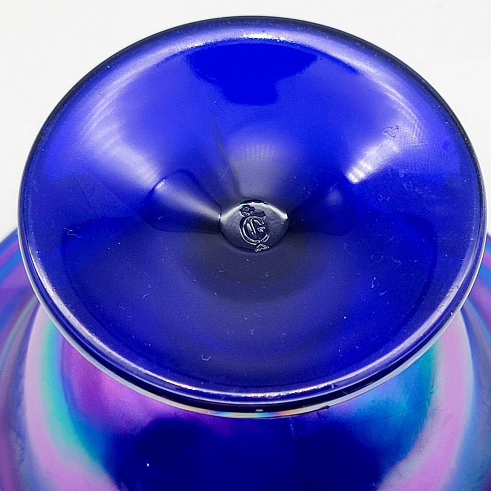 This bowl's got more flair than your grandma's Sunday hat collection. The iridescent colors stretch like they’re trying to escape, but that foot just won't let them. It's perfect for holding fruit or your secret stash of candy that you don't want to share with anyone. • Cobalt blue with iridescent finish • Footed design for stability • Vintage Imperial branding • Ideal apartment-size centerpiece or display item