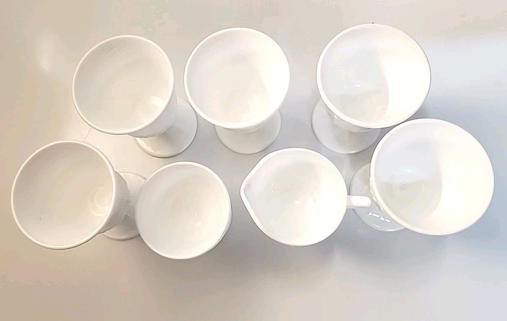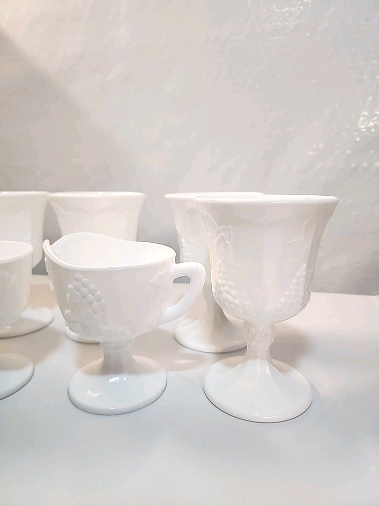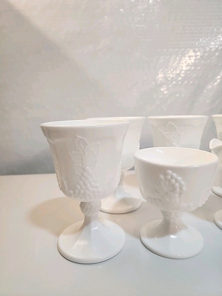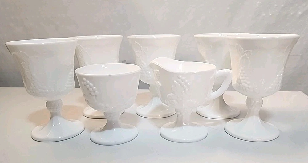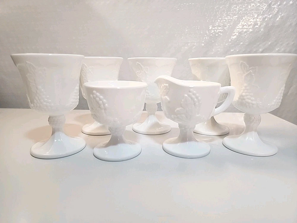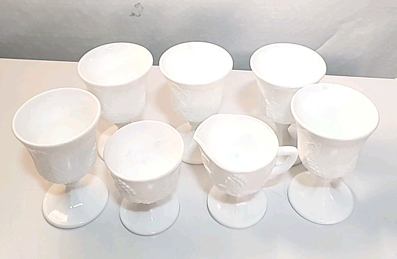 Indiana Colony Harvest Milk Glass 5 Water Goblets/1Sugar/1Creamer set features a charming Harvest Grape pattern, perfect for all occasions. Made of white milk glass with a round shape and decorative grapes, this vintage set is from the 1960s. The 7-piece set includes water goblets, sugar bowl, and creamer. Ideal for collectors or those looking to add a touch of vintage elegance to their drinkware collection.