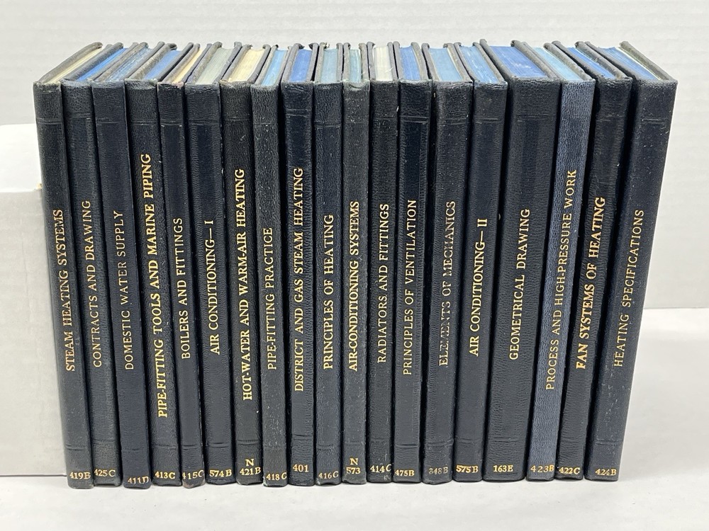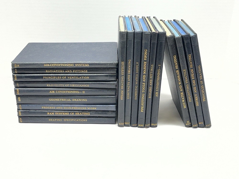 This lot of VTG International Library books includes 20 textbooks covering a variety of subjects such as HVAC, pipe fitting, mechanics, and drawing. Published by the International textbook company, these hardcover books are in English and illustrated. Authored by various authors, the collection is from North America and the United States, making them a valuable addition to any library or collection focusing on skilled trades and industrial topics. Please note: these books were rescued from a musty basement workshop. The bindings are good and the pages are clean and free of writing. Many books have intact fold-out drawings. We also found a small stack of loose drawings that will be included with this lot. The condition of the loose drawings varies from good to poor. Also, two volumes, Elements of Mechanics and Principles of Ventilation, have damaged covers, most likely from being stuck together at some point. See photos. Please message us if you have questions or want to see more photos of a certain volume.
