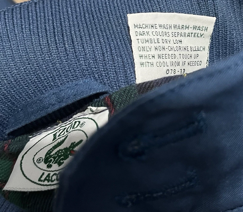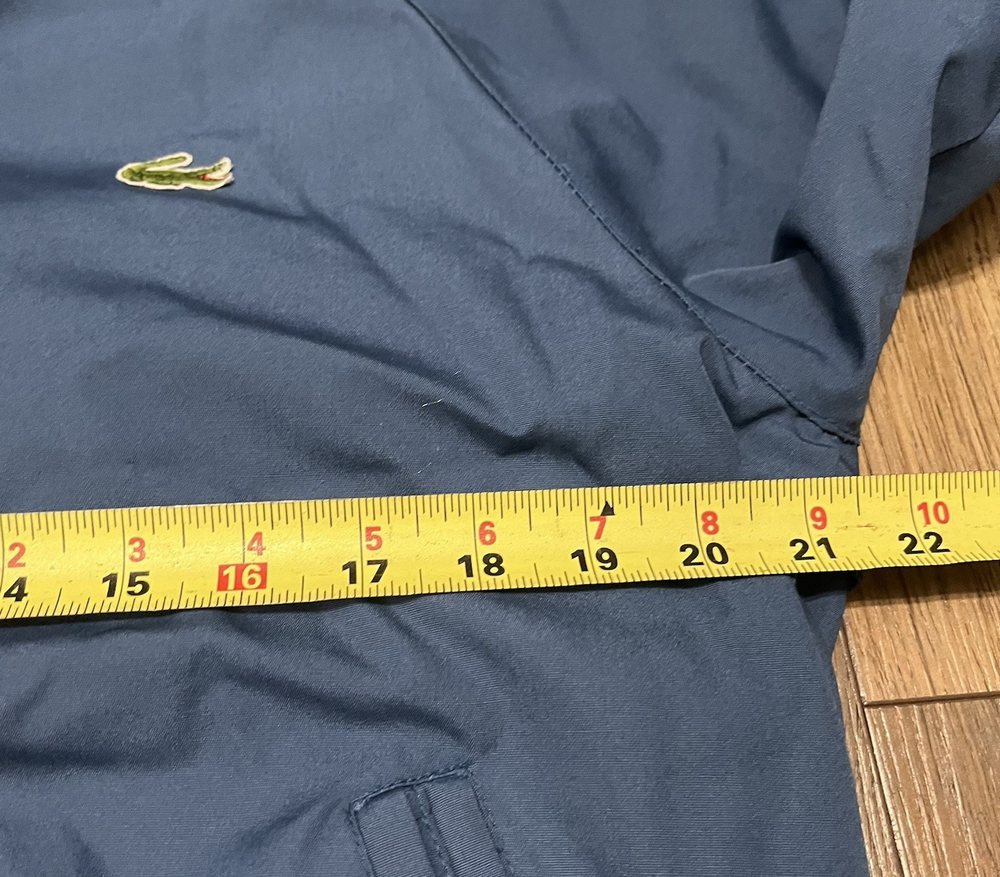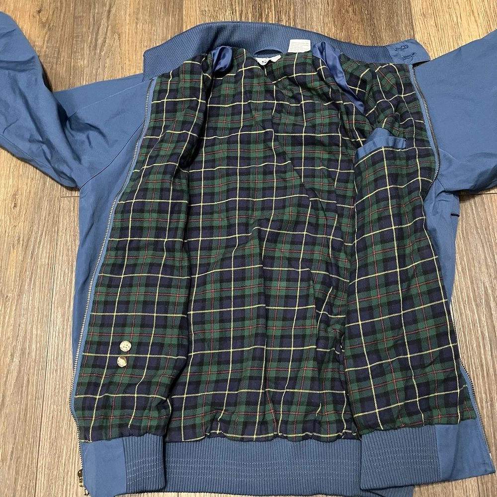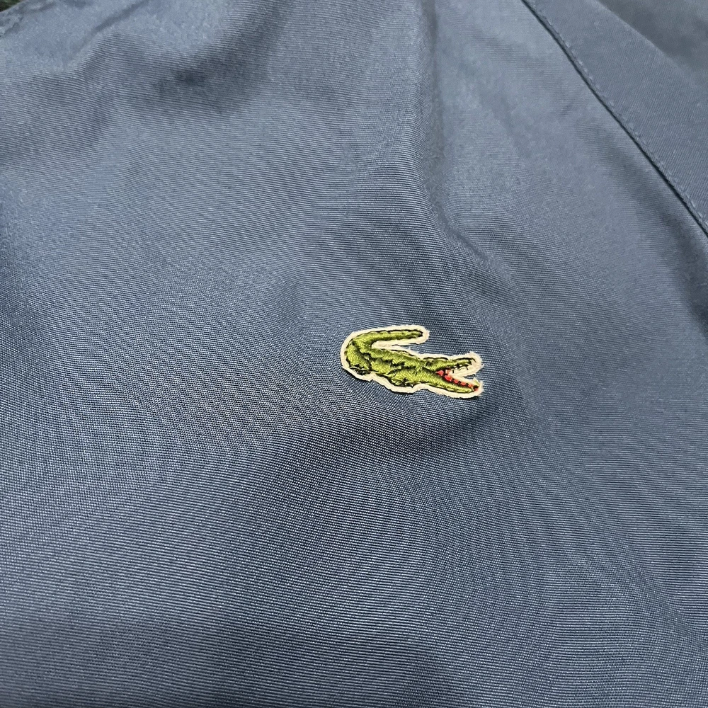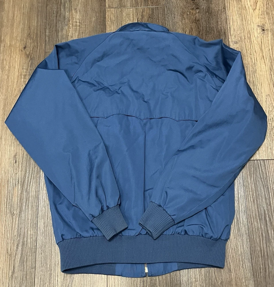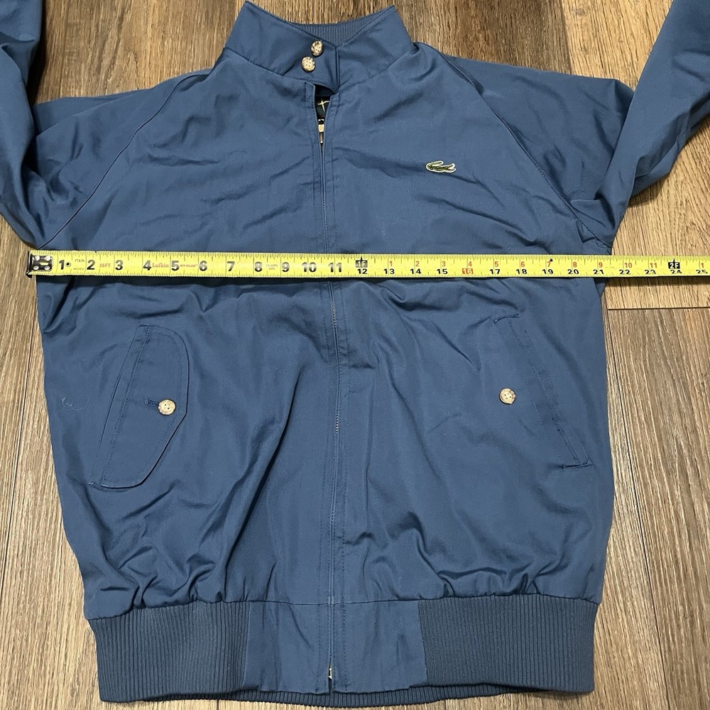 The VTG Izod Lacoste Blue Harrington Bomber Jacket is a vintage men's jacket featuring a classic fit with a stand-up collar and alligator logo accents. Made from a cotton blend outer shell with a cotton lining, this short-length jacket is perfect for various occasions including travel, parties, casual wear, and workwear. The retro 80s style in a blue plaid design adds a touch of nostalgia to this timeless piece, making it a stylish addition to any wardrobe. Machine washable for easy care, this jacket is a versatile and fashionable choice for any season.