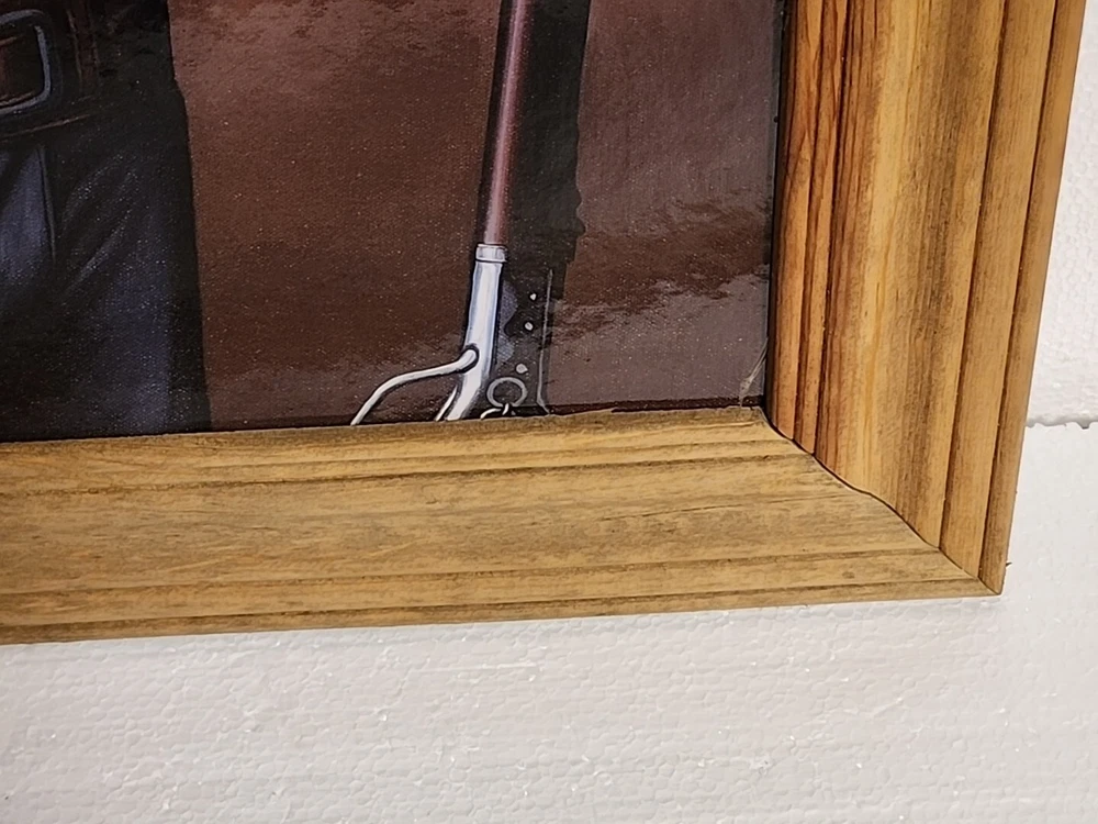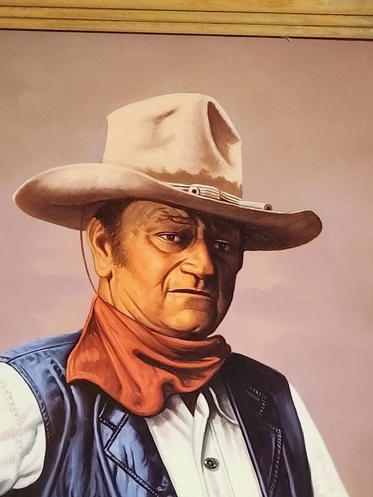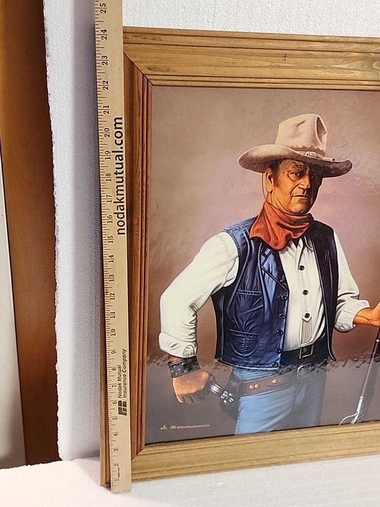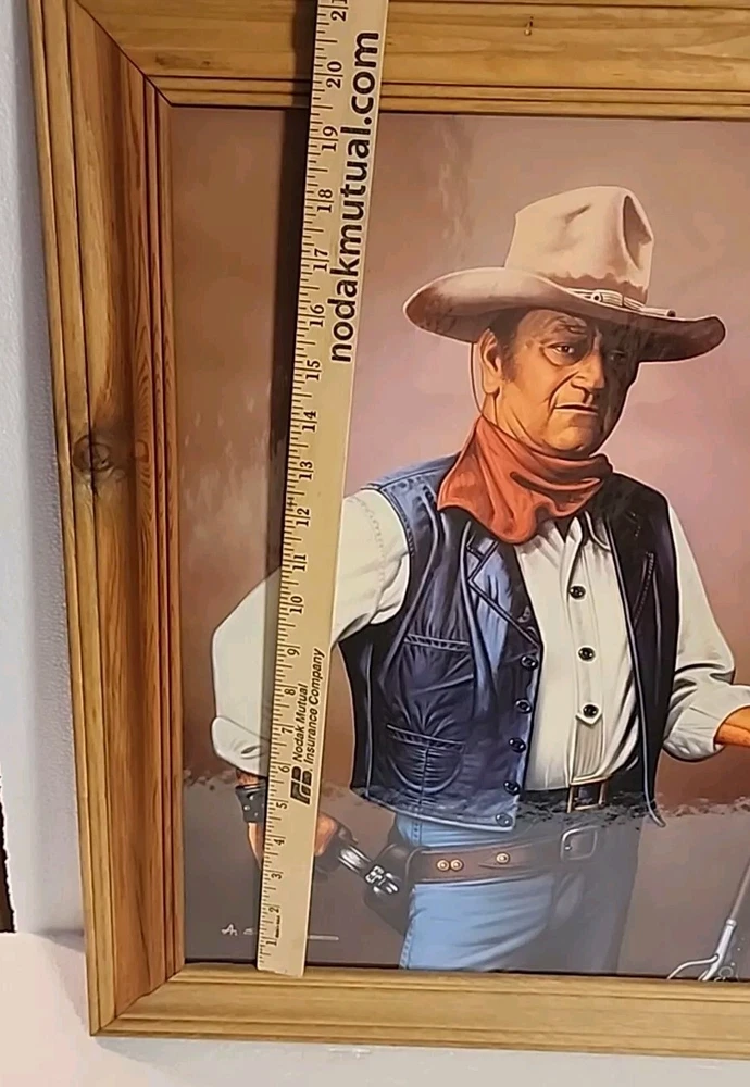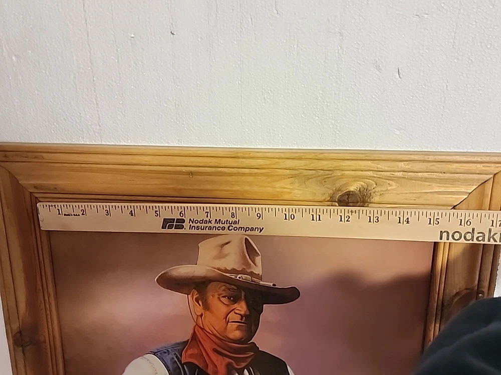 Print or poster? Not sure what to call this. About 16x20" actual print...frame makes it 20x24.5 inches ...see pictures. Corner in far right has kink. Frame real wood...knotty gives the rustic look n of course, John Wayne. From smoke free home of my grandparents farm home. Estate cleaning.