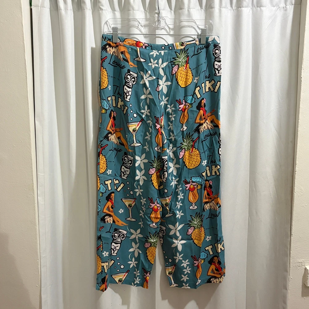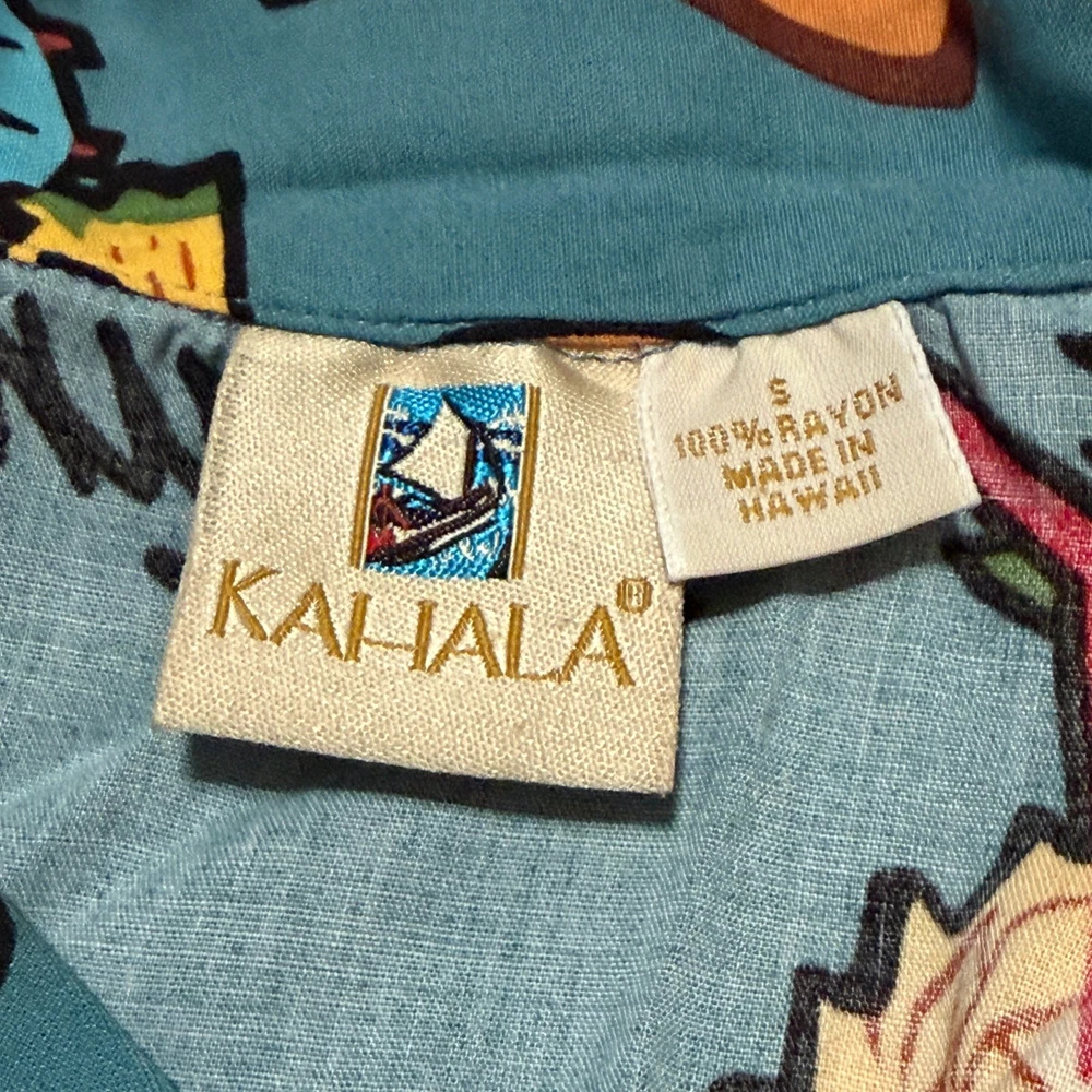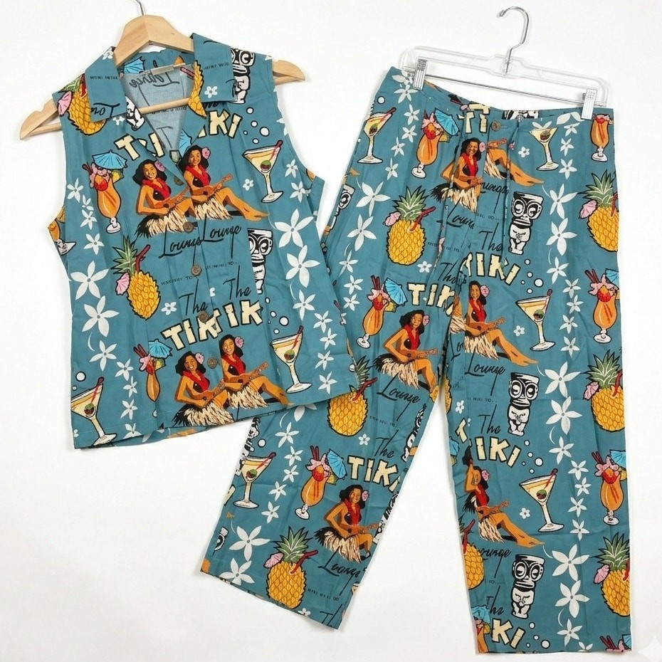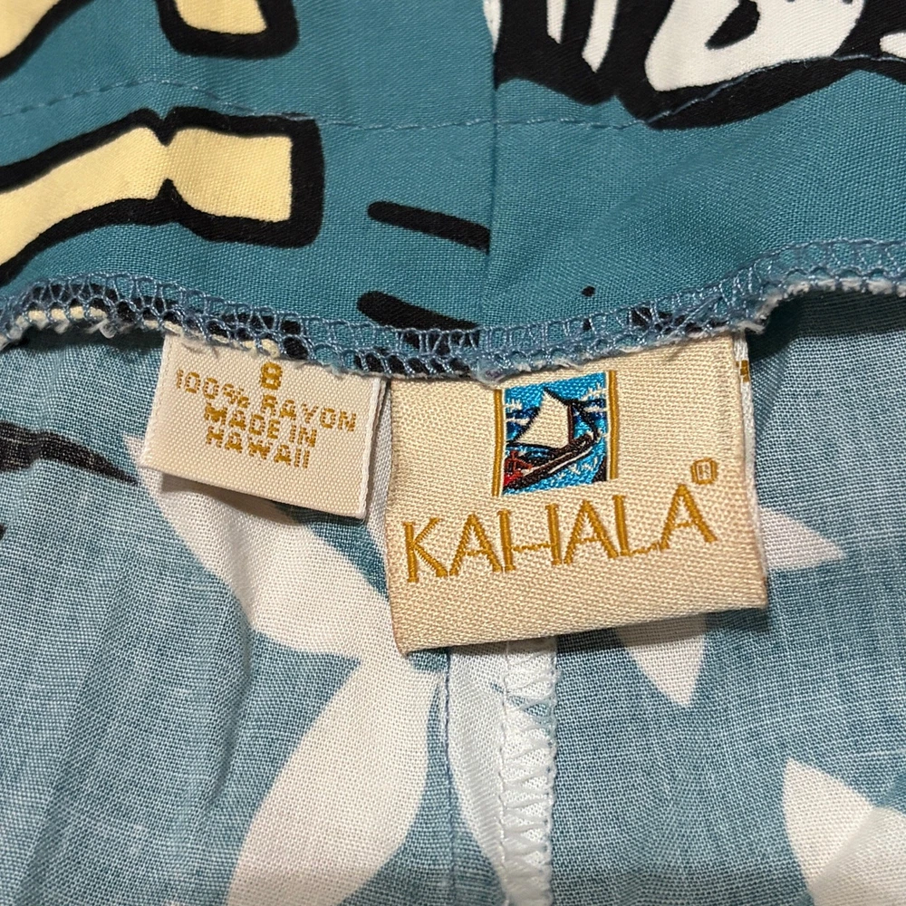 Features: Top - Brand: Kahala - Size: Small - Color: Multicolor - Era: Vintage - Style: Sleeveless, Collared, Button front, Allover print - Material : 100% rayon Measurements: Pit to pit: 17.75 Front length: 21" Shoulder: 12" Features: - Brand: Kahala - Size: 8 - Color: Blue - Era: Vintage - Style: Cropped length, Zip fly with drawstring, Allover print, Wide leg - Material : 100% rayon Measurements: Waist: 31" Inseam: 23.5" Rise: 10.5" Leg Opening: 10.5"