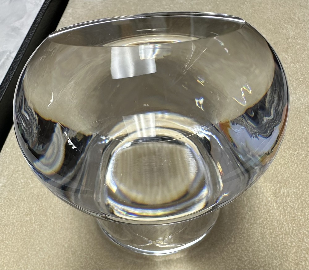 This vintage Kosta Boda paperweight features a clear glass design with an etched bird motif, showcasing intricate artistry by the renowned glass artist Sigurd Persson. The piece is part of the brand's art glass collection, known for its quality craftsmanship and elegant aesthetic. The paperweight is a unique decorative item that adds a touch of sophistication to any space with its delicate bird and nest theme. Meadures 3” tall and 3” wide. Beautiful condition! Proceeds benefit local non profit school. Thank you for looking!