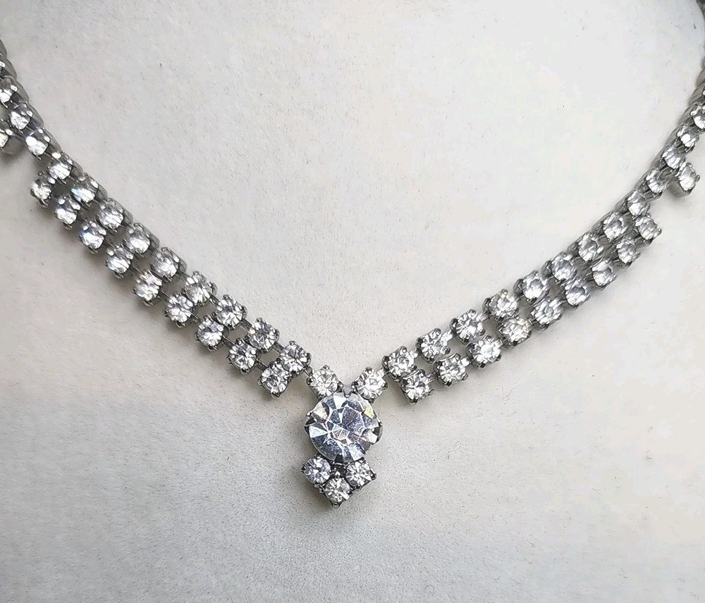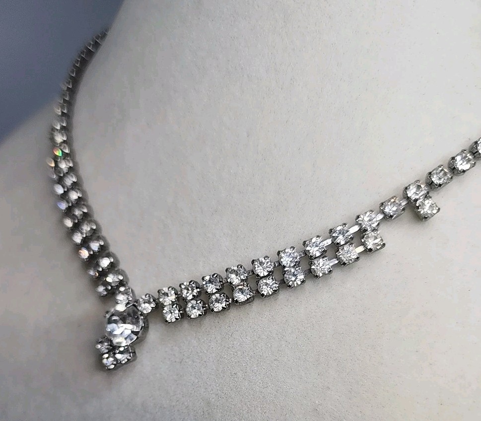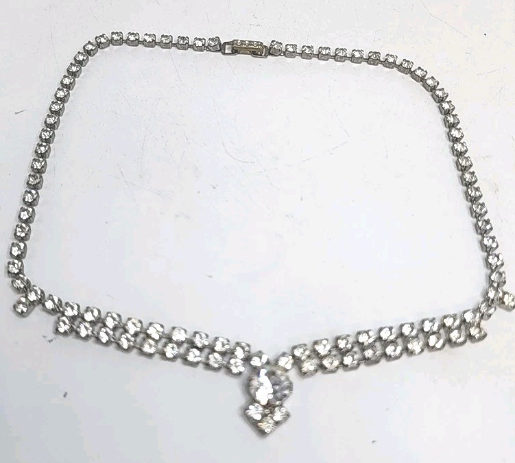 The VTG Kramer Rhinestone Necklace is a stunning vintage piece with a clear faceted crystal pendant on a silver plated chain. Measuring 15 inches in length, this bib choker style necklace exudes elegance and sophistication, making it the perfect accessory for a wedding or special occasion. The prong setting style enhances the brilliance of the rhinestones, adding a touch of glamour to any outfit. This timeless piece from the Kramer brand is sure to become a statement accessory in any jewelry collection.