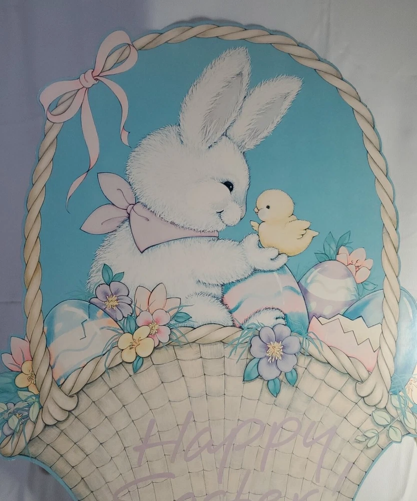 VTG LARGE Easter Bunny With Chicken And Basket Of Eggs Cardboard Cutout 25"x20"