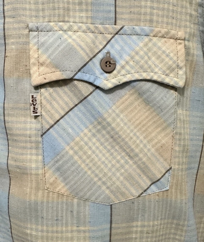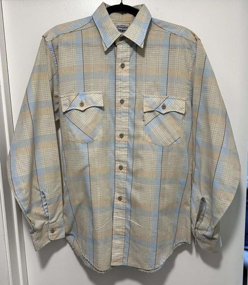 Crafted for the classic fashion enthusiast, this Levi's men's casual button-up shirt blends timeless style with modern comfort. The shirt showcases a tasteful blue plaid pattern, complete with a spread collar and button accents that evoke a Western retro vibe. It's designed with a versatile long-sleeve cut and a regular fit to suit any casual occasion, ensuring both style and ease. The shirt is made from a durable blend of cotton, polyester, and cotton blend fabrics, providing a lightweight feel that's ideal for all seasons. With a chest size of 44 inches, it's machine washable for easy care and features practical pockets for functionality. Whether it's fall, spring, or winter, this piece is a reliable addition to your wardrobe, celebrating the fusion of classic design and contemporary living. In Good Condition. Some normal wear. See photos Tape Measurements: Armpit to Armpit: 22” (Chest: 44”) Shoulder to Shoulder: 18.5” Shoulder to Bottom Hem: 26” Sleeve Length (from center back collar): 35”