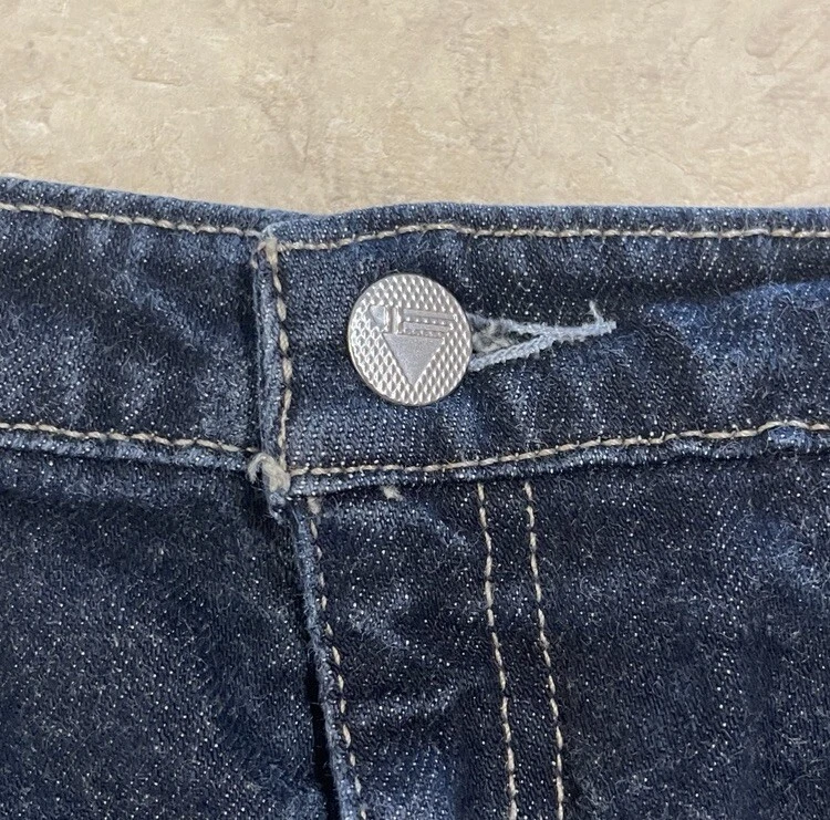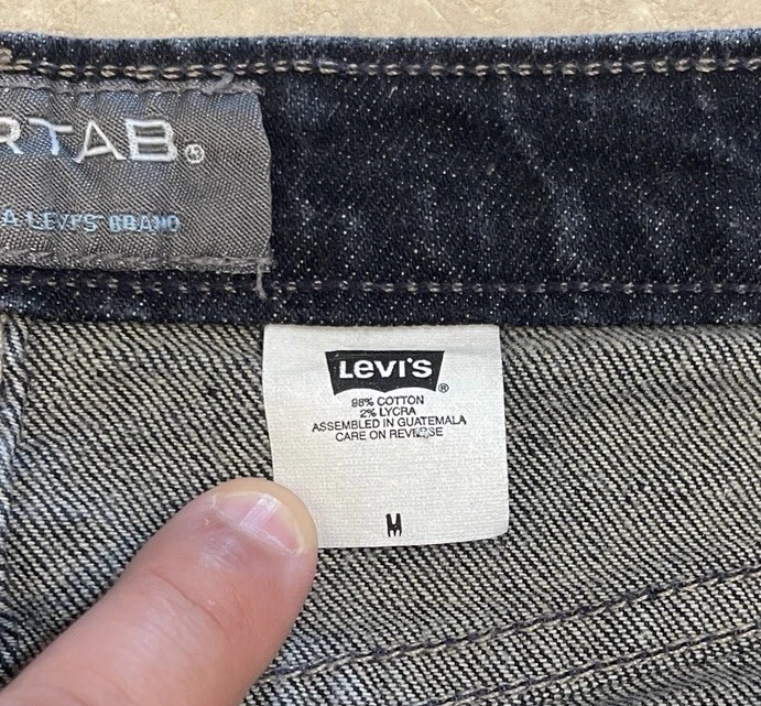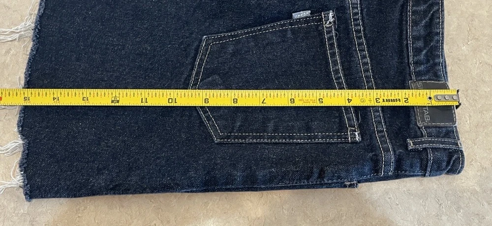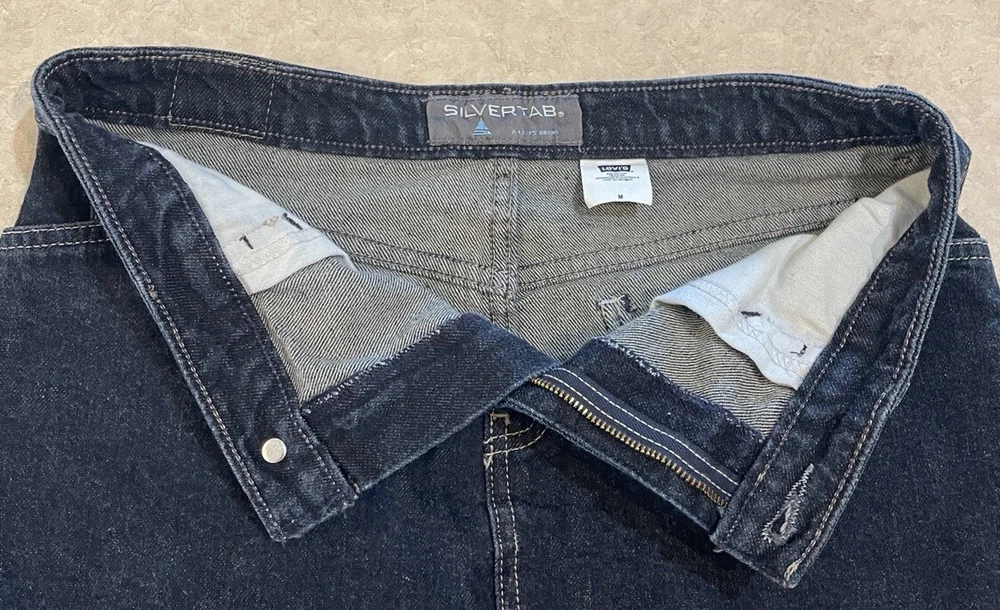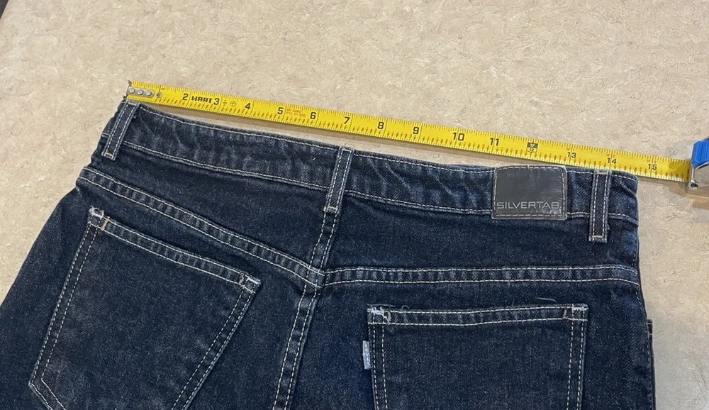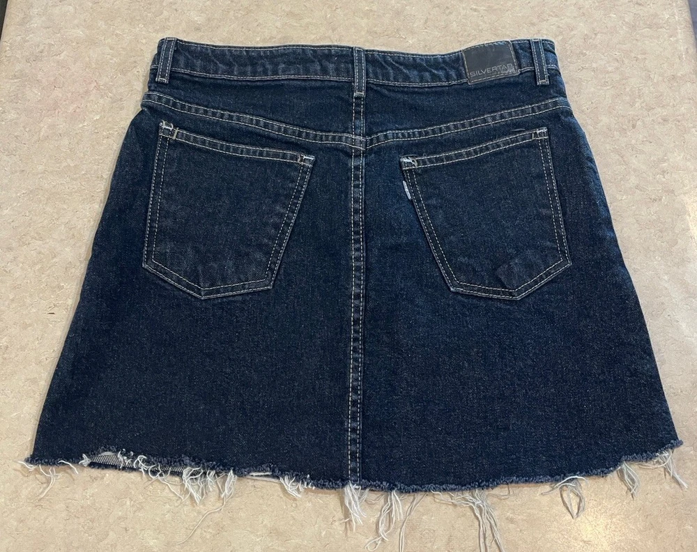 This vintage Levi's Silver Tab denim skirt is a unique addition to any wardrobe. The dark wash and solid pattern make it a versatile piece, while the high rise and cutoff features give it a stylish edge. Made from cotton denim fabric, this mini skirt is both comfortable and durable. The skirt is a size medium and features a metal theme, with Levi's branding on the back pocket. It has a unit quantity of 1 and is made in Guatemala. This skirt is perfect for anyone looking for a statement piece that can be dressed up or down. This skirt is in good preowned condition, with little sign of wear. Please see ALL photos for a better idea on condition, any measurements, or details to the skirt.