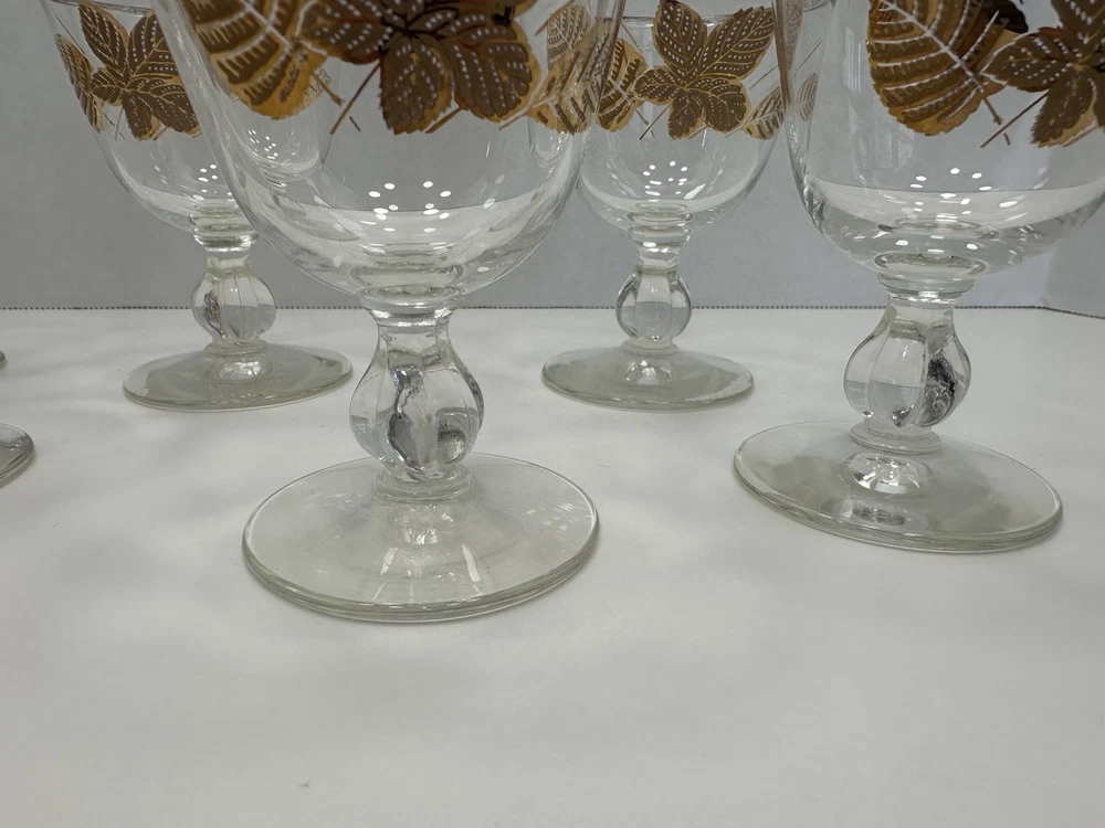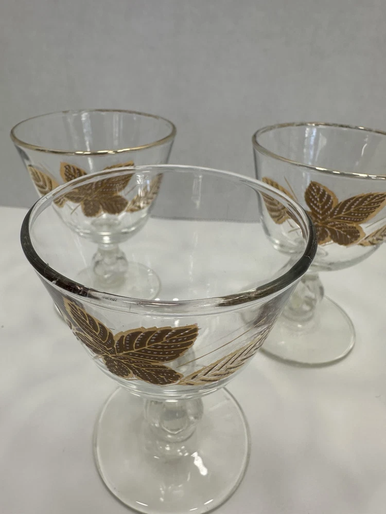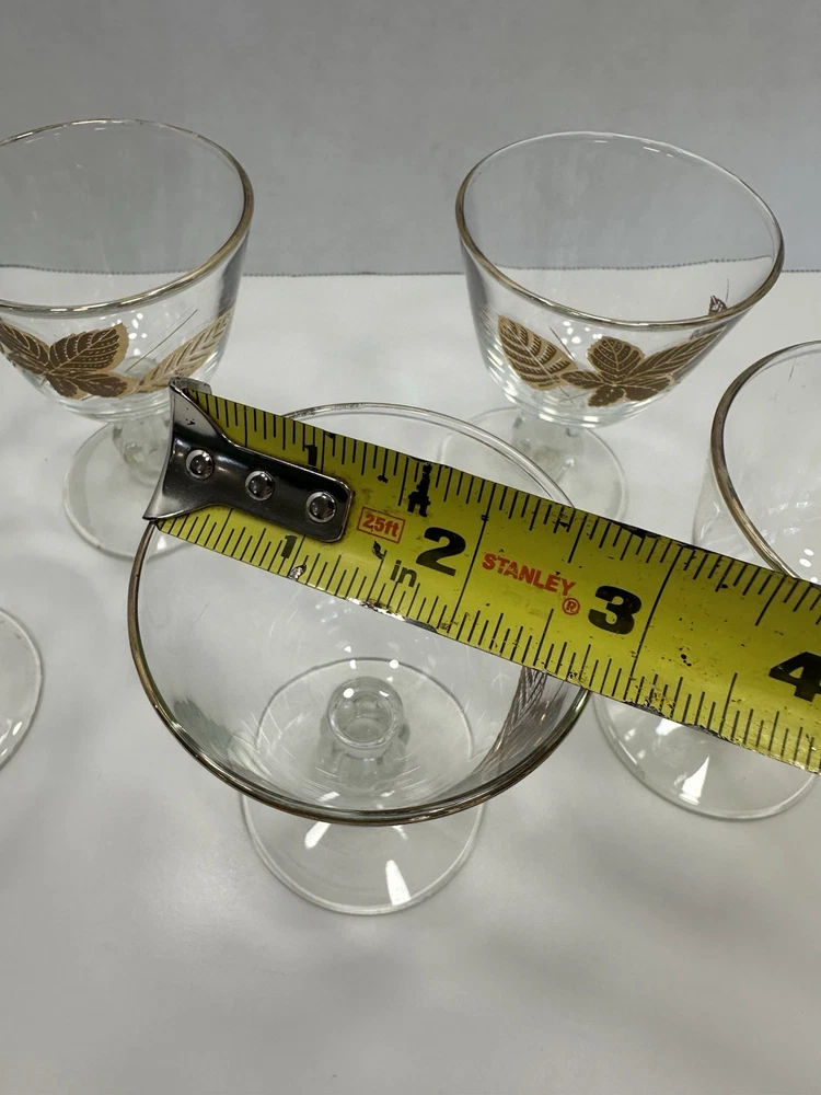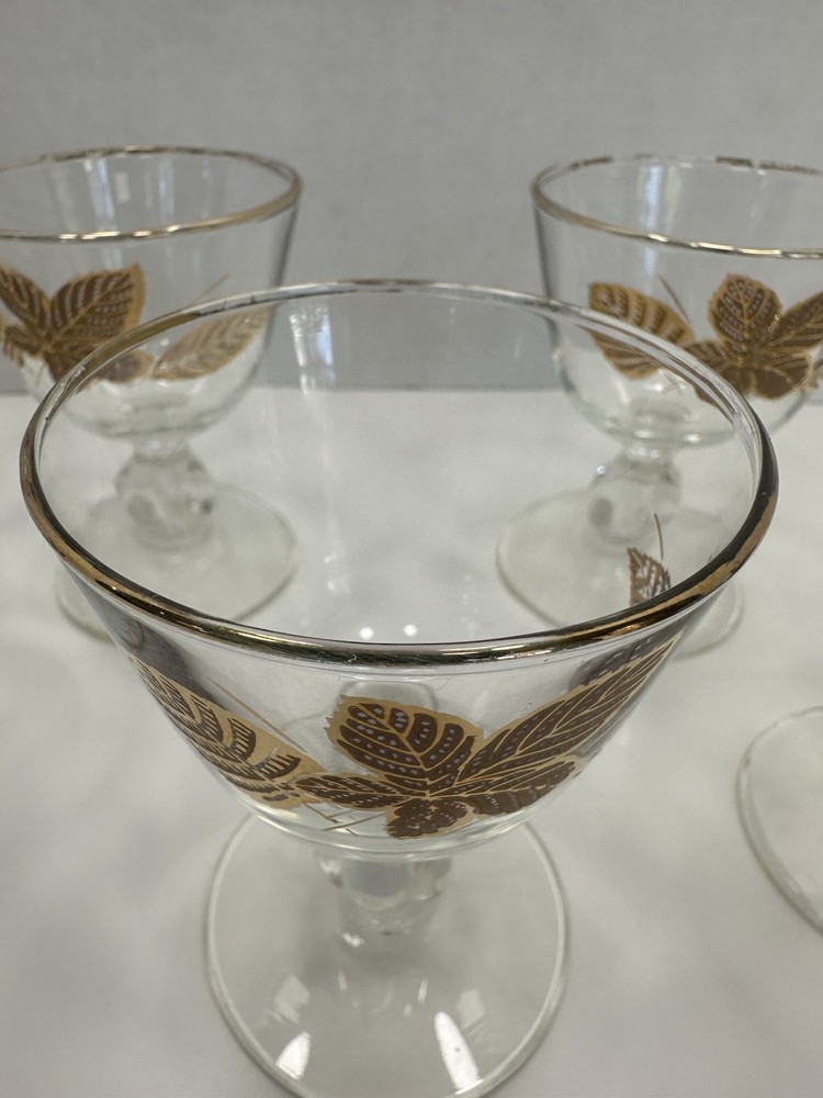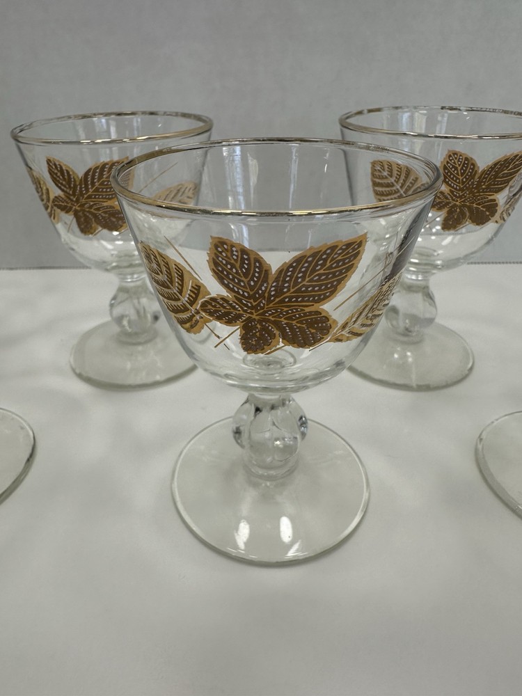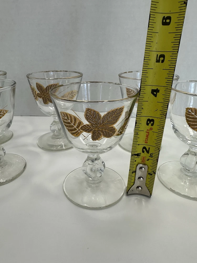 Care Instructions:Hand Wash OnlyFinish:GlossyMaterial:GlassType:Champagne GlassItem Height:3.75 inchDepartment:Unisex AdultsOriginal/Licensed Reproduction:OriginalSigned:NoHandmade:NoFeatures:DecorativeProduction Style:Elegant GlassVintage:YesOccasion:Fall, All OccasionsNumber of Items in Set:Six-PiecePattern:Seasons LeavesCountry/Region of Manufacture:United StatesProduction Technique:Fused GlassShape:RoundTime Period Manufactured:1960-1969Brand:LibbeyItem Diameter:2.75 inchItem Weight:5 lbColor:GoldTheme:FloralStyle:Mid-Century Modern