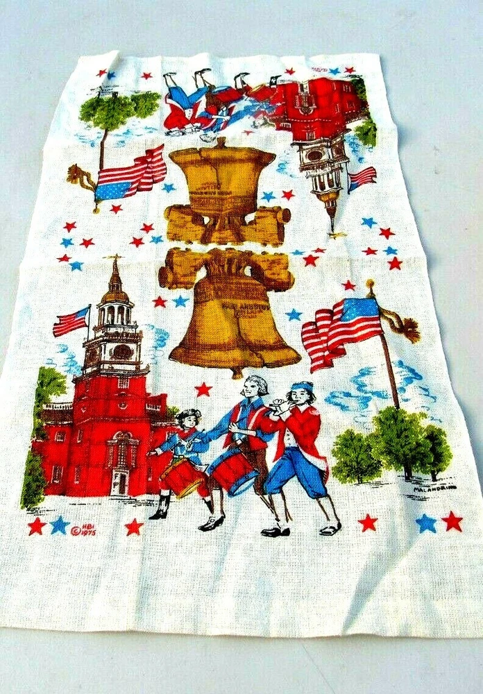 VTG Liberty Bell Linen Towel Patriot Minute Man Drum and Fife American Flag 1975 I believe that this was made to celebrate the Centennial Celebration that would have been in 1976