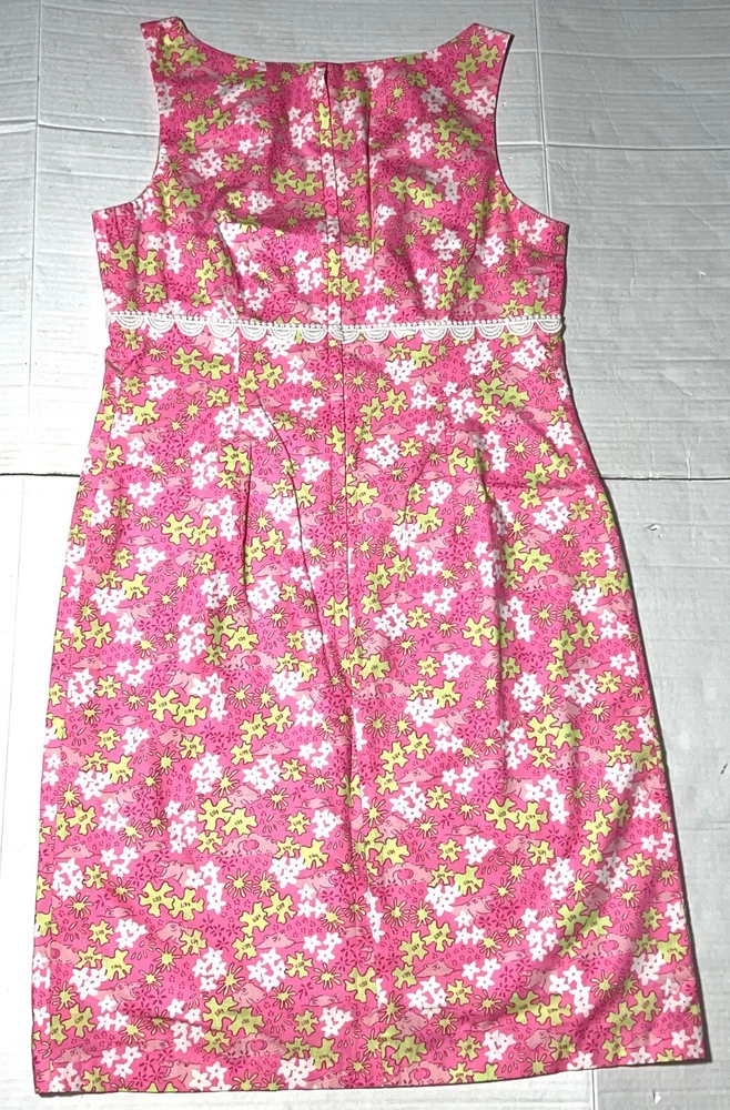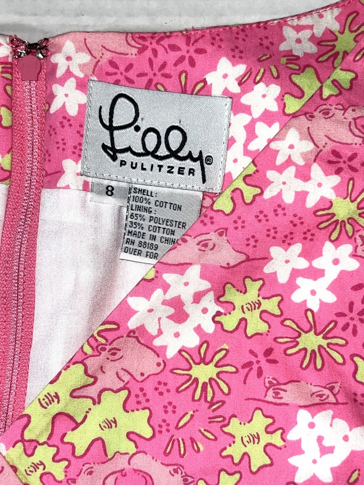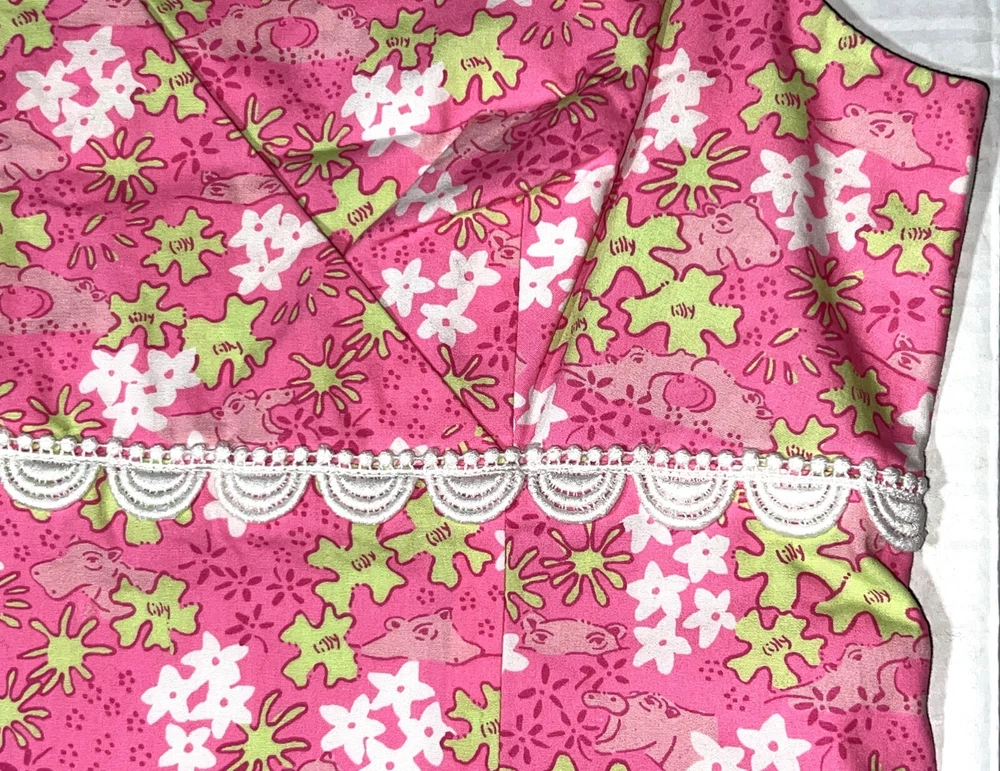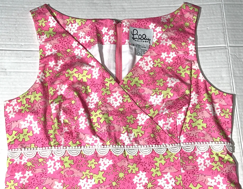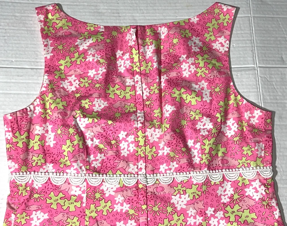 Vintage Lilly Pulitzer Happy Hippos Pink White Green Lace V-Neck Sleeveless Shift Summer Dress ~ Women's Size 8. Measures: 18" flat across the front from underarm to underarm unstretched and 37" from shoulder to bottom hem.